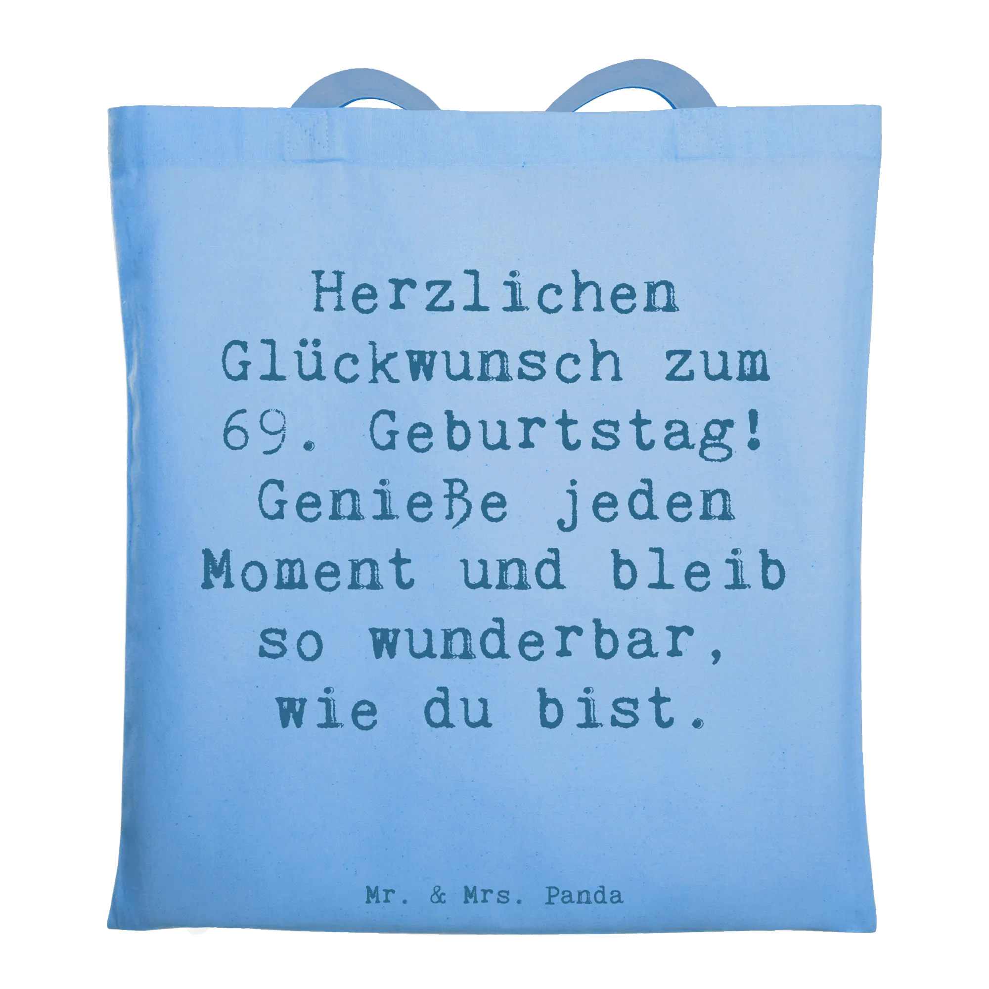 Design mit Herz: Die zarte Sky Blue Hintergrundfarbe wirkt beruhigend und frisch, das Motiv aus der Geburtstagskollektion „Geburtstag Alter“ wurde liebevoll von Mrs. Panda in Aquarell entworfen. Der Spruch ist warmherzig und persönlich – genau richtig, um einem Menschen zum 69. Geburtstag eine Freude zu machen.