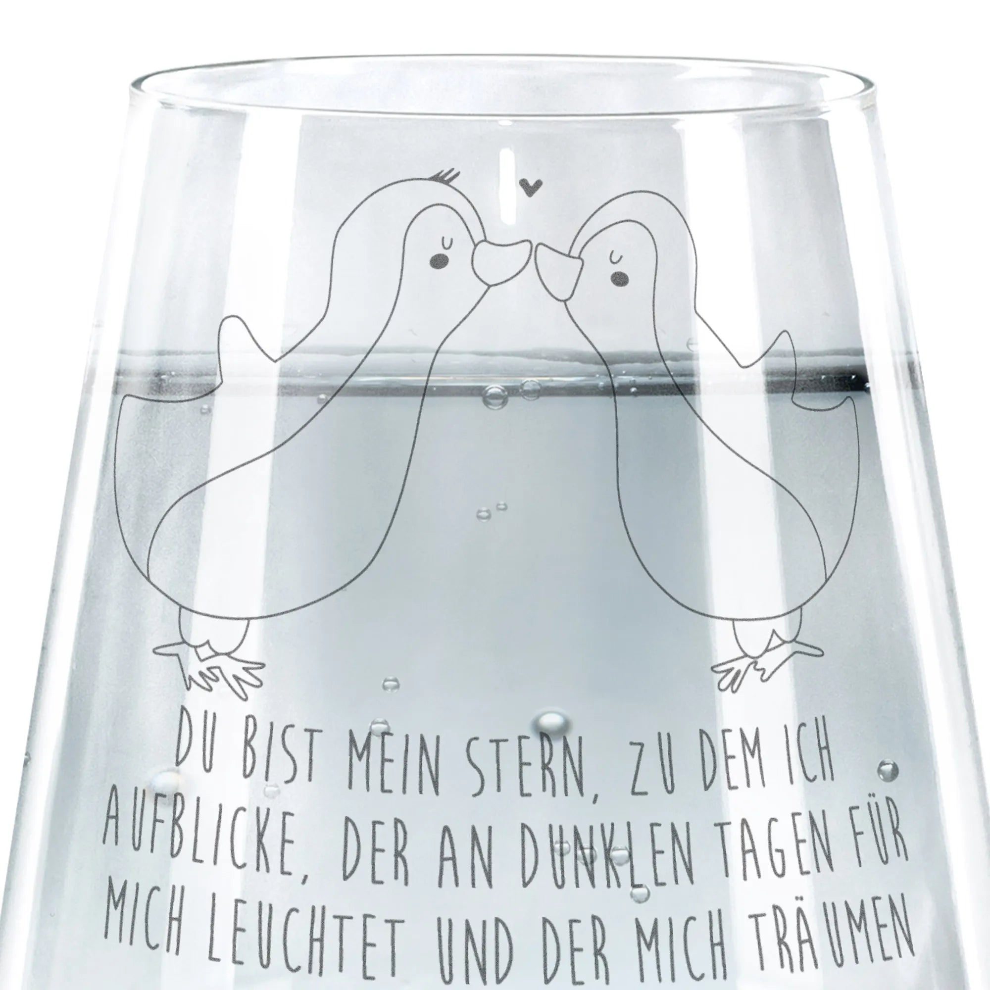 Das robuste Glas ist spülmaschinengeeignet und sorgt dafür, dass du lange Freude an diesem wunderschönen Stück hast. Die hochwertige Lasergravur verleiht dem Glas einen eleganten Matteffekt, der die süßen Pinguine und den romantischen Spruch perfekt zur Geltung bringt.