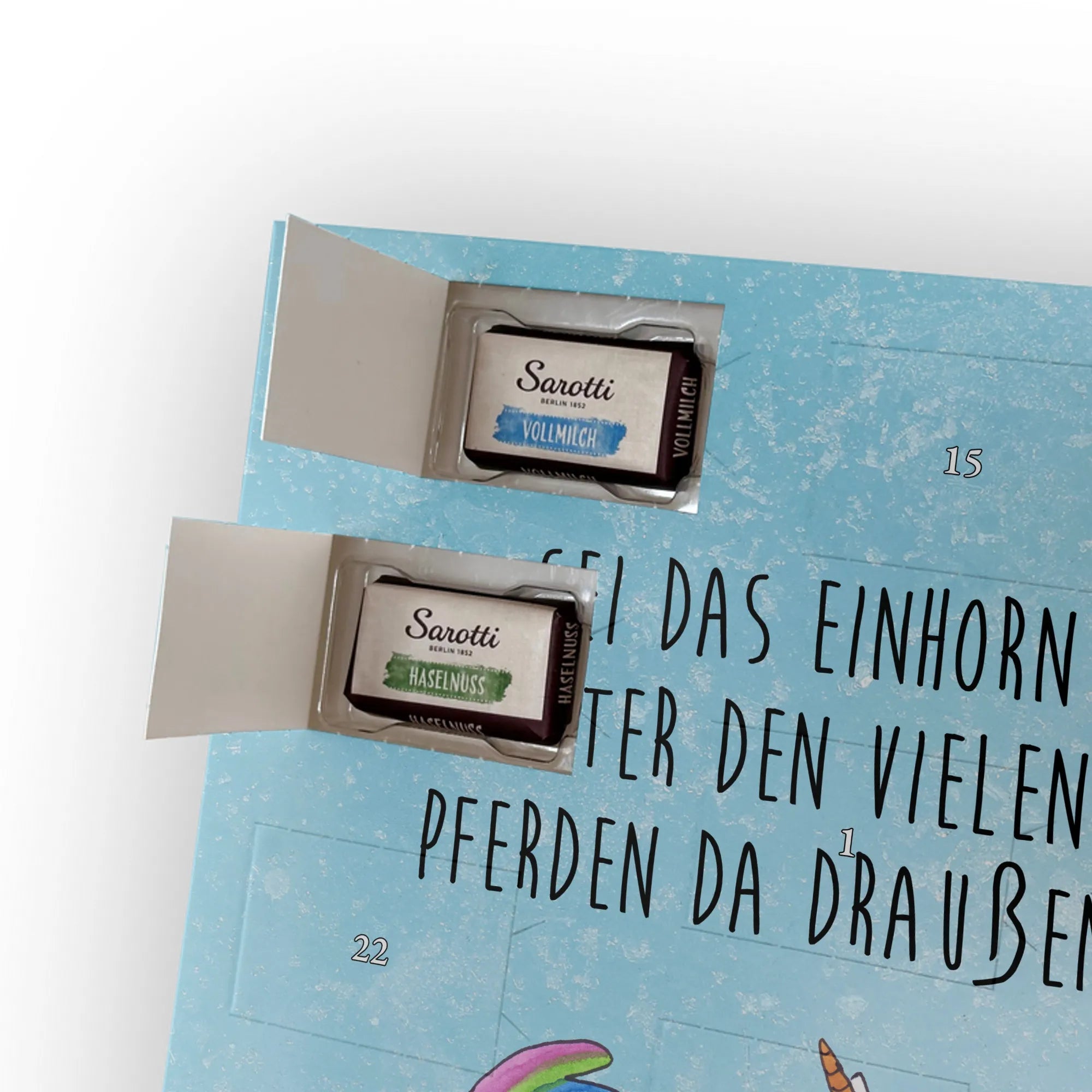 Mach die Adventszeit besonders persönlich mit unserem Foto Adventskalender mit Schokolade von Mr. & Mrs. Panda. Jeder Kalender ist mit niedlichen Motiven und herzlichen Sprüchen versehen, die perfekt zu einem individuellen Foto passen. Lade ein klares, hochauflösendes Bild hoch und überprüfe den Bildausschnitt, damit nichts Wichtiges abgeschnitten wird. Beachte bitte die Bildrechte – nur eigene Fotos oder solche mit Genehmigung verwenden. Die seidenmatte Oberflächenveredelung und der vollflächig bedruckte Look inklusive bedruckter Seitenflächen machen den Kalender zu einem Hingucker. Maße: 325 mm x 225 mm x 27 mm. Du erhältst 24 einzeln verpackte Schokoladen Mini Sticks in vier leckeren Geschmacksrichtungen: Karamell-Schokoladenkuchen, Kekse, Knuspriger Nougat und Erdbeer-Cheesecake. Gefüllt mit Lindt Hello Schokolade. Allergene: Milcheiweiß, Milchzucker, Soja, Weizen, Haselnüsse; kann Mandeln und weitere Schalenfrüchte enthalten. Besonderheit: Der Kalender kann aufgehängt oder aufgestellt werden. Hinweis: Fotos werden weder nachbearbeitet noch zugeschnitten – personalisierte Foto-Artikel sind vom Rückgaberecht ausgeschlossen. Verschenke süße Erinnerungen mit deinem eigenen Foto.