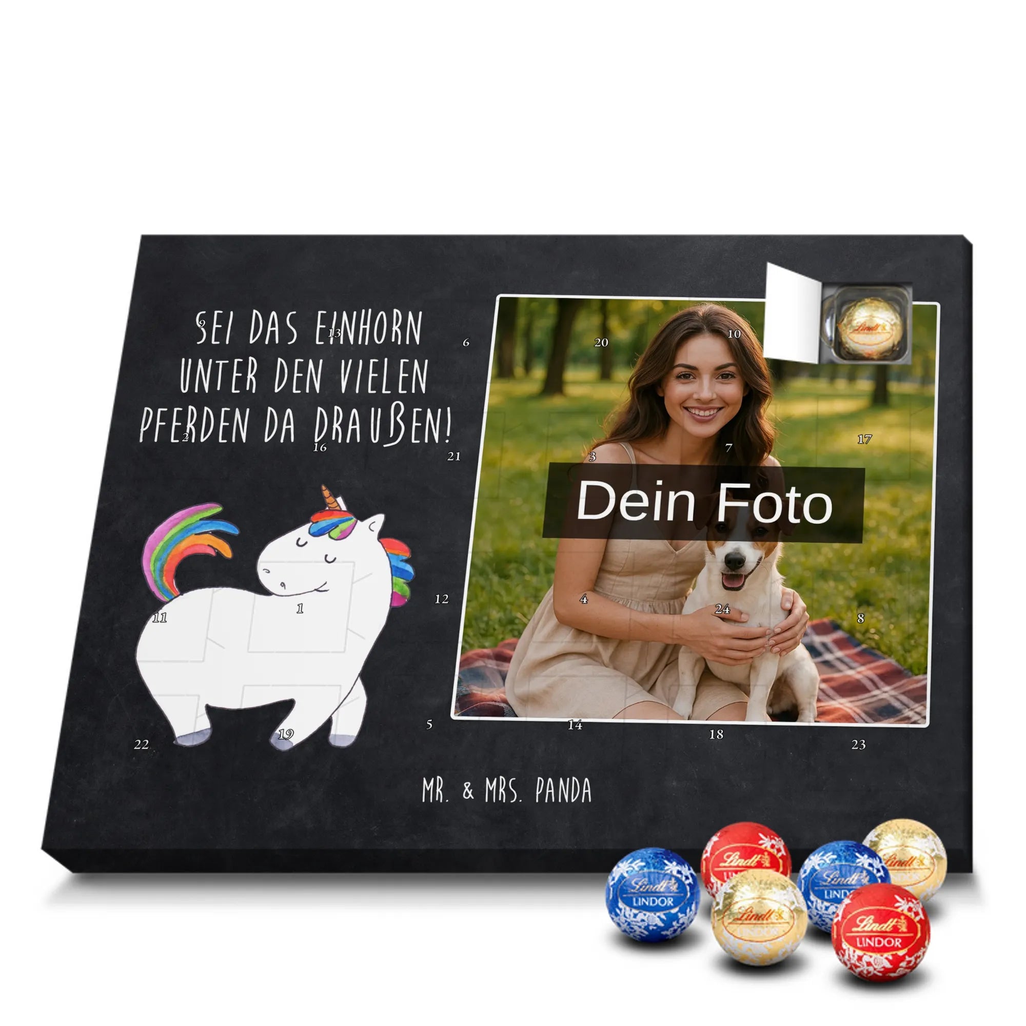 Mach die Adventszeit persönlich mit unserem Personalisiertes Schoko Foto-Adventskalender von Mr. & Mrs. Panda. Dieser Kalender kombiniert dein Lieblingsfoto mit unseren fröhlichen Illustrationen und liebevollen Sprüchen – perfekt als Geschenk für Partner, Familie oder Freunde. Für ein optimales Druckergebnis bitte ein hochauflösendes Bild verwenden und den Bildausschnitt so wählen, dass wichtige Details nicht verloren gehen. Beachte, dass wir Fotos nicht nachbearbeiten oder zuschneiden; lade nur Bilder hoch, für die du die Rechte besitzt. Die hochwertige Verarbeitung beinhaltet eine seidenmatte Oberflächenveredelung und bedruckte Seitenflächen, außerdem ist der Kalender robust und kann aufgehängt oder aufgestellt werden. Maße: 233 mm x 178 mm x 24 mm. Gefüllt mit Lindt Lindor Markenschokolade: 24 einzeln verpackte Kugeln in den Sorten Vollmilch, Feinherb und Weiße Schokolade. Inhaltsstoffe und Allergene sind angegeben; es kann Haselnüsse und Mandeln enthalten. Hinweis: Personalisierte Foto-Artikel sind vom Umtausch ausgeschlossen. Ein süßer, persönlicher Adventsgruß von Mr. & Mrs. Panda.