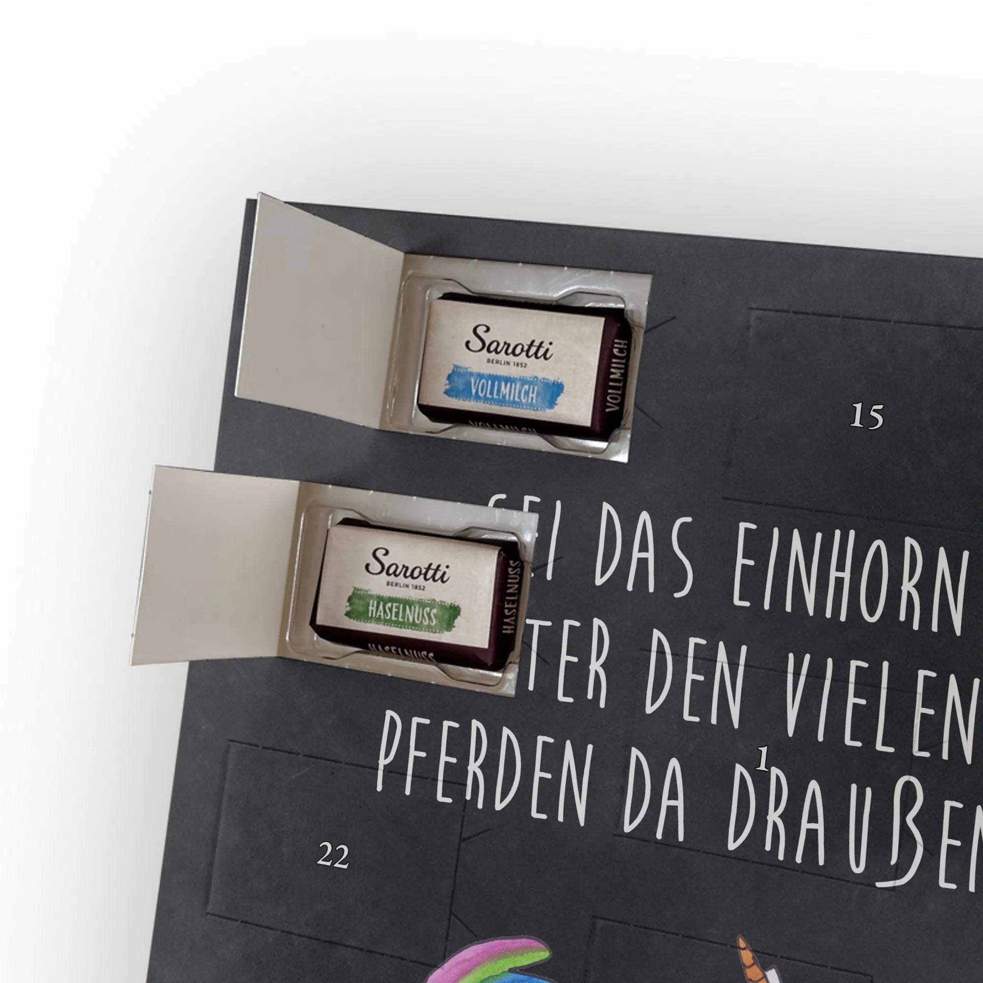 🐼 LECKERE FÜLLUNG: 24 Täfelchen, 107 g Markenschokolade (Sarotti® & Confiserie Heidel®) in vier Sorten.