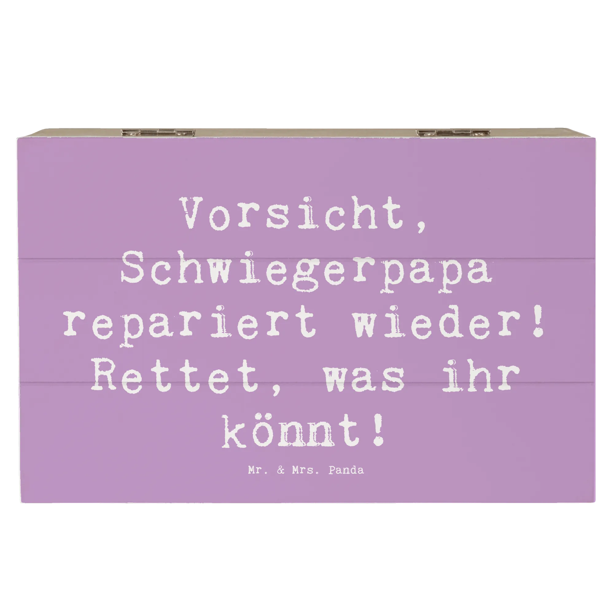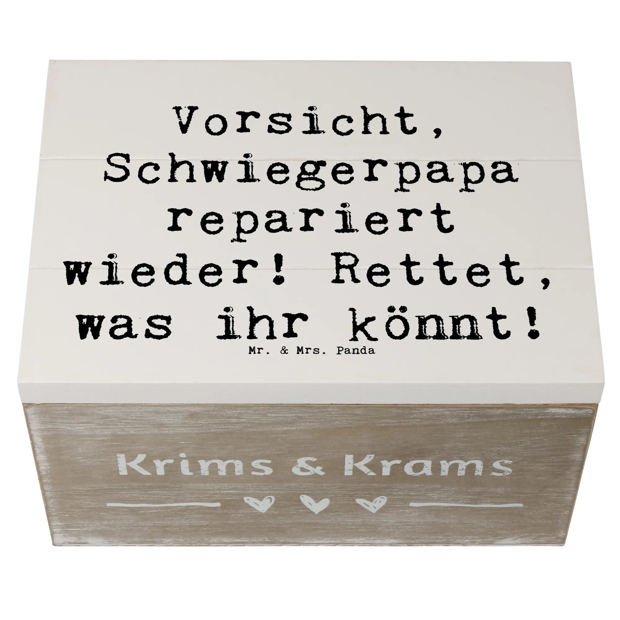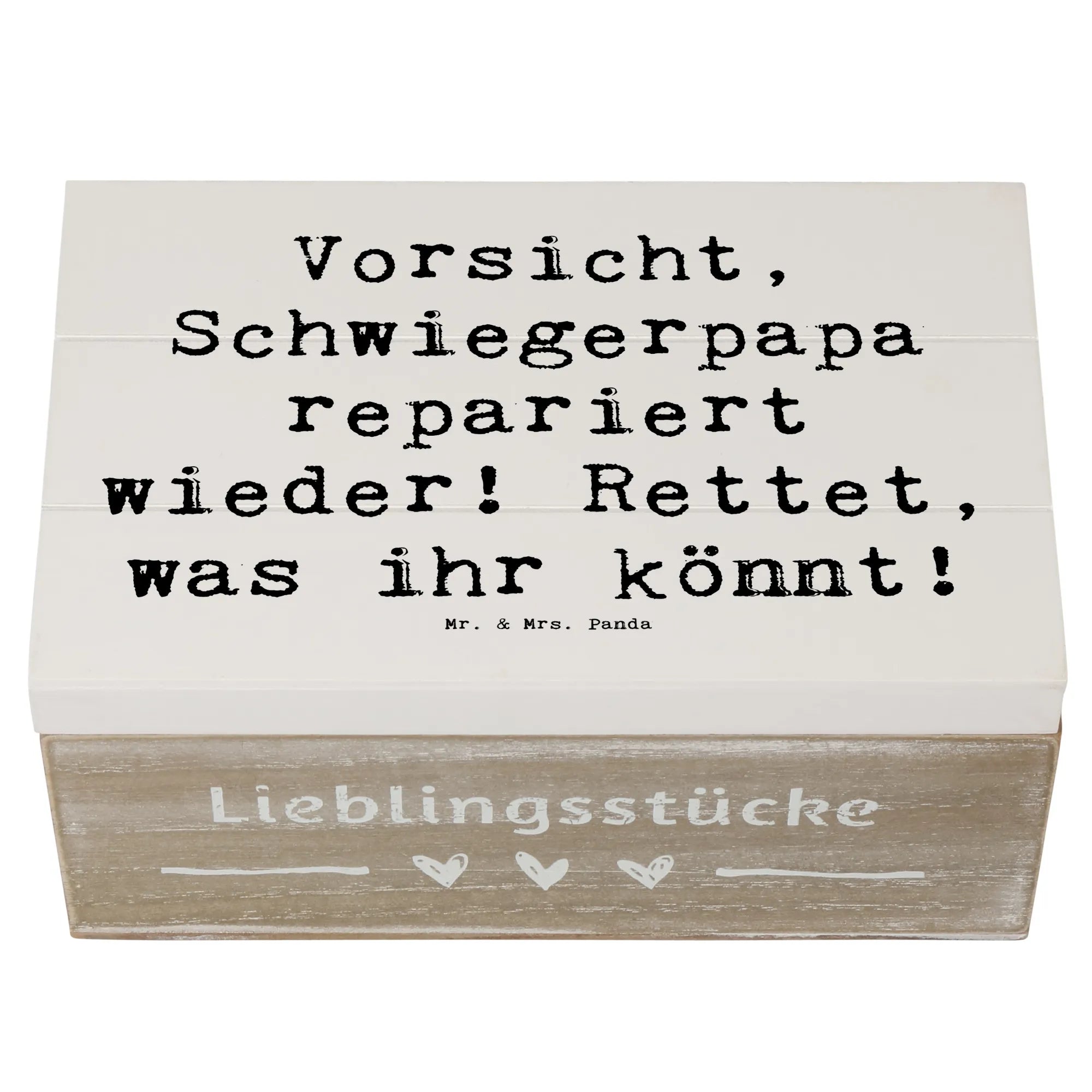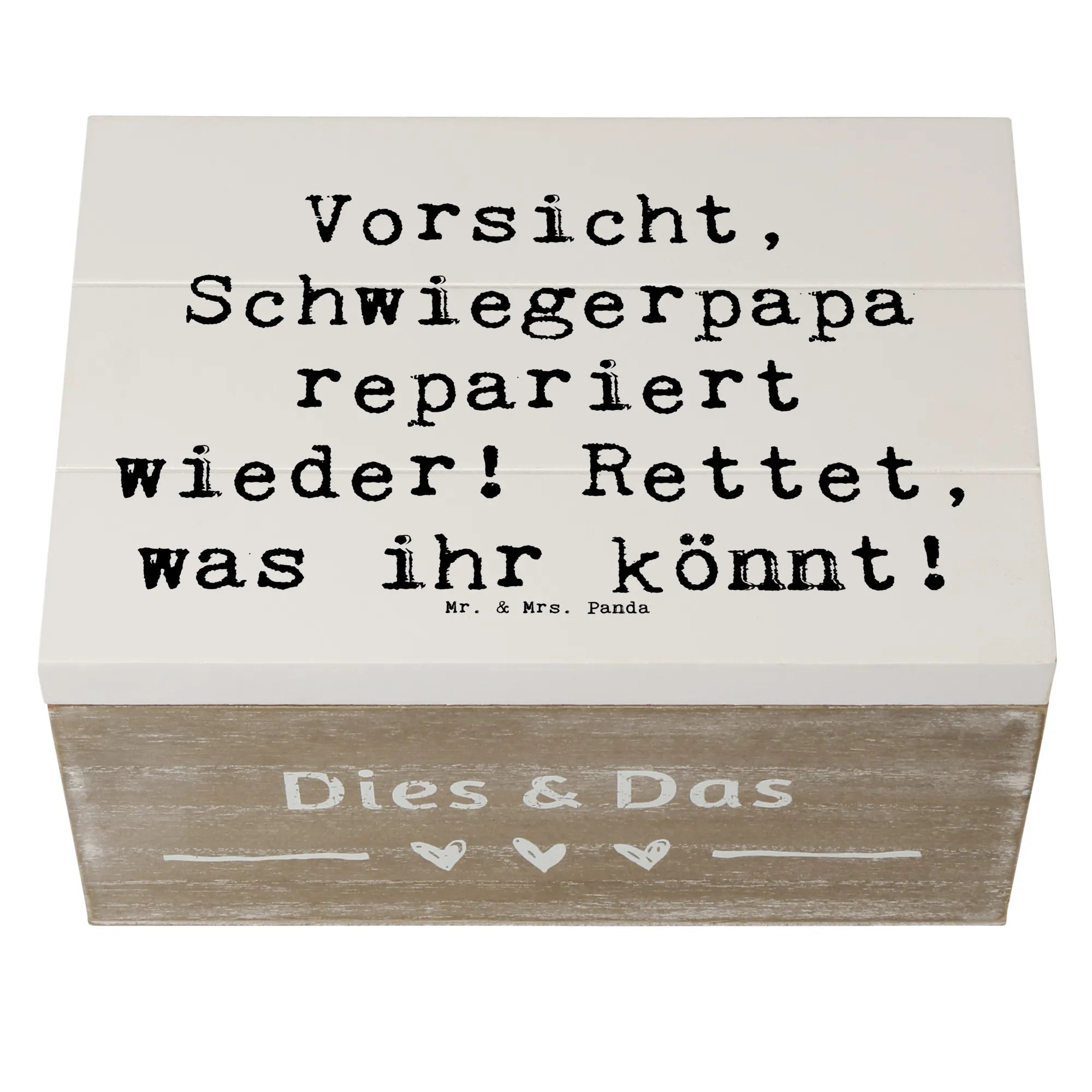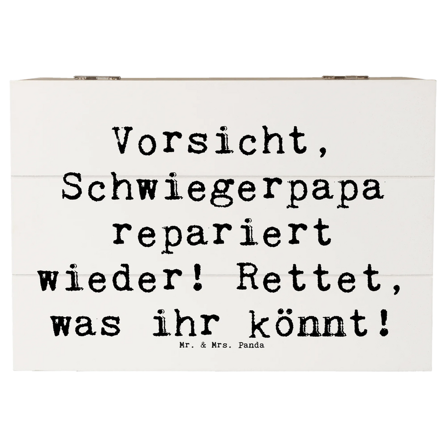 Wooden chest Saying Vorsicht, Schwiegerpapa repariert wieder! Rettet, was ihr könnt! - 22 x 15 cm - White