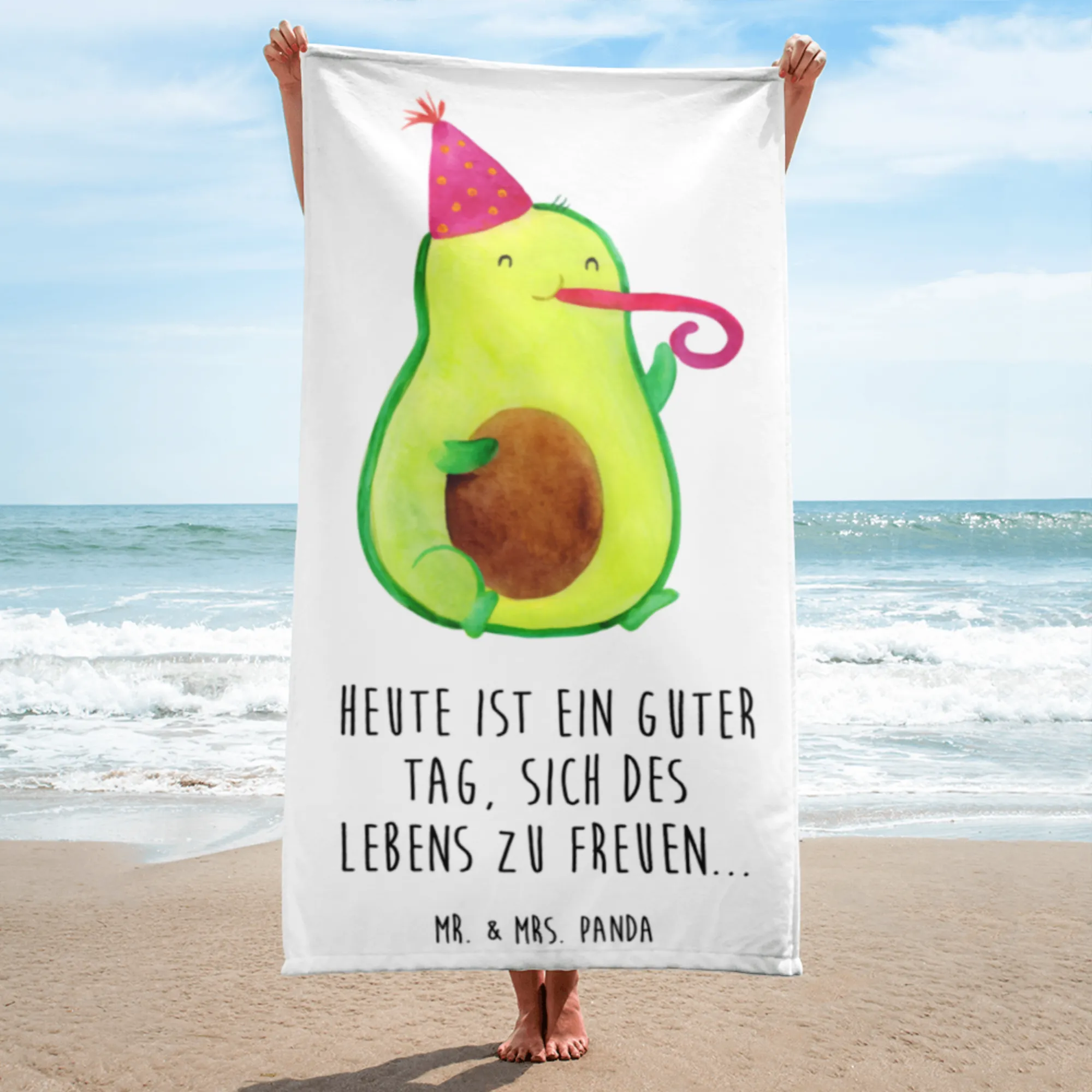 Introducing the XL Avocado Party Horn Bath Towel from Mr. & Mrs. Panda! This extra-large towel is the ultimate companion for your beach days, poolside relaxation, or spa visits!