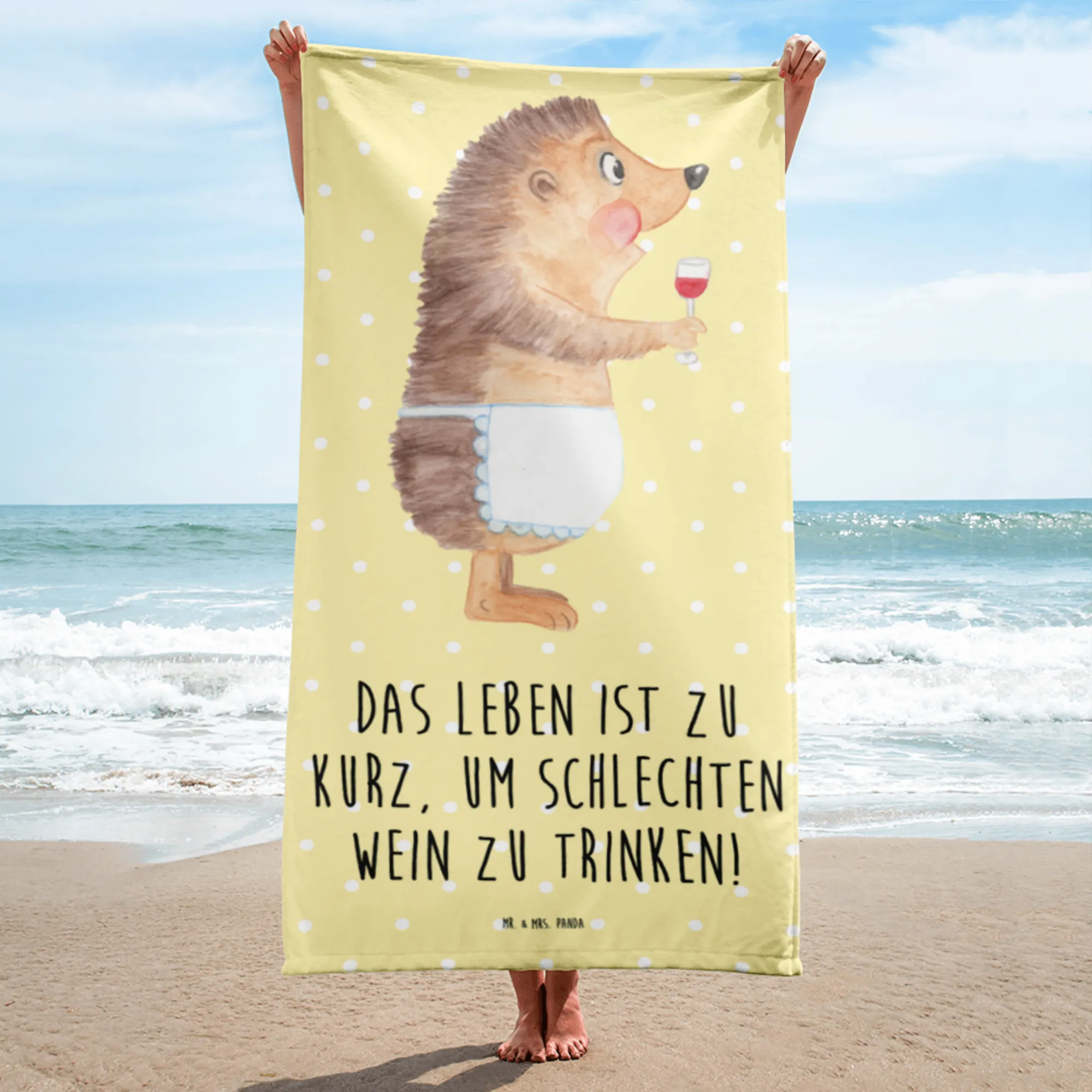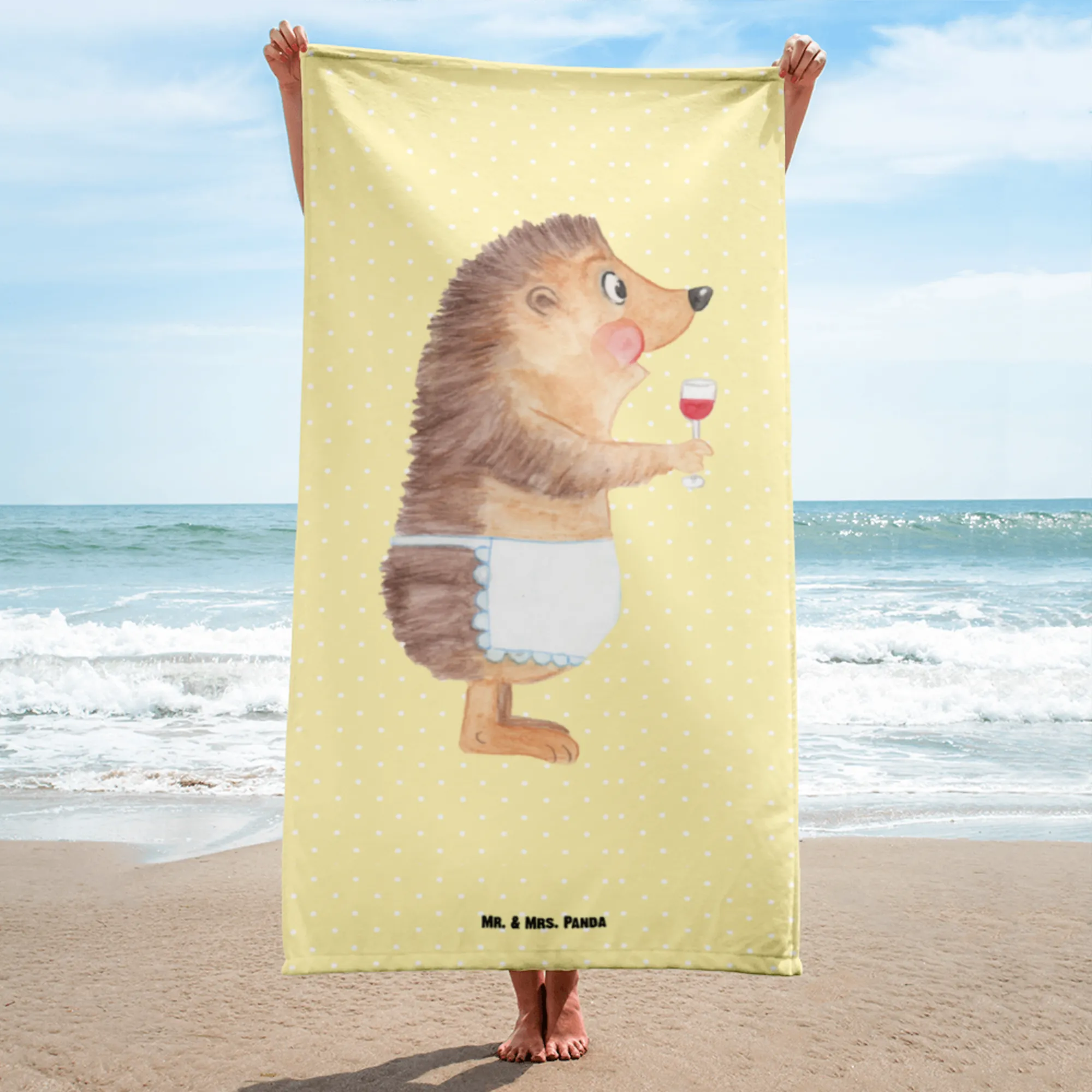 Introducing the delightful Mr. & Mrs. Panda XL Bath Towel, featuring a charming hedgehog enjoying a glass of wine! This towel is the epitome of cuteness and functionality, making it the perfect gift for wine lovers and animal enthusiasts. Measuring 1520 mm x 760 mm, this oversized towel offers plenty of space for lounging at the beach, pool, or even in the sauna!