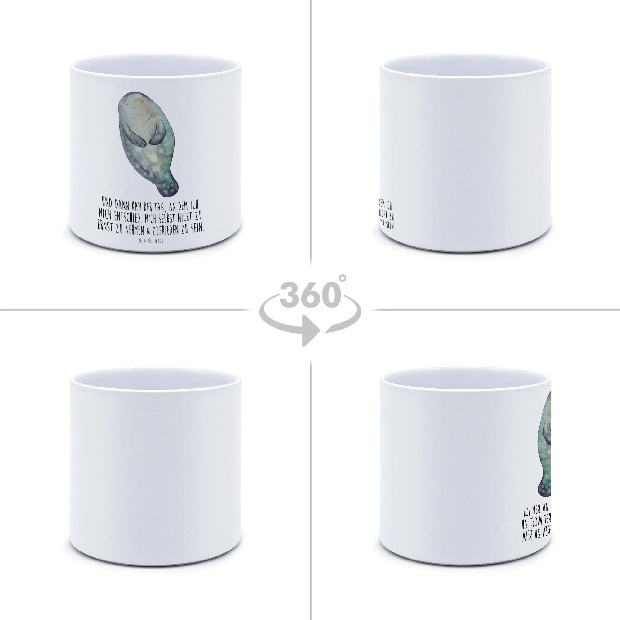 Say hello to our friendly manatee! With its lovely smile and soothing colors, this motif captivates a sense of calm and contentment. It's a gentle reminder that self-love and satisfaction go hand in hand, just like the lovely blues and greens in the ocean. By embracing our true selves and not taking life too seriously, we can enjoy new beginnings. The mantra reads, 'Und dann kam der Tag, an dem ich mich selbst nicht zu ernst zu nehmen & zufrieden zu sein,' and it encourages us to approach each day with a smile and an open heart while paying attention to what brings us joy.