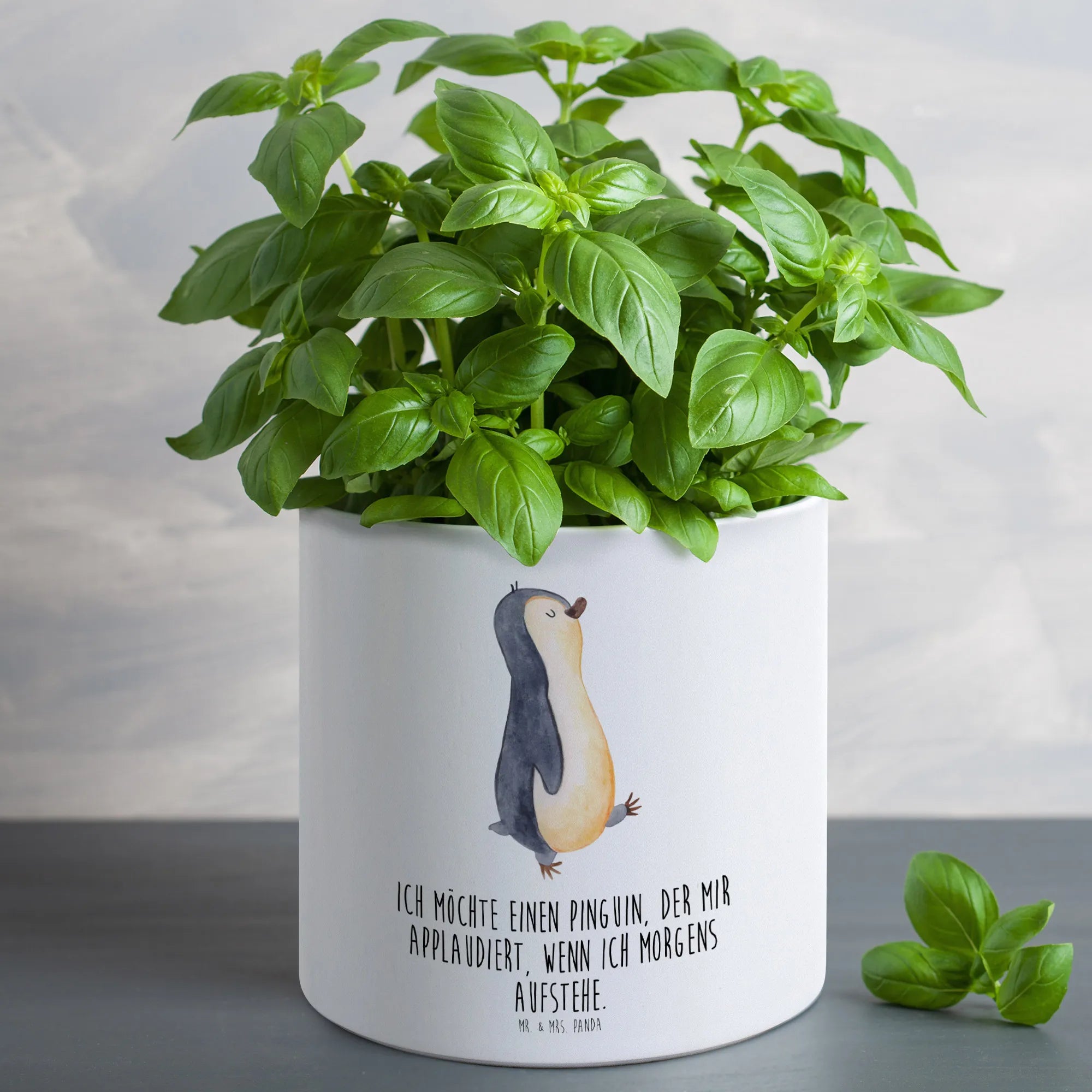 Measuring at a generous size, it's ideal for all kinds of plants, including impressive flowers or your favorite herbs. This splendid ceramic pot is designed with a heartwarming motif of a penguin proudly marching. It perfectly captures the spirit of early risers who greet the day with enthusiasm, and it embraces the charm of those who may take their time getting up. Whether you place it on your balcony, terrace, garden, or windowsill, this adorably painted flower pot radiates joy.