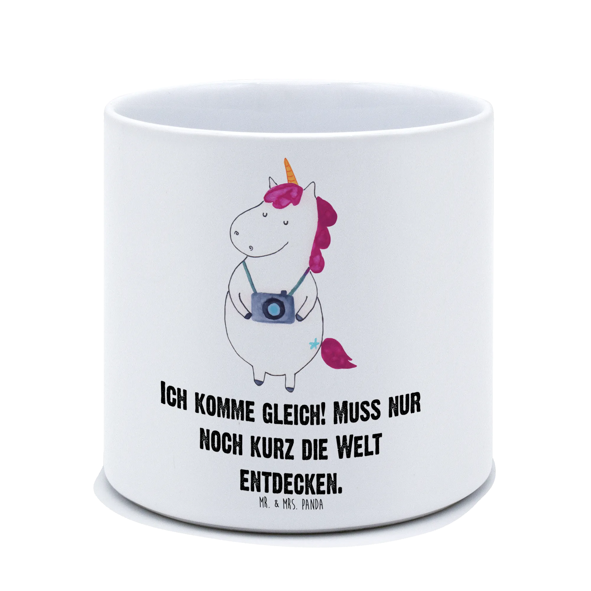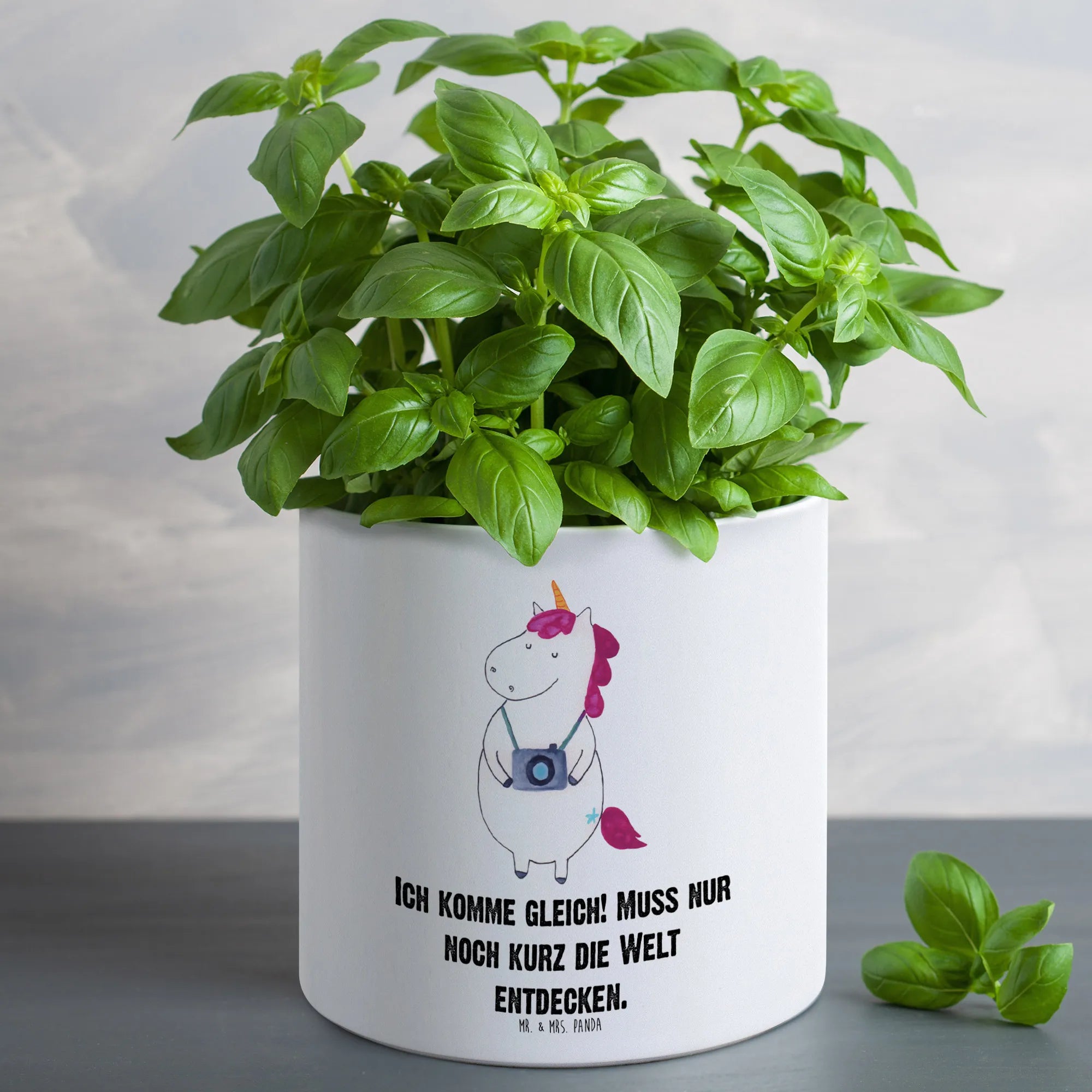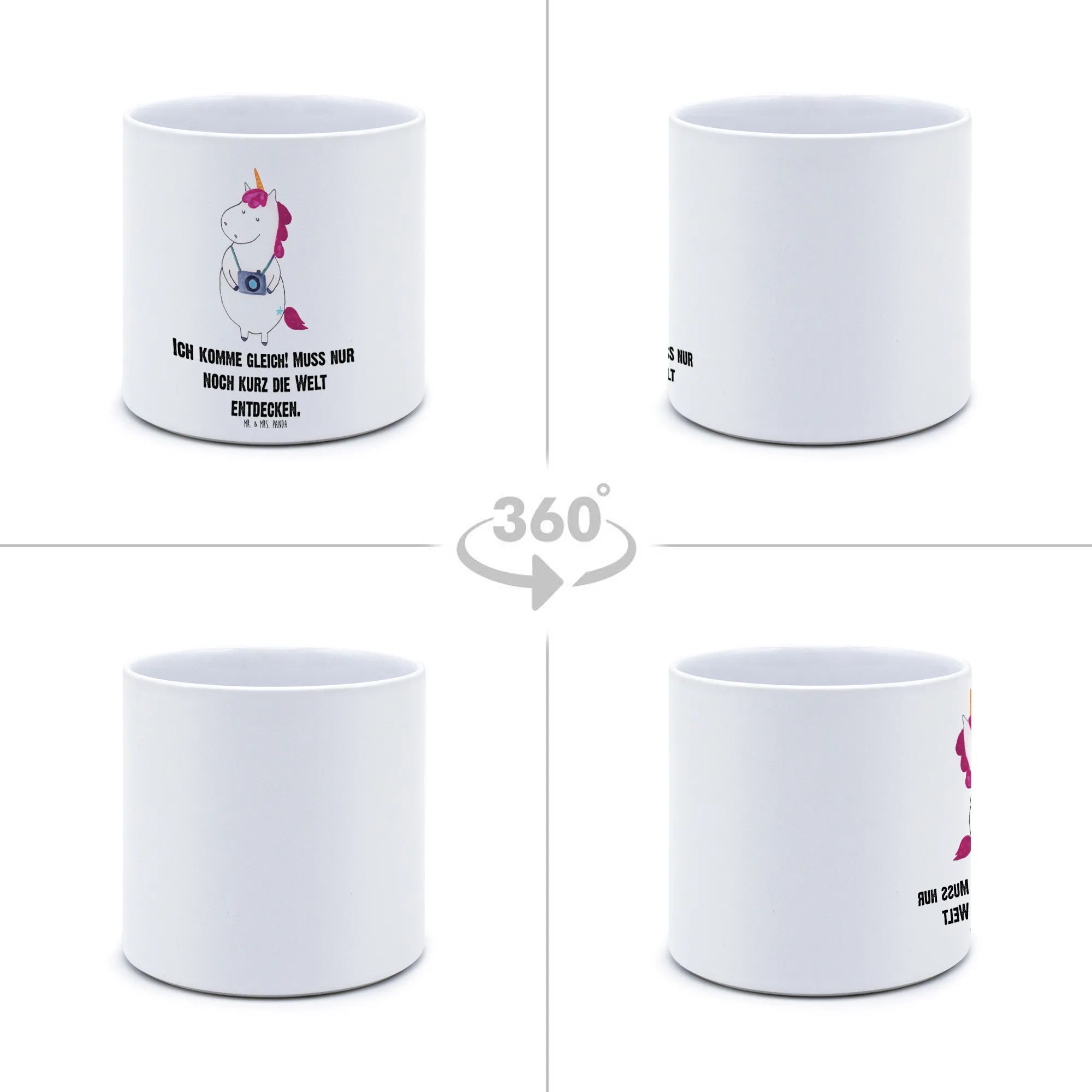 Perfect for friends or family members who are passionate about photography, the Unicorn Photographer pot is a superb gift for occasions like birthdays, housewarmings, or even a thoughtful surprise for a traveler setting off on new adventures. The playful slogan "Ich komme gleich! Muss nur noch kurz die Welt entdecken" beautifully encapsulates the wanderlust spirit and is a delightful addition to the pot’s appeal. Although it's designed without the slogan for a more classic look, this pot can still carry a sense of joy and magic wherever it is placed.