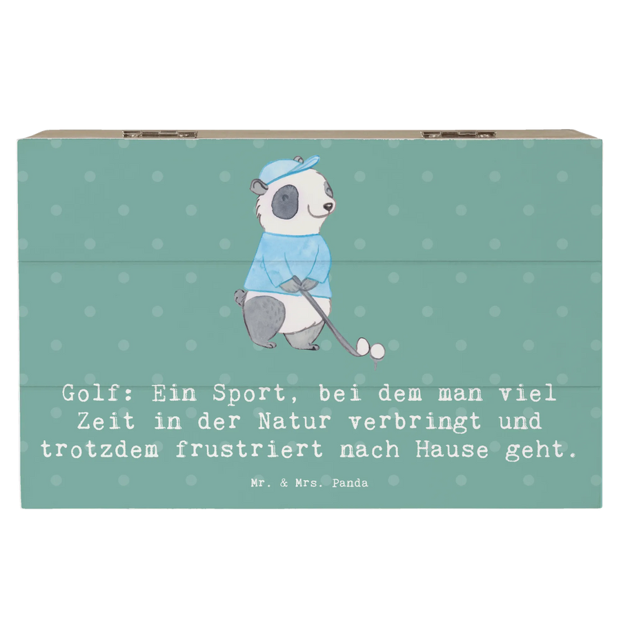 Eine wunderschöne Holzkiste für Golf-Fans: Diese Holzkiste von Mr. & Mrs. Panda trägt das liebevoll illustrierte Golf-Motiv und den frechen Spruch: „Golf: Ein Sport, bei dem man viel Zeit in der Natur verbringt und trotzdem frustriert nach Hause geht.“ Sie ist das perfekte Geschenk für alle, die den Golfsport lieben oder einfach gern stilvoll aufbewahren.