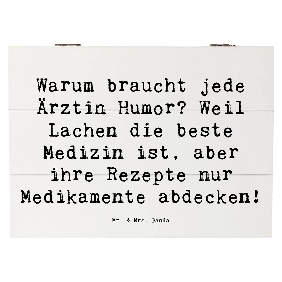 Diese wunderschöne Holzkiste von Mr. & Mrs. Panda ist das perfekte Geschenk für jede Ärztin. Mit dem liebevollen Motto "Warum braucht jede Ärztin Humor? Weil Lachen die beste Medizin ist, aber ihre Rezepte nur Medikamente abdecken!" wird sie in jedem Arztzimmer zum Highlight und sorgt für gute Laune.
