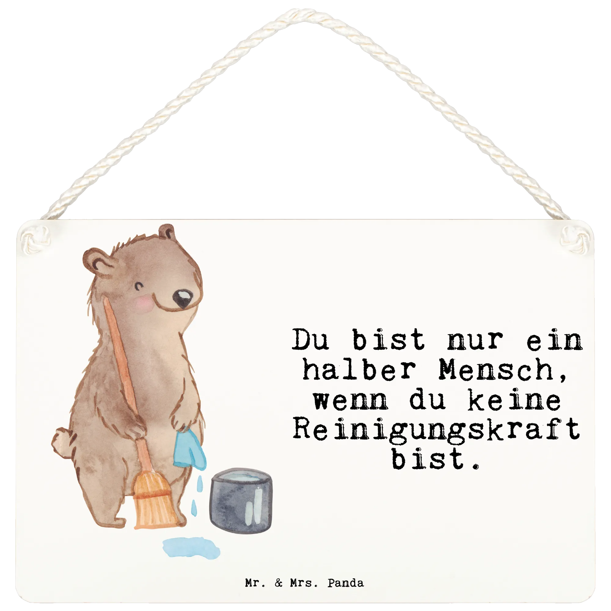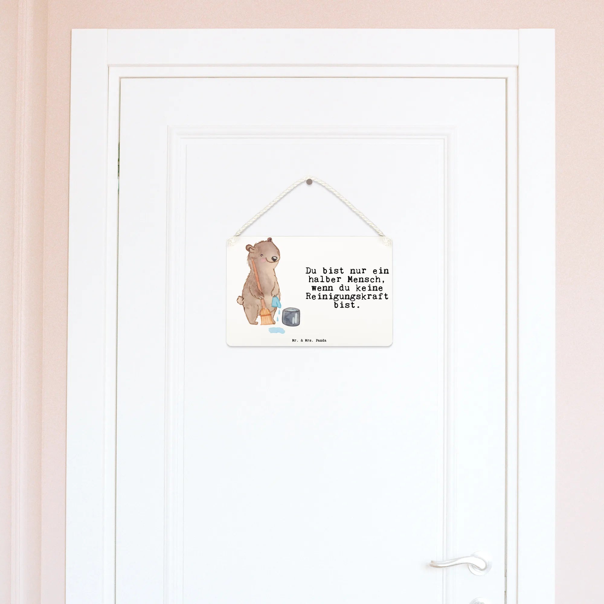 Das niedliche Design zeigt einen fröhlichen Bären, der den Boden wischt, und das witzige Sprichwort "Du bist nur ein halber Mensch, wenn du keine Reinigungskraft bist" bringt jedem ein Lächeln ins Gesicht. Das Schild misst DIN A6 und ist aus hochwertiger MDF-Material gefertigt, wodurch es langlebig und robust ist. Die beschichtete Oberfläche sorgt dafür, dass es auch nach langer Zeit noch gut aussieht.