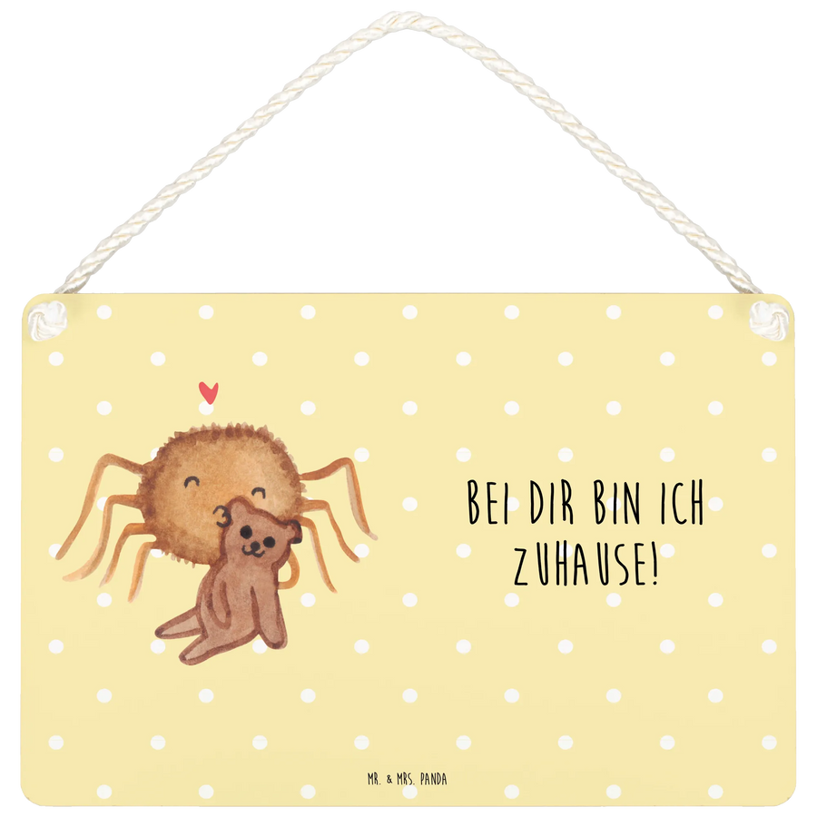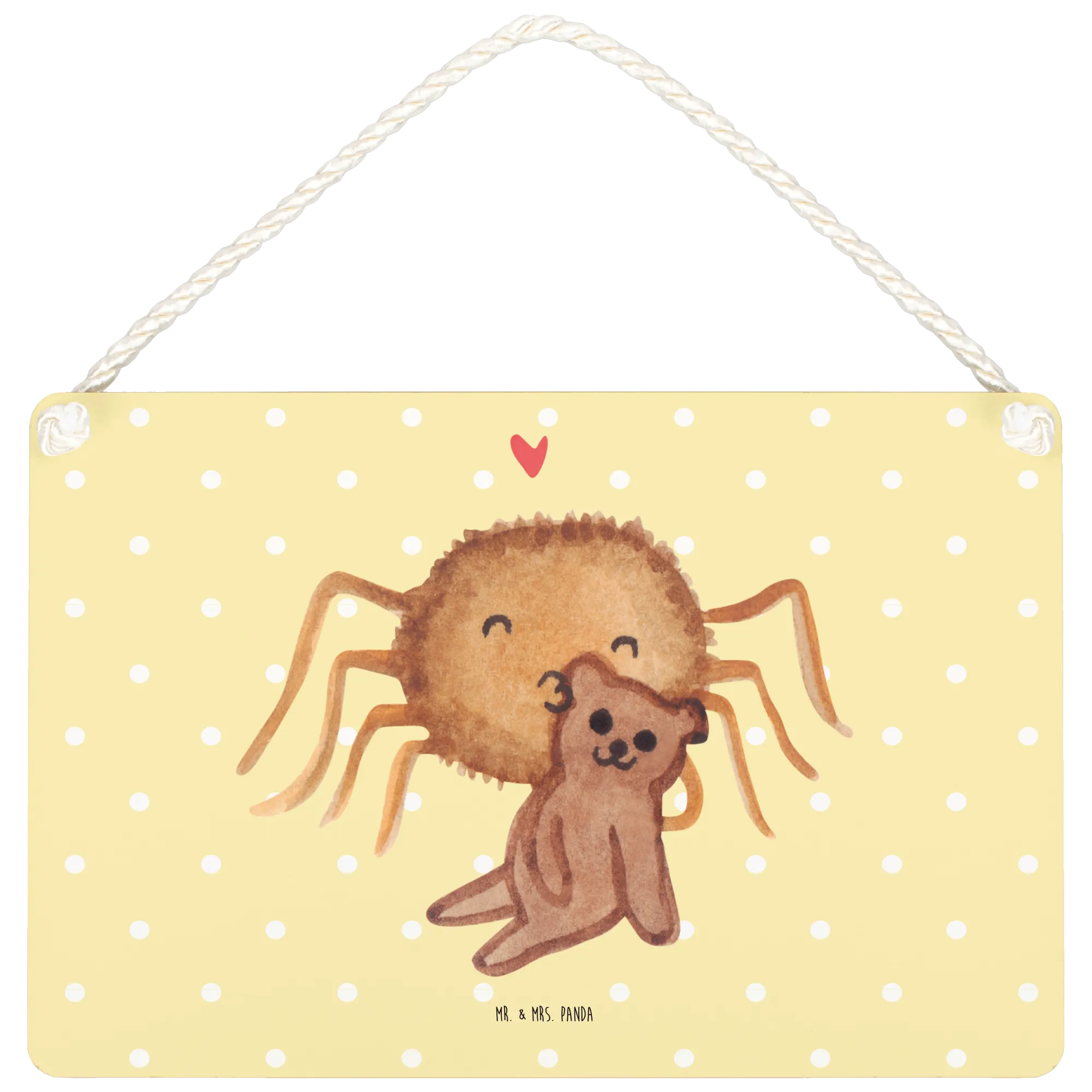 Das Deko Schild Spinne Agathe Teddy von Mr. & Mrs. Panda ist ein bezauberndes Stück, das jede Wand oder Tür in ein liebevolles Zuhause verwandelt. Mit einem warmen, pastellgelben Hintergrund und dem niedlichen Motiv der Spinne Agathe, die ihren kleinen Teddy mit leuchtenden Augen hält, bringt es Freude in jeden Raum.