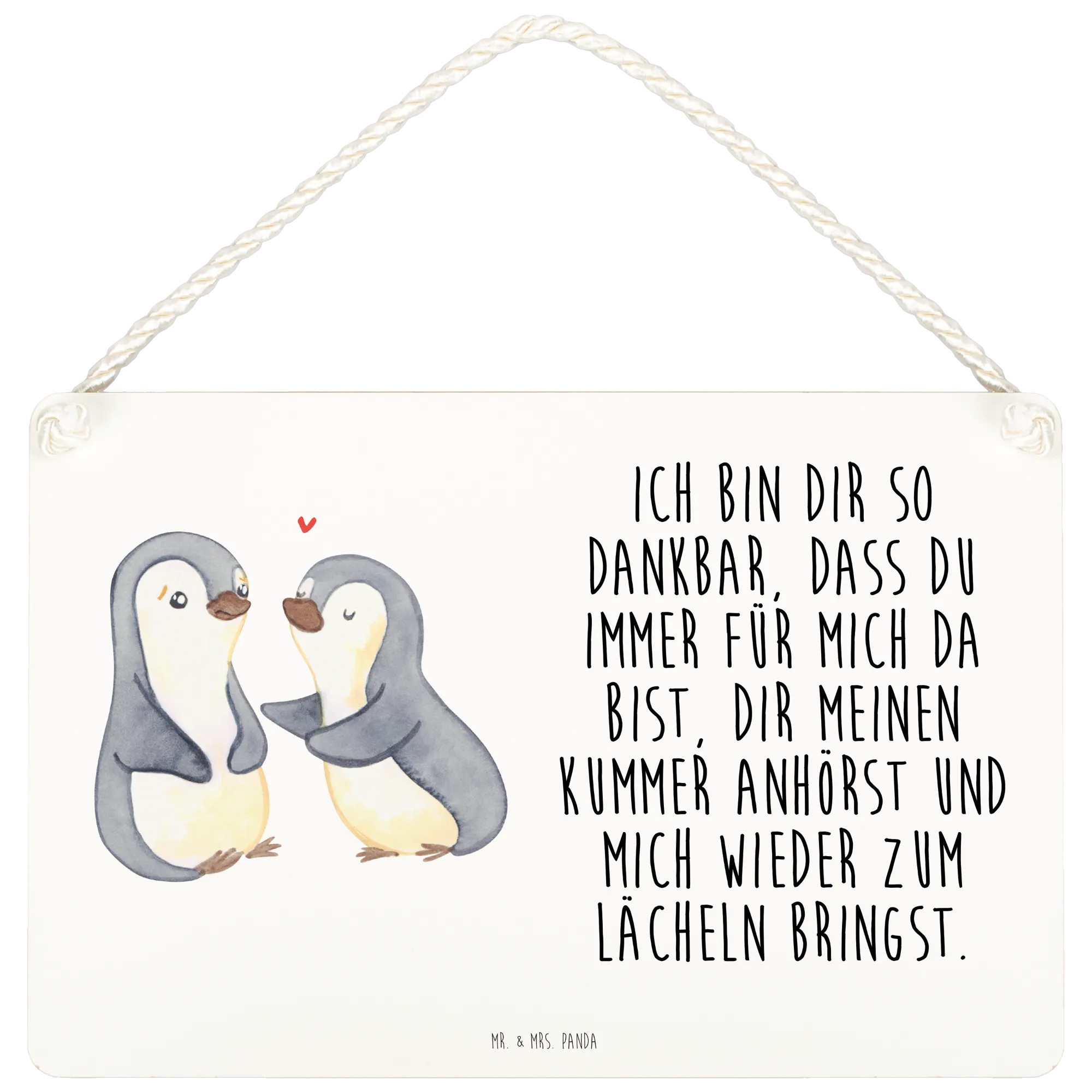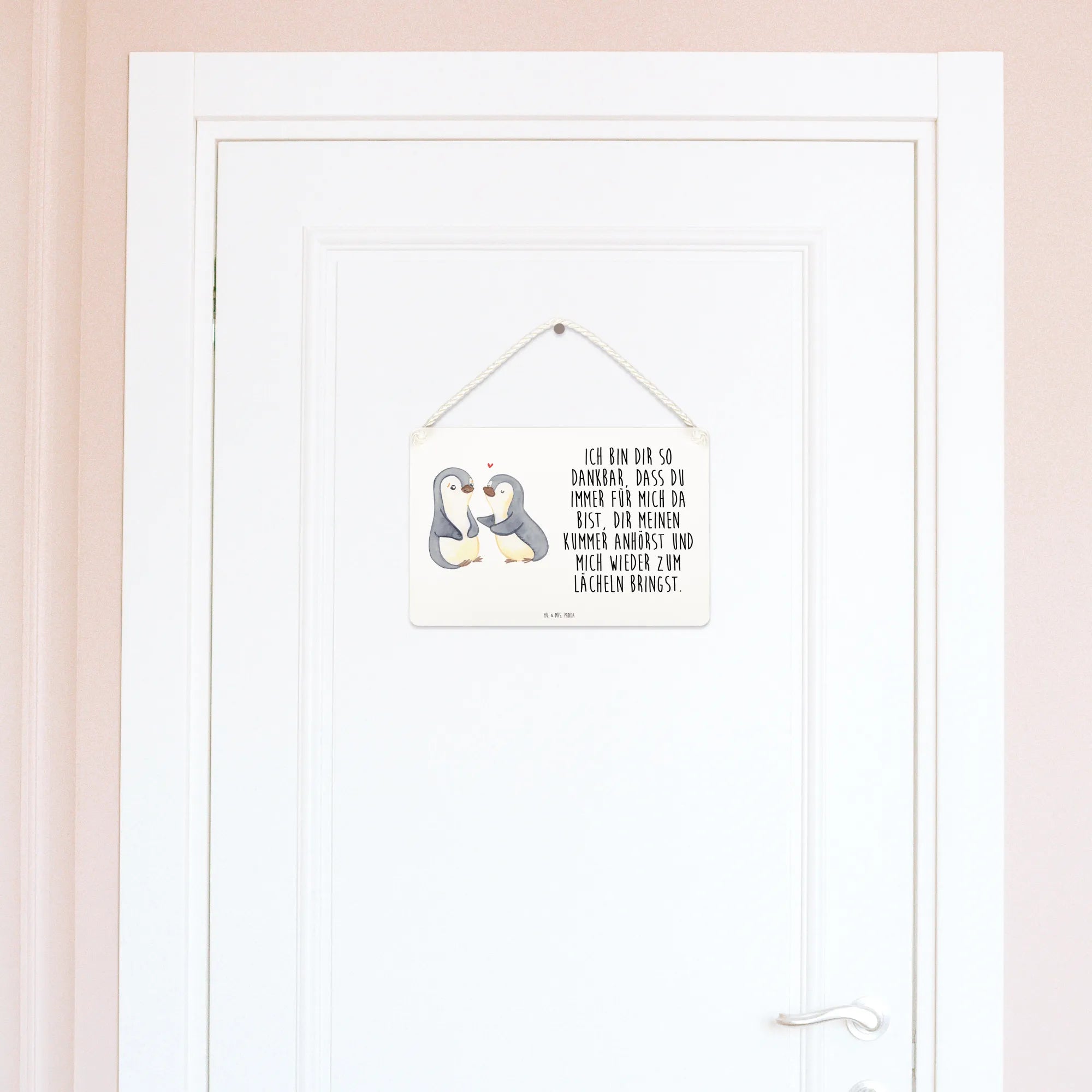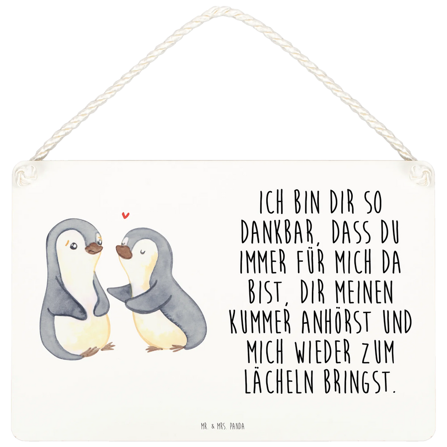 Auf dem Schild sind zwei niedliche Pinguine abgebildet, die sich zärtlich zuneigen – ein wahrer Ausdruck von Trost und Nähe. Die sanften Farben und der liebevolle Blick der Pinguine schaffen sofort eine warmherzige Atmosphäre in jedem Raum. Das Schild trägt außerdem den liebevollen Spruch: "Ich bin dir so dankbar, dass du immer für mich da bist, dir meinen Kummer anhörst und mich wieder zum Lächeln bringst." Ein wunderschönes Liebesgeschenk, das besonders für den Valentinstag, den Hochzeitstag oder als kleines Mitbringsel für deinen Partner geeignet ist.