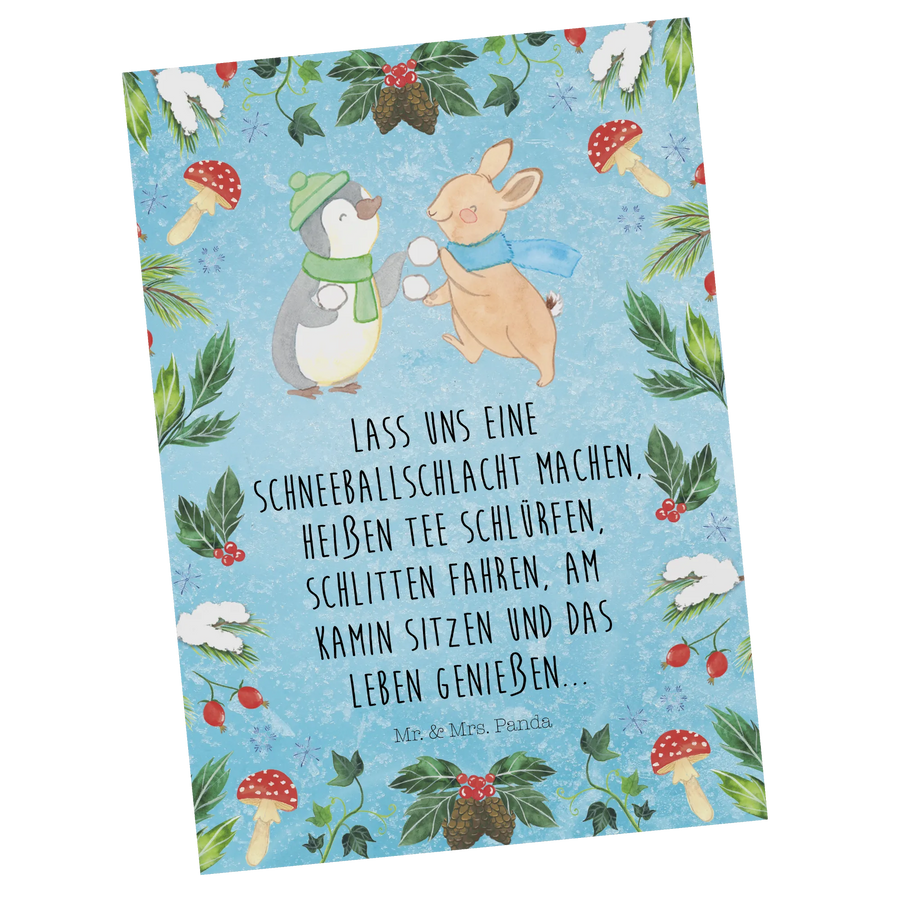Pocztówka Pingwin królik Bitwa na śnieżki - z napisem - lodowoniebieski
