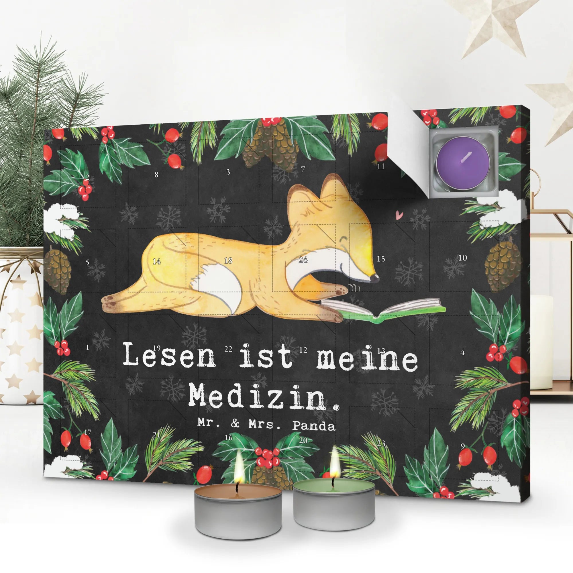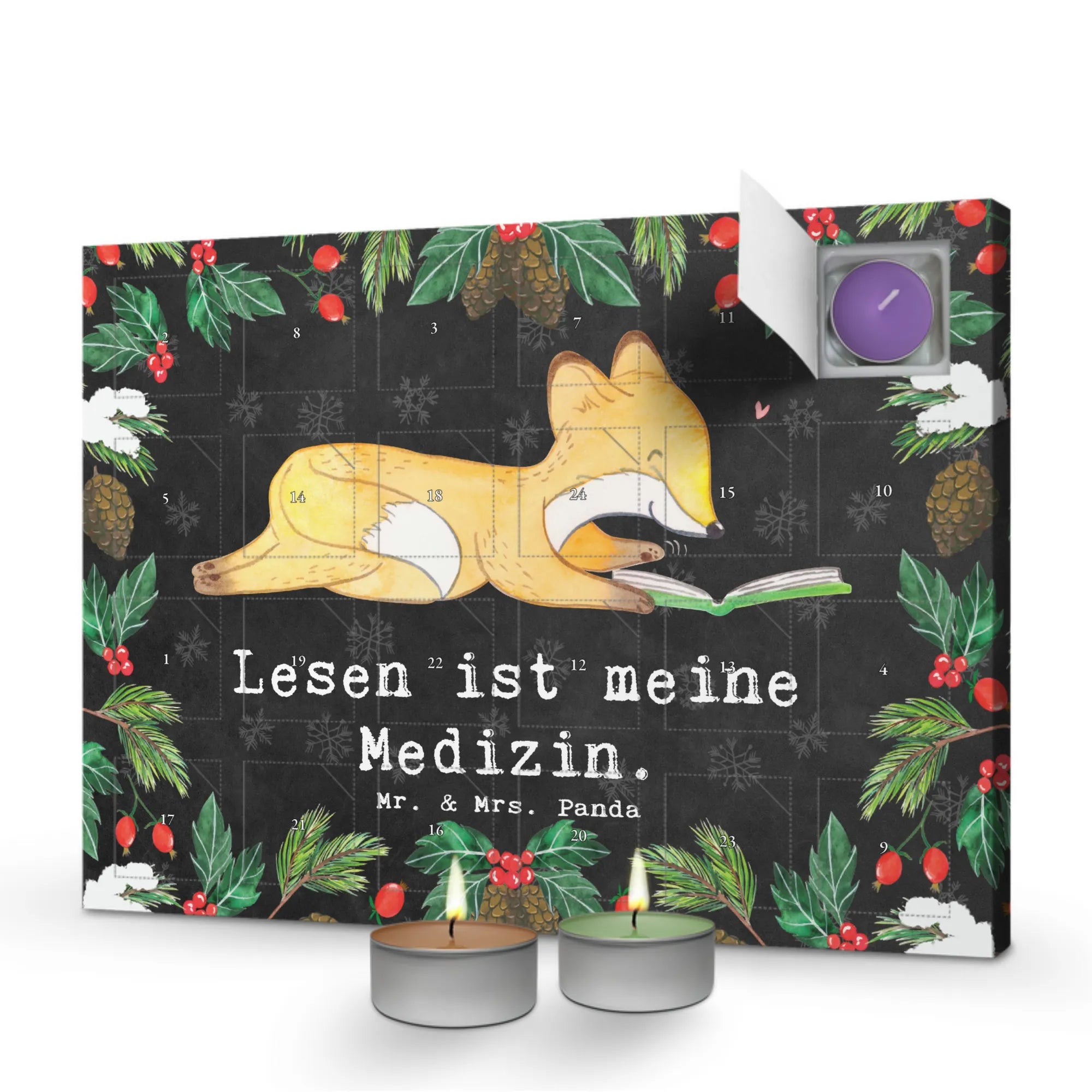 Der Duftkerzen Adventskalender Fuchs Lesen Medizin von Mr. & Mrs. Panda ist das perfekte Geschenk für alle Bücherliebhaber und Sportbegeisterte! Mit liebevollen Aquarellzeichnungen von Mrs. Panda und dem inspirierenden Slogan "Lesen ist meine Medizin" zaubert dieser Kalender eine gemütliche und festliche Atmosphäre in jeden Raum. Ob für den eigenen Gebrauch oder als Dankeschön für einen Freund – dieser Adventskalender wird garantiert ein Lächeln ins Gesicht zaubern!
