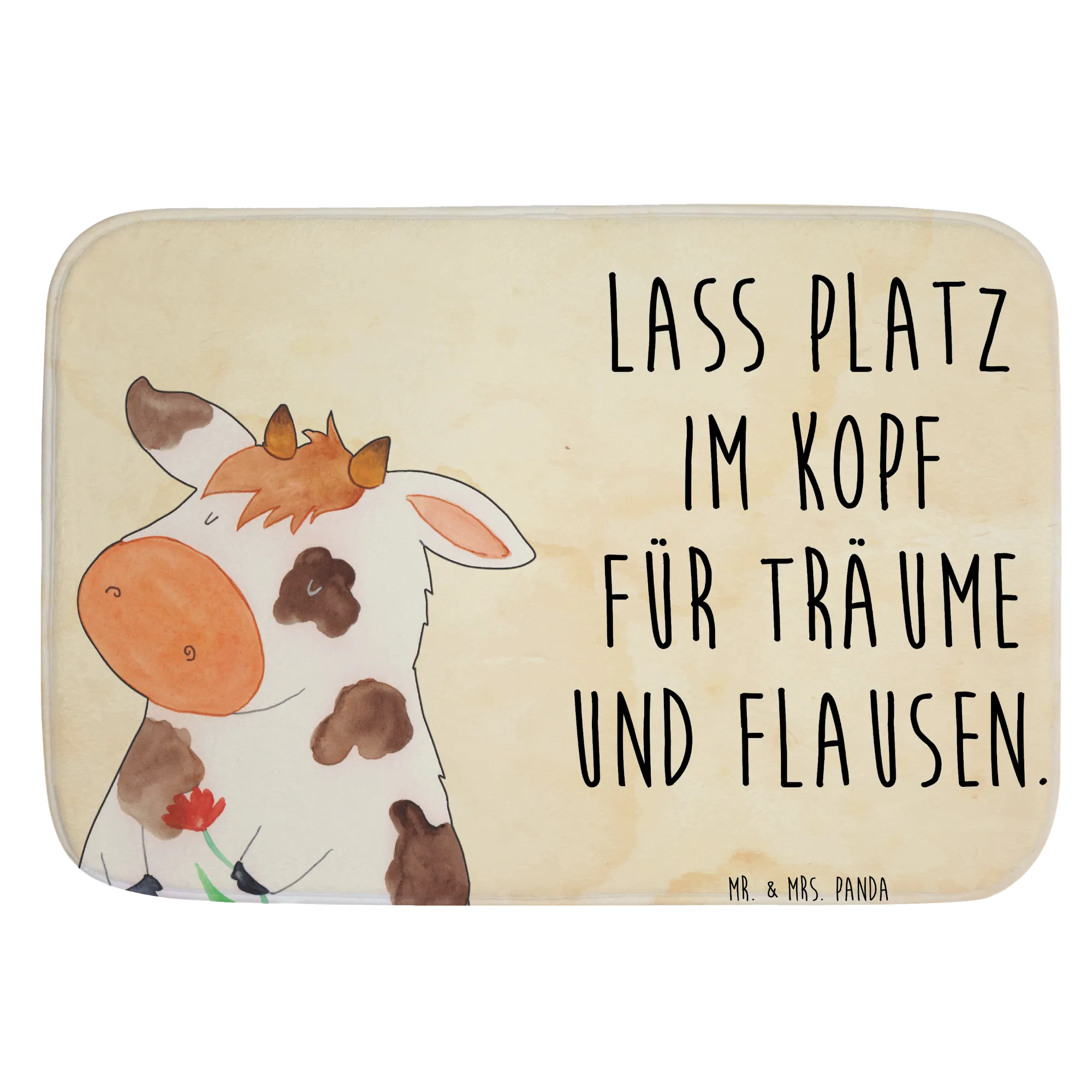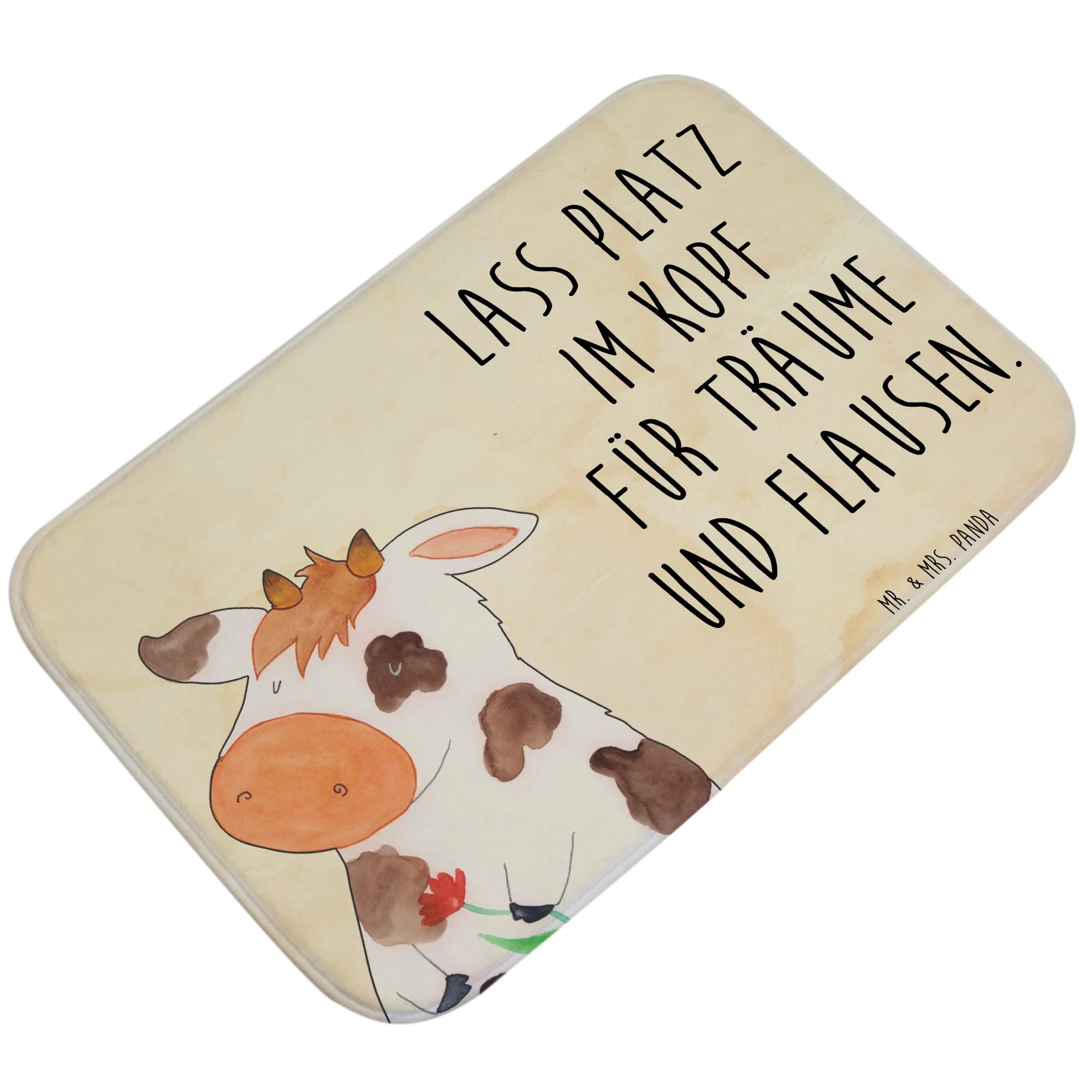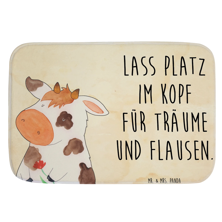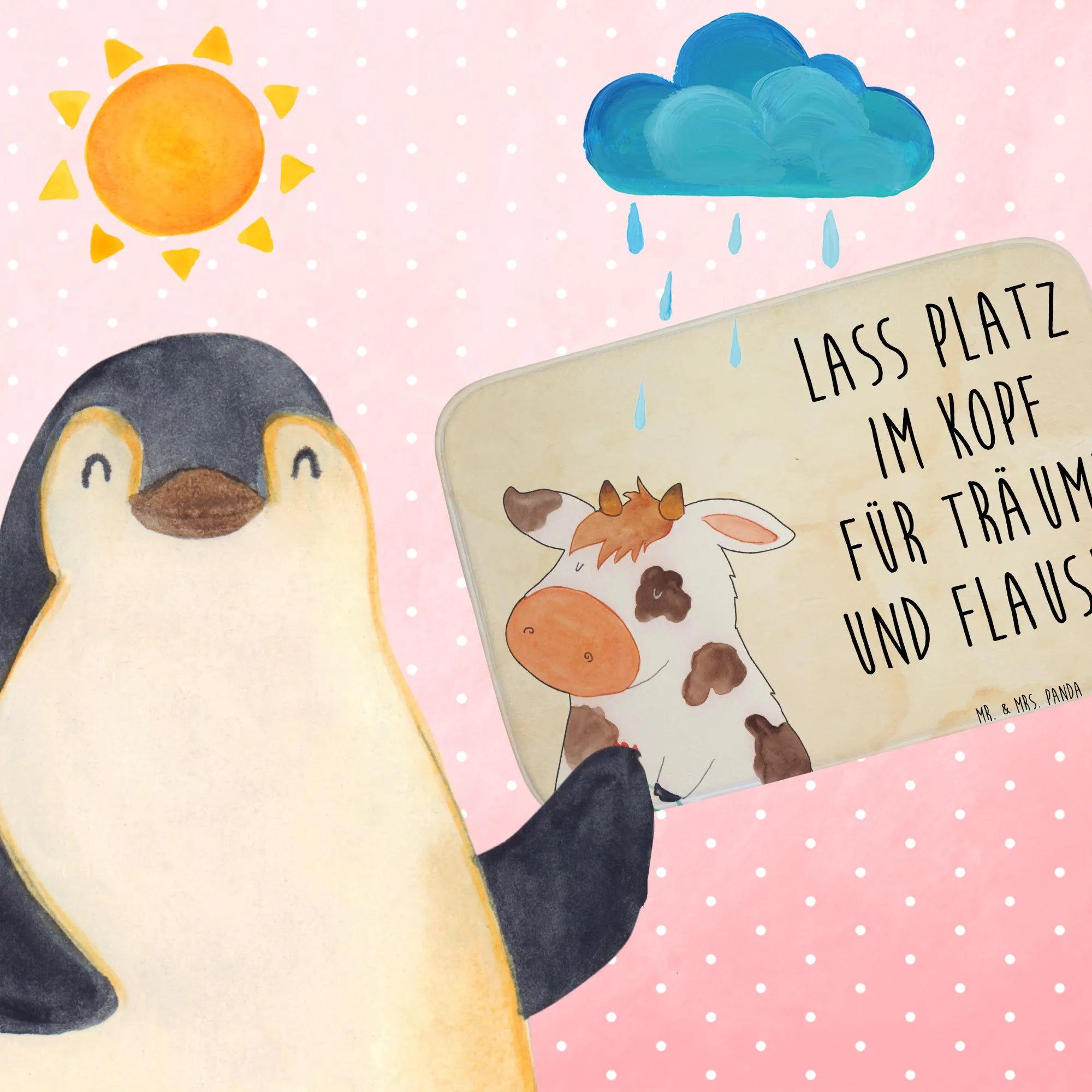 Sei es als Geschenk zur Einweihungsparty, für einen Geburtstag oder einfach, um dir selbst eine Freude zu machen – dieser Badvorleger ist ein tolles Präsent für alle, die das Besondere mögen. Das niedliche Kuh-Motiv bringt Schwung in dein Badezimmer und der Spruch „Lass Platz im Kopf für Träume und Flausen“ erinnert dich daran, das Leben leicht zu nehmen.