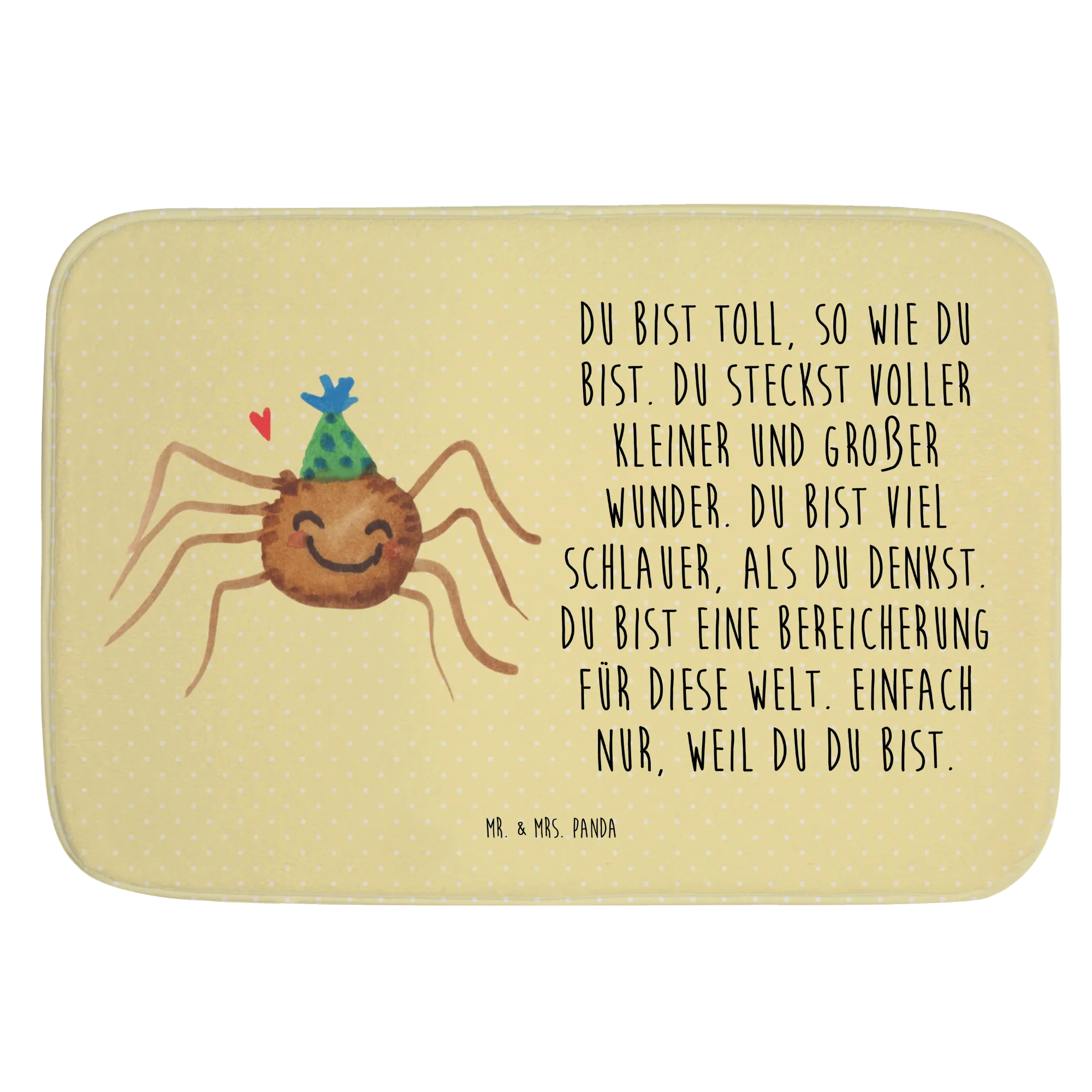 Der wunderschöne Badvorleger Spinne Agathe Party von Mr. & Mrs. Panda bringt Freude und Leben in Dein Badezimmer! Mit seinem farbenfrohen Design und dem feinen Spruch "Du bist toll, so wie du bist. Du steckst voller kleiner und großer Wunder. Du bist viel schlauer, als du denkst. Du bist eine Bereicherung für diese Welt. Einfach nur, weil du du bist." erinnert Dich dieser Badvorleger täglich an die Bedeutung von Selbstliebe und Glück. Die süße Spinne Agathe mit ihrem Partyhut strahlt Pure Freude aus und verwandelt Deinen Boden in ein wahres Schnäppchen für jeden Raum.