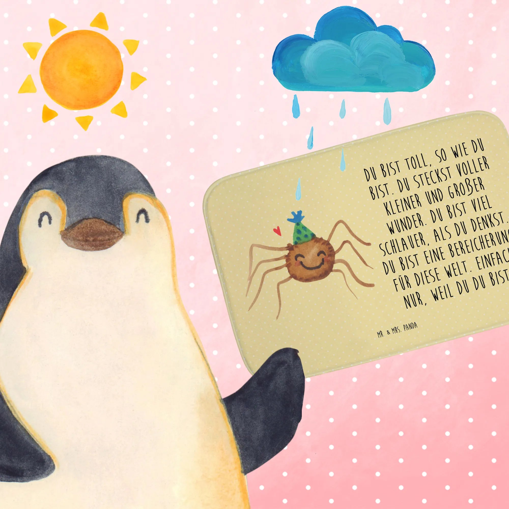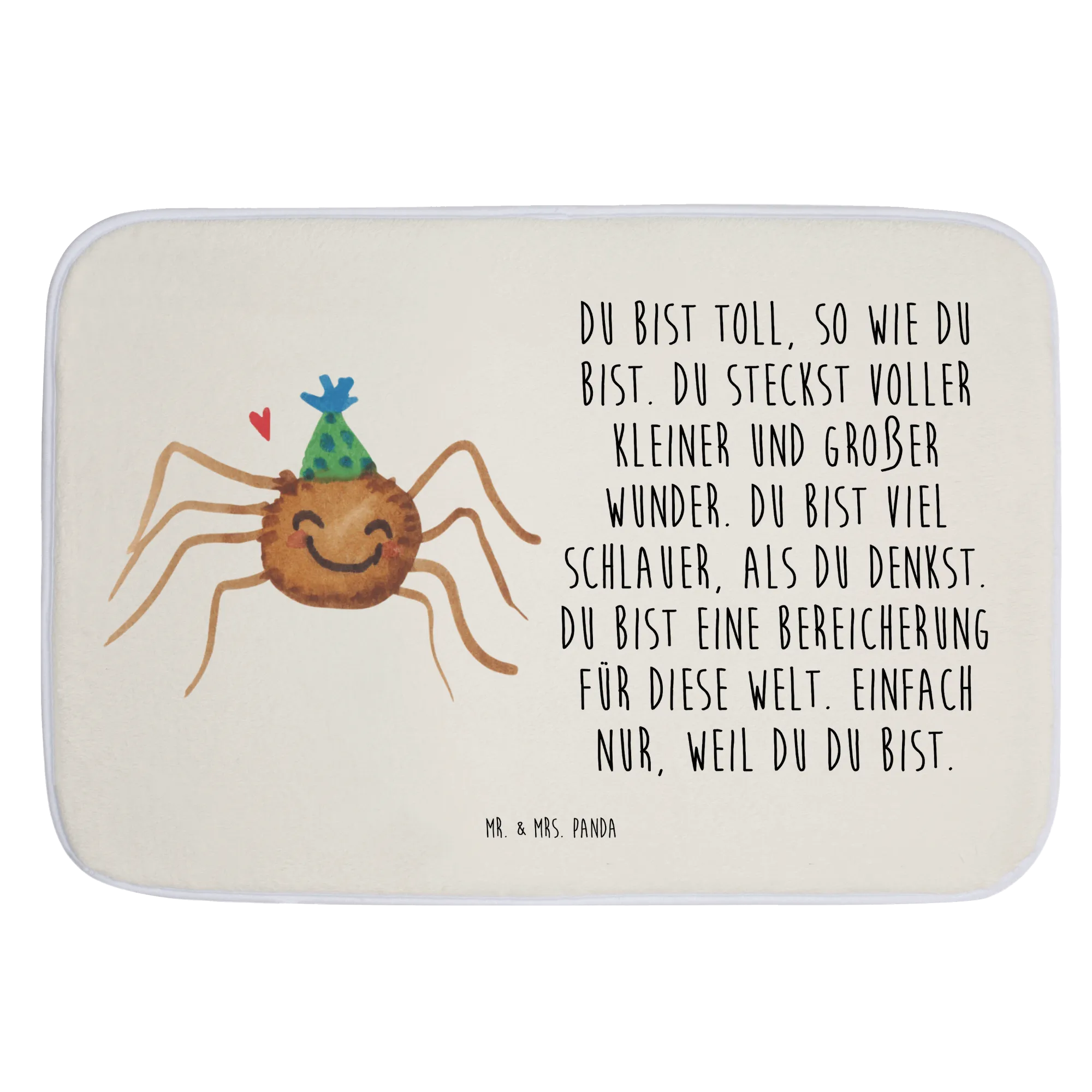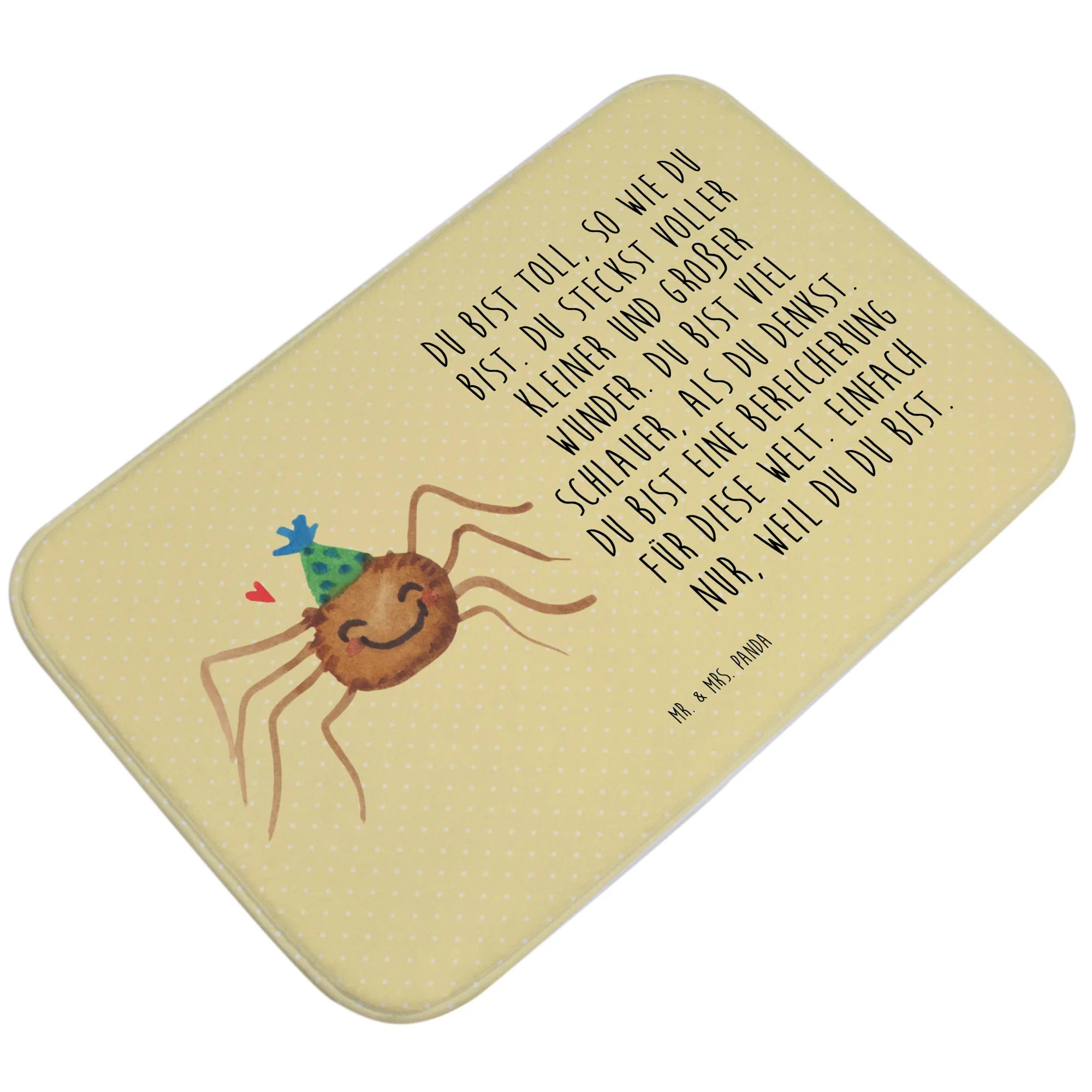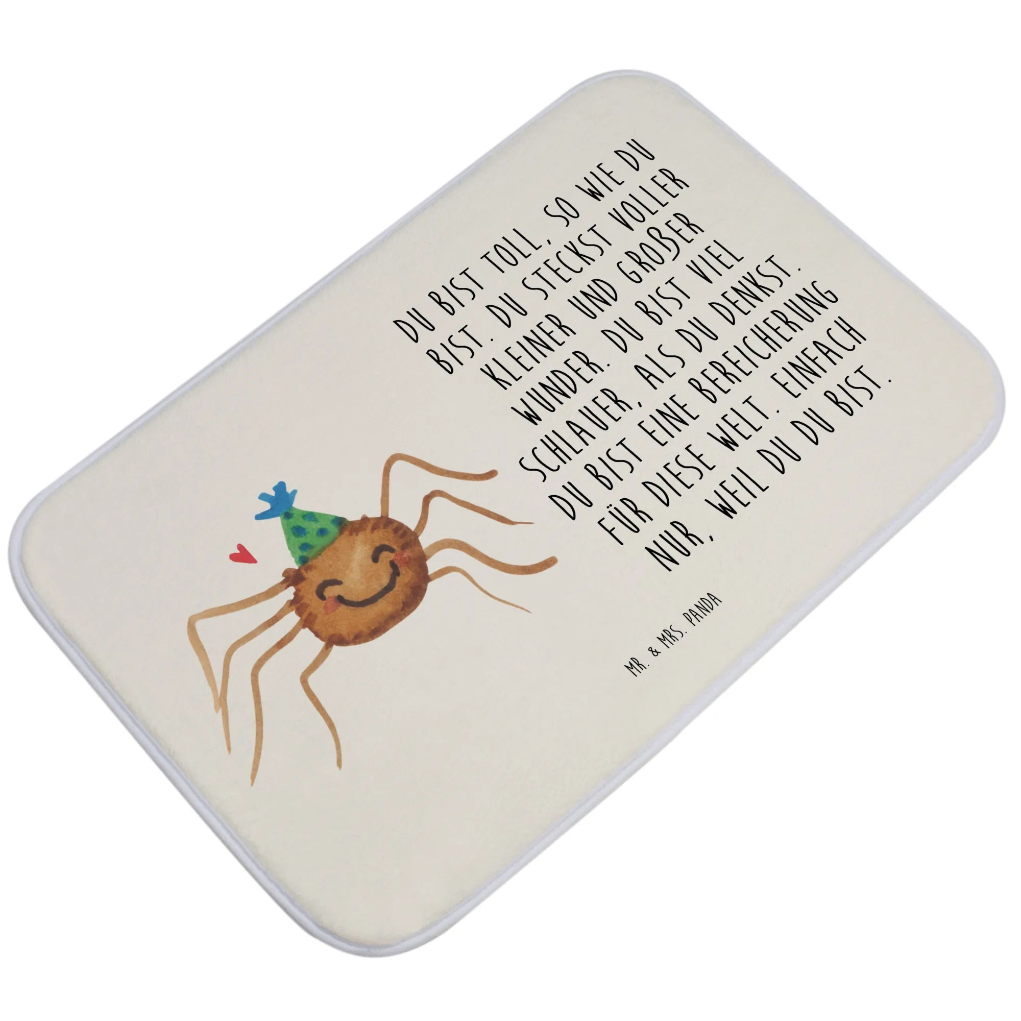 Ob für einen Geburtstag, einen Umzug, zum Einzug in eine neue Wohnung oder einfach nur so für die beste Freundin – dieser Badvorleger ist ein kreatives und liebevolles Geschenk zu jedem Anlass. Die bezaubernde Spinne Agathe ist nicht nur ein Blickfang, sondern ein Stück Lebensfreude, das Du in Deinem Badezimmer oder in dem eines Freundes verschenken kannst. Die Kollektion Spinne Agathe von Mr. & Mrs. Panda hat sich aus einer ganz besonderen Geschichte entwickelt und steht für das Leben, die Freude und die kleinen Wunder, die uns umgeben.