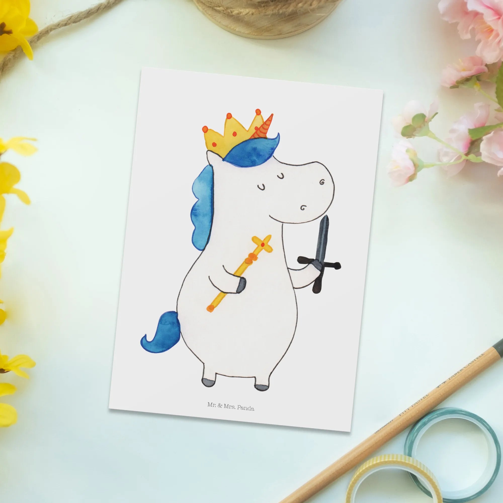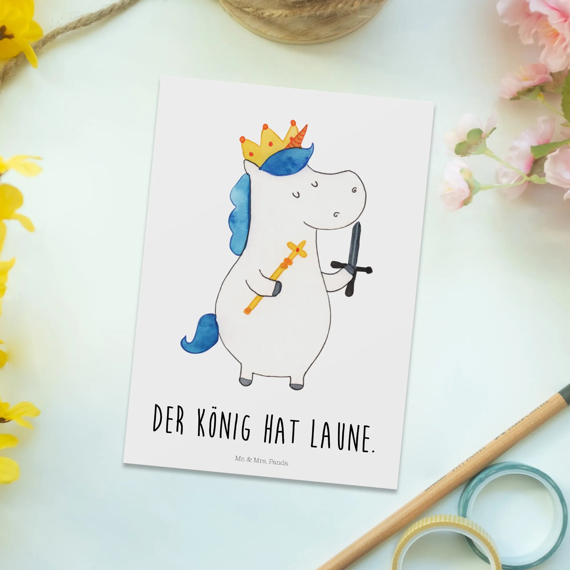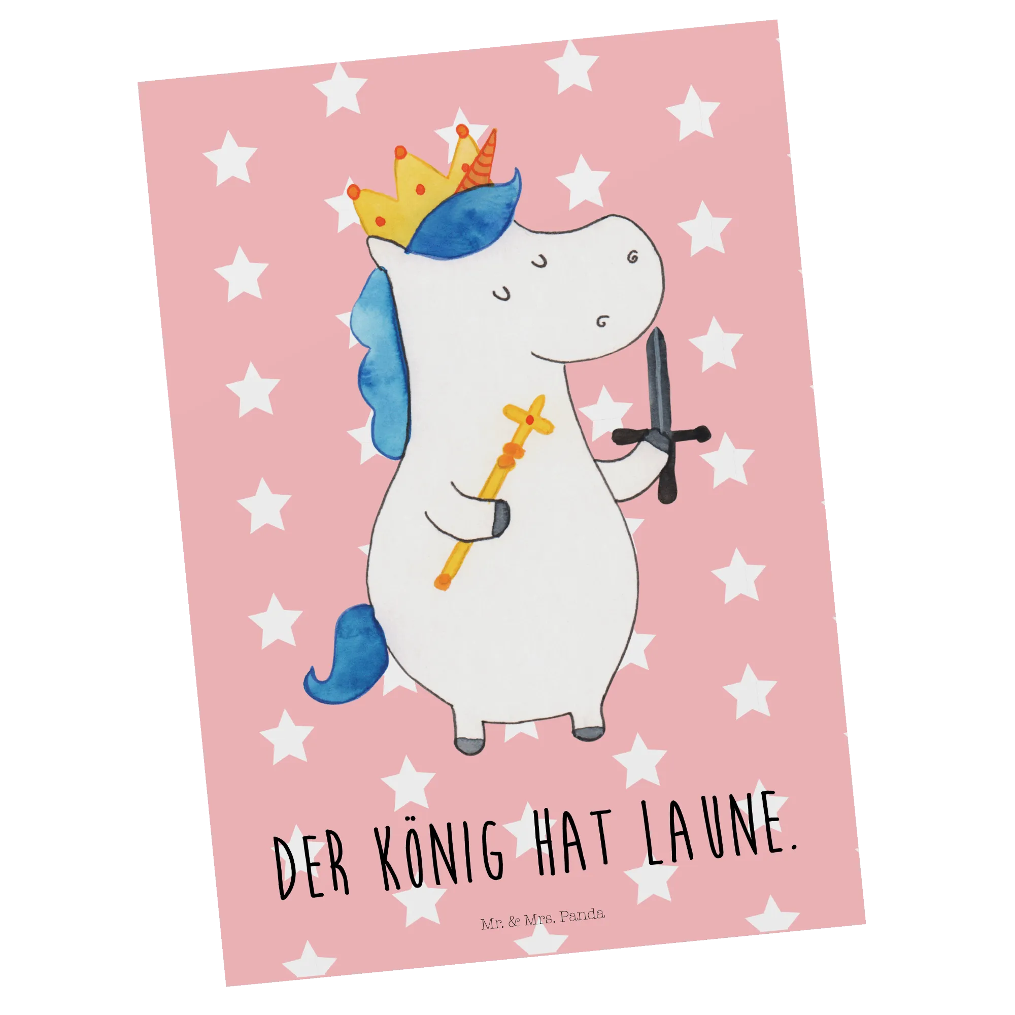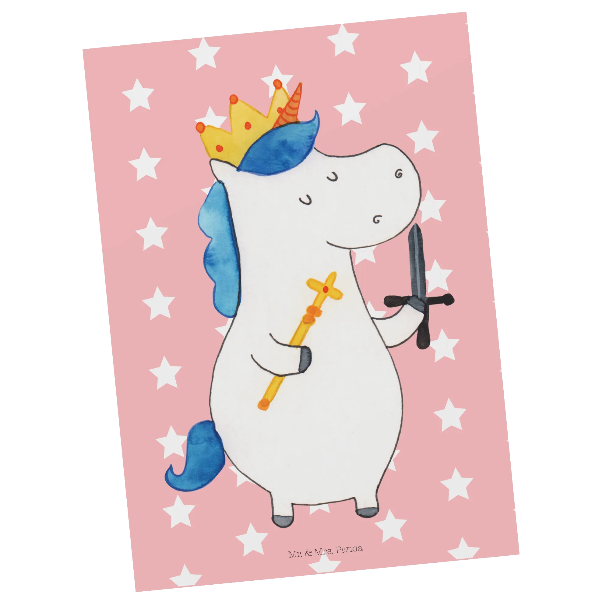 Pocztówka jednorożec Król z mieczem - z napisem - biały