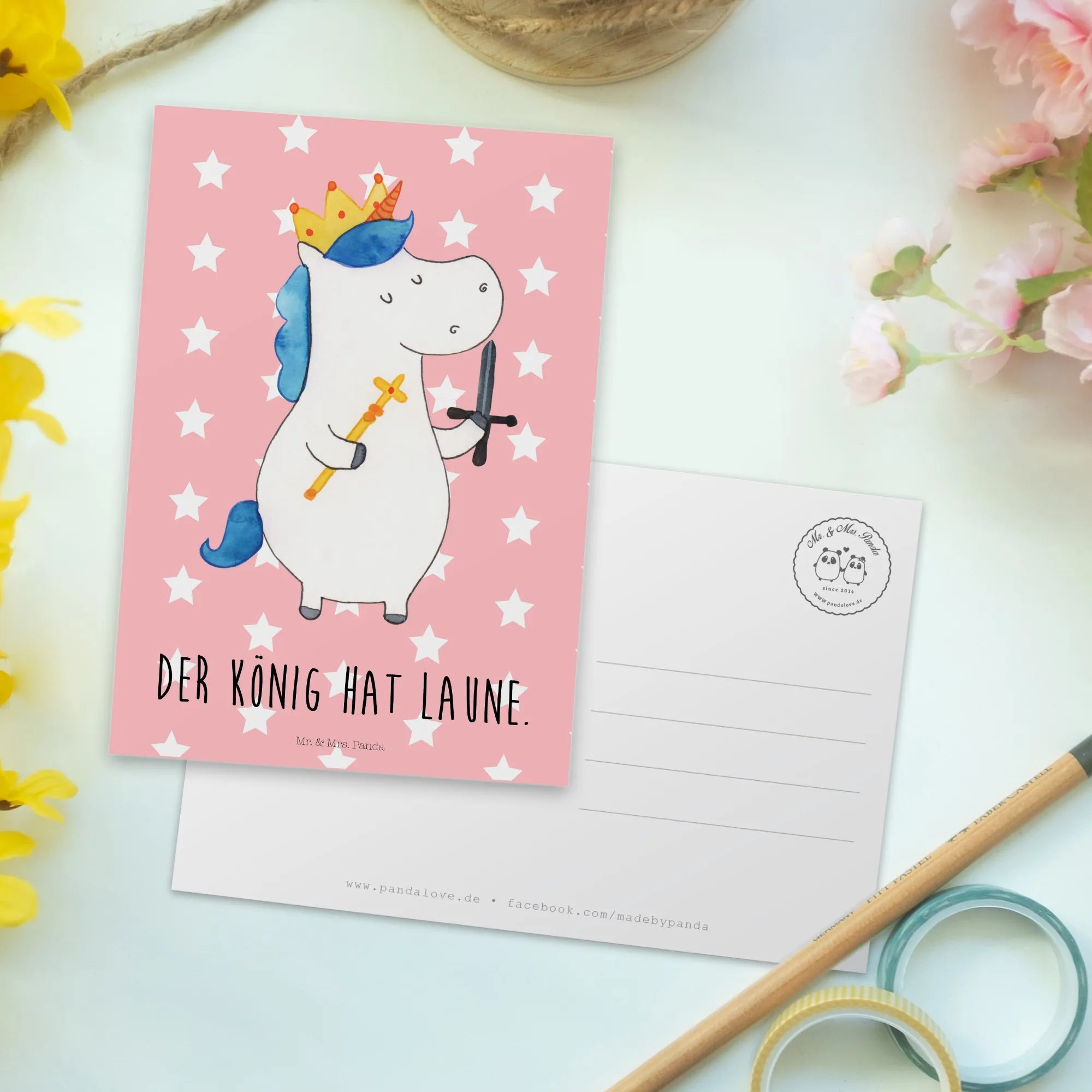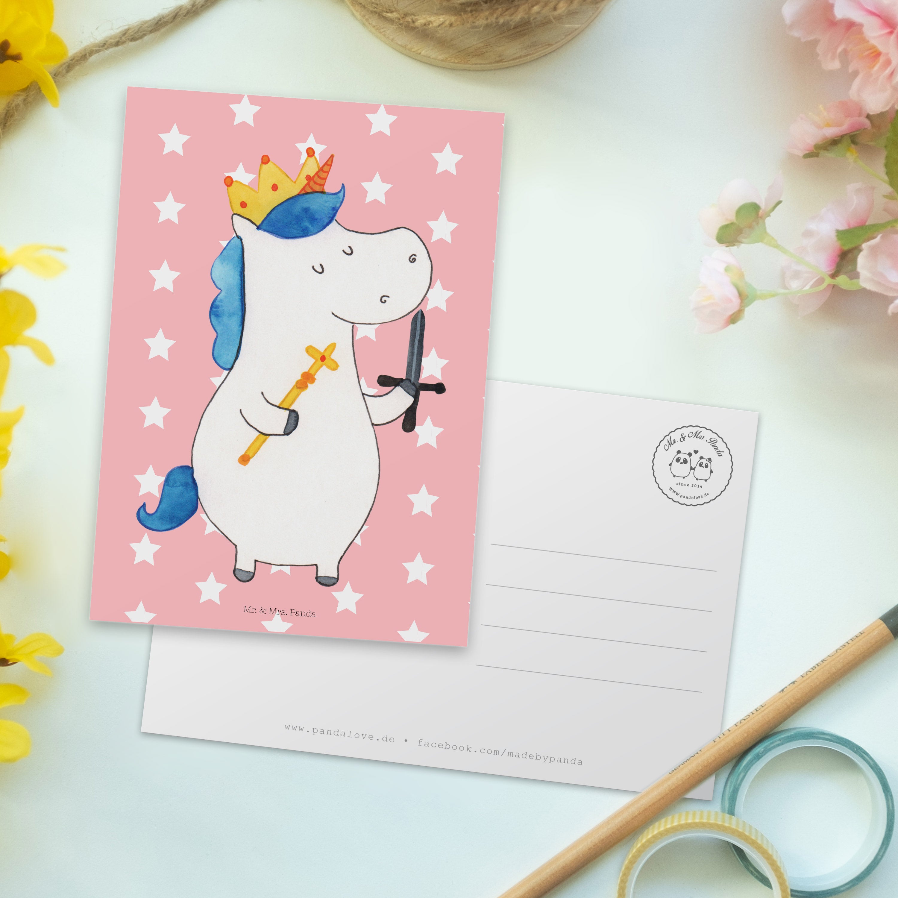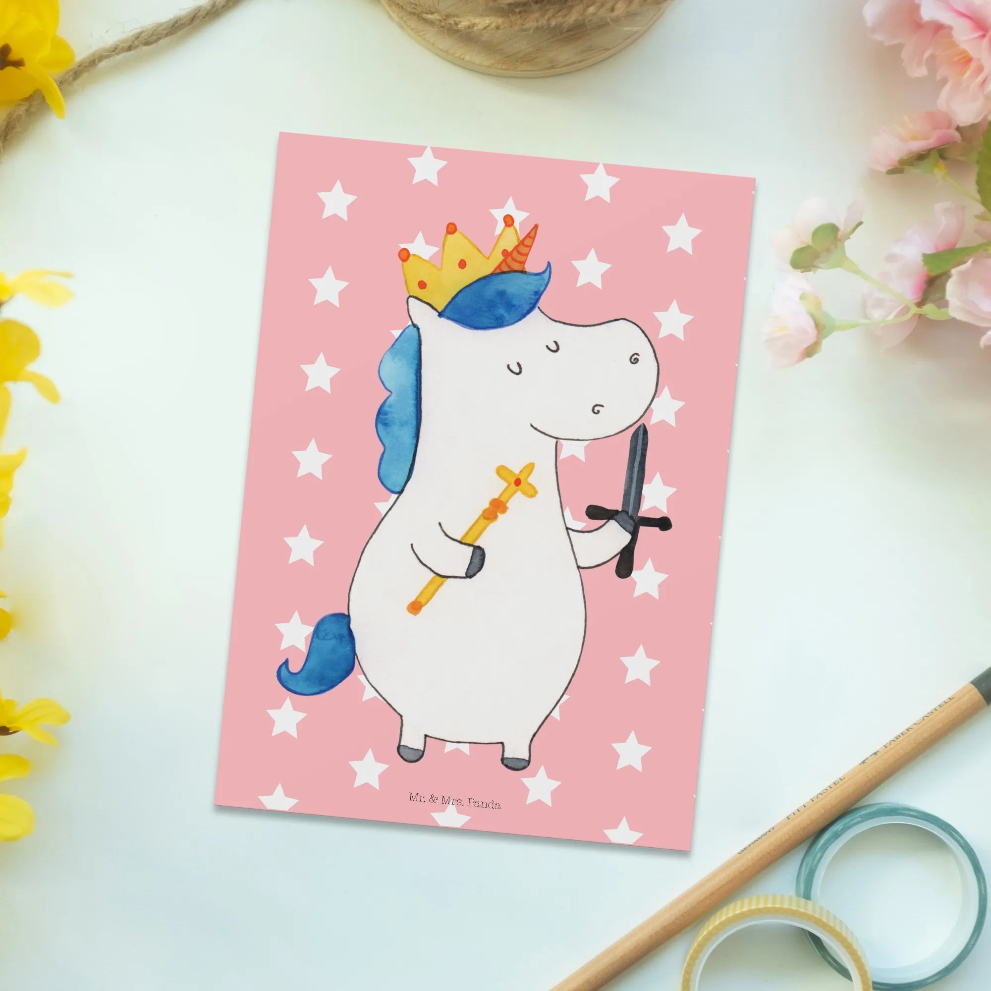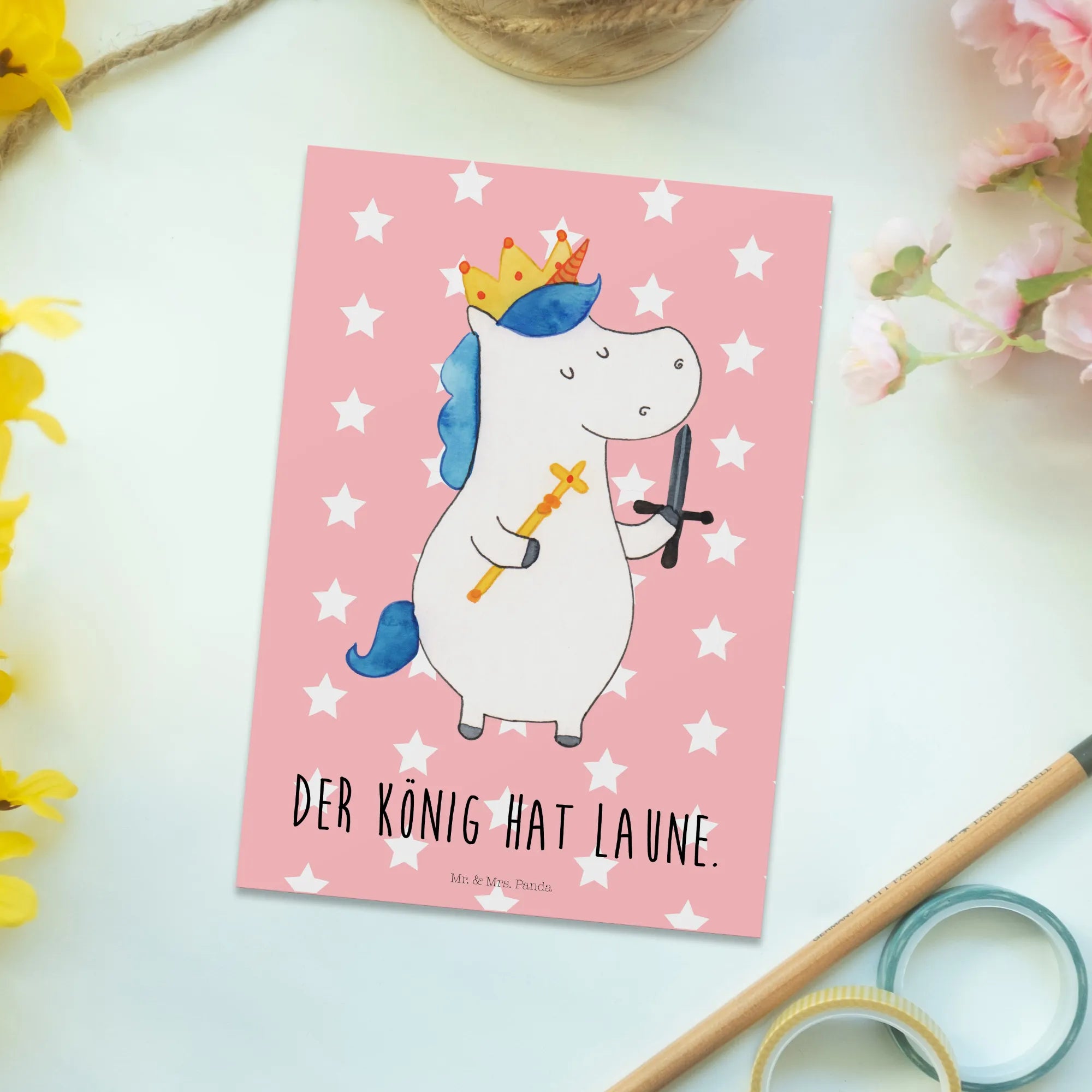 Pocztówka jednorożec Król z mieczem - z napisem - biały