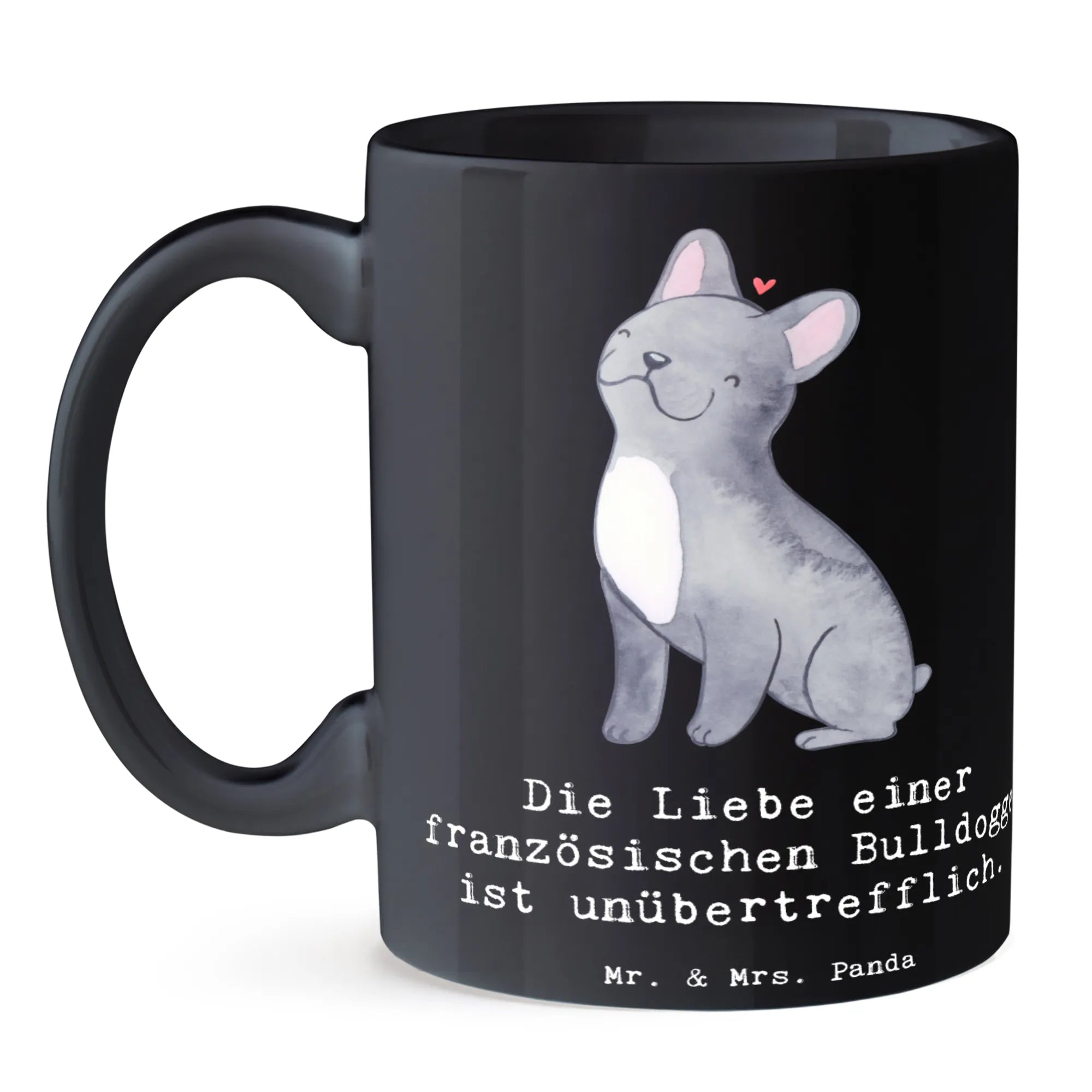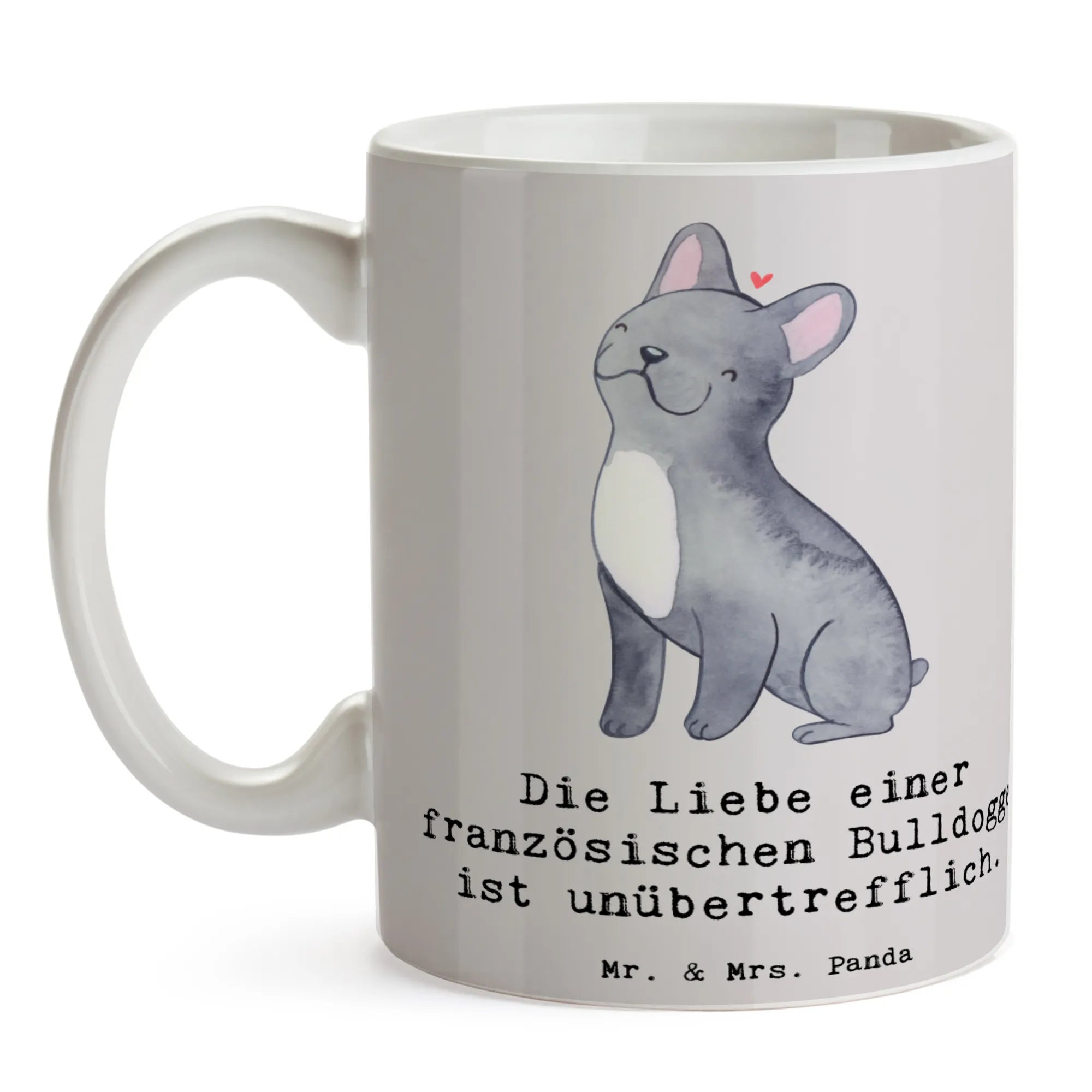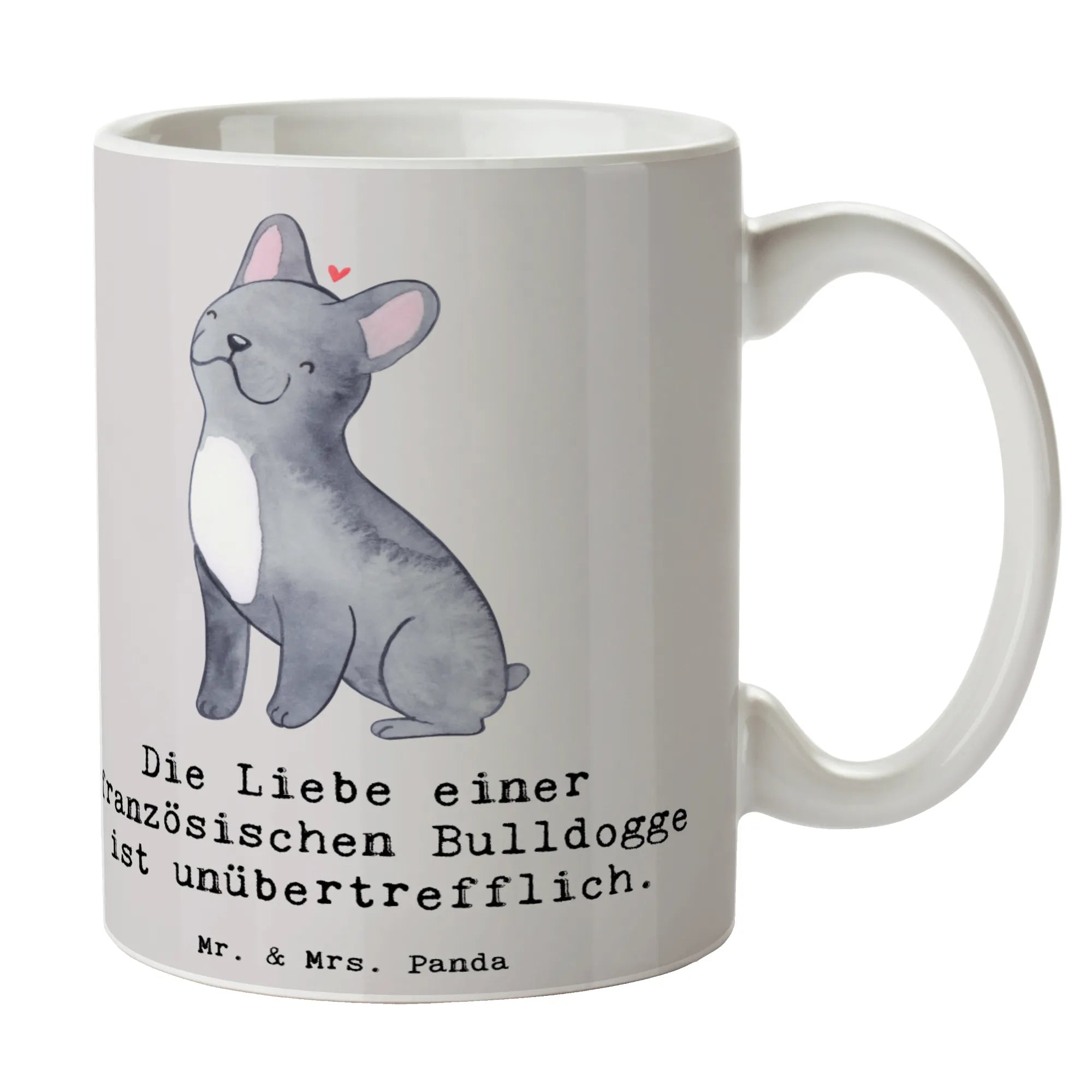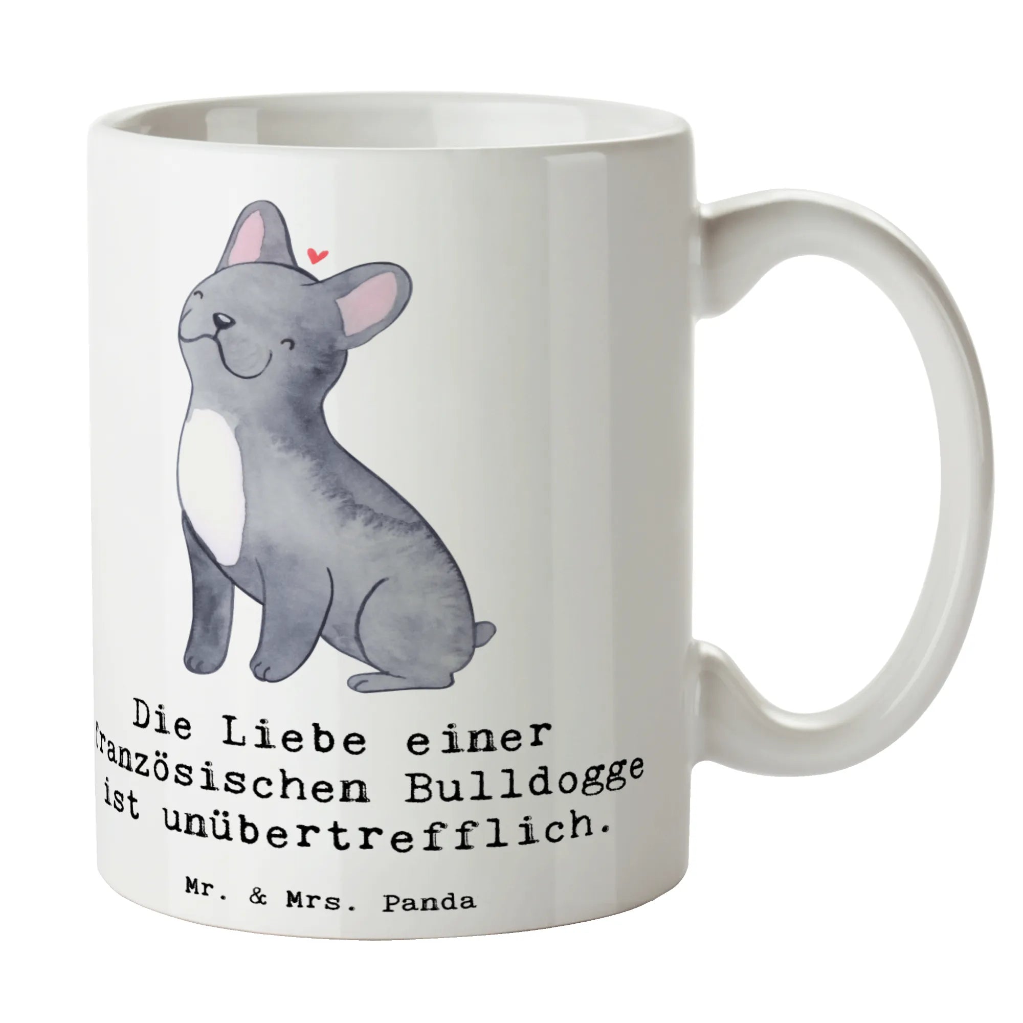 Die Liebe einer Französischen Bulldogge bringt Freude in jeden Tag, und genau darum haben wir diese bezaubernde Tasse mit dem Slogan "Die Liebe einer französischen Bulldogge ist unübertrefflich." kreiert! Diese wunderschöne Keramiktasse aus der Hunderassen Kollektion von Mr. & Mrs. Panda ist das perfekte Geschenk für alle Hundeliebhaber und vor allem für Fans dieser charmanten Hunderasse.