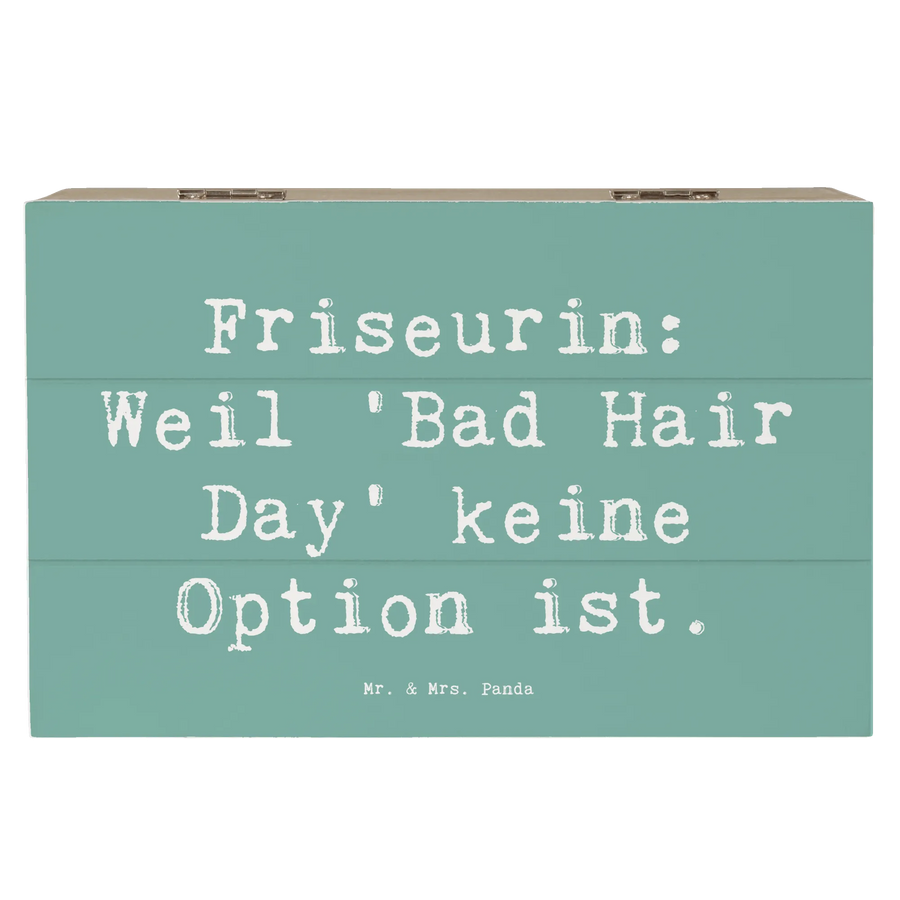 Die Holzkiste "Friseurin: Weil 'Bad Hair Day' keine Option ist." von Mr. & Mrs. Panda ist das perfekte Geschenk für alle, die in der aufregenden Welt der Friseure arbeiten. Diese wunderschöne Holzkiste ist nicht nur ein stilvolles Accessoire, sondern bietet auch ausreichend Platz, um all deine wertvollen Erinnerungen aufzubewahren. Ob Fotos von den besten Frisuren, kleine Auszeichnungen oder bedeutungsvolle Gegenstände – diese Erinnerungskiste bewahrt deine Schätze auf eine charmante Weise.