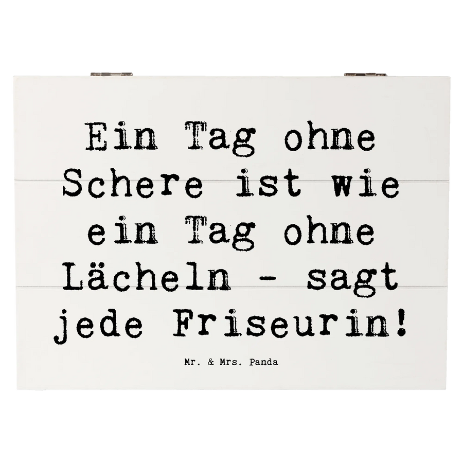 Eine bezaubernde Holzkiste von Mr. & Mrs. Panda – perfekt als Schatzkiste, Erinnerungskiste oder Geschenkbox. Das liebevoll illustrierte Motiv „Friseurin“ mit dem Spruch „Ein Tag ohne Schere ist wie ein Tag ohne Lächeln - sagt jede Friseurin!“ bringt Charme und ein Lächeln in jeden Raum. 🎁