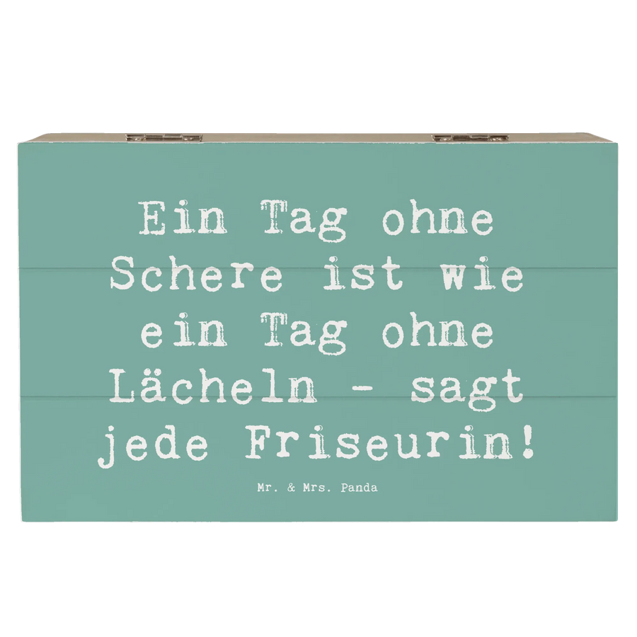 Eine bezaubernde Holzkiste von Mr. & Mrs. Panda – perfekt als Schatzkiste, Erinnerungskiste oder Geschenkbox. Das liebevoll illustrierte Motiv „Friseurin“ mit dem Spruch „Ein Tag ohne Schere ist wie ein Tag ohne Lächeln - sagt jede Friseurin!“ bringt Charme und ein Lächeln in jeden Raum. 🎁