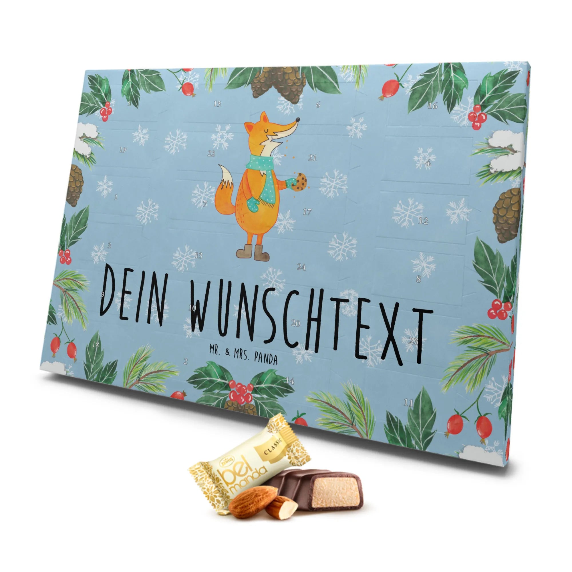 Solltest du einen Namen hinzufügen möchten, hast du die Möglichkeit, das Design noch individueller zu gestalten. So wird der Kalender zu einem echten Unikat! Lass dich von der Fuchs Kollektion von Mr. & Mrs. Panda verzaubern und genieße die Leckereien in der Gesellschaft dieses kleinen, schlauen Freundes! Du wirst sehen, dass der Marzipan Adventskalender jeden Tag ein kleines, süßes Highlight in dein Leben bringt.