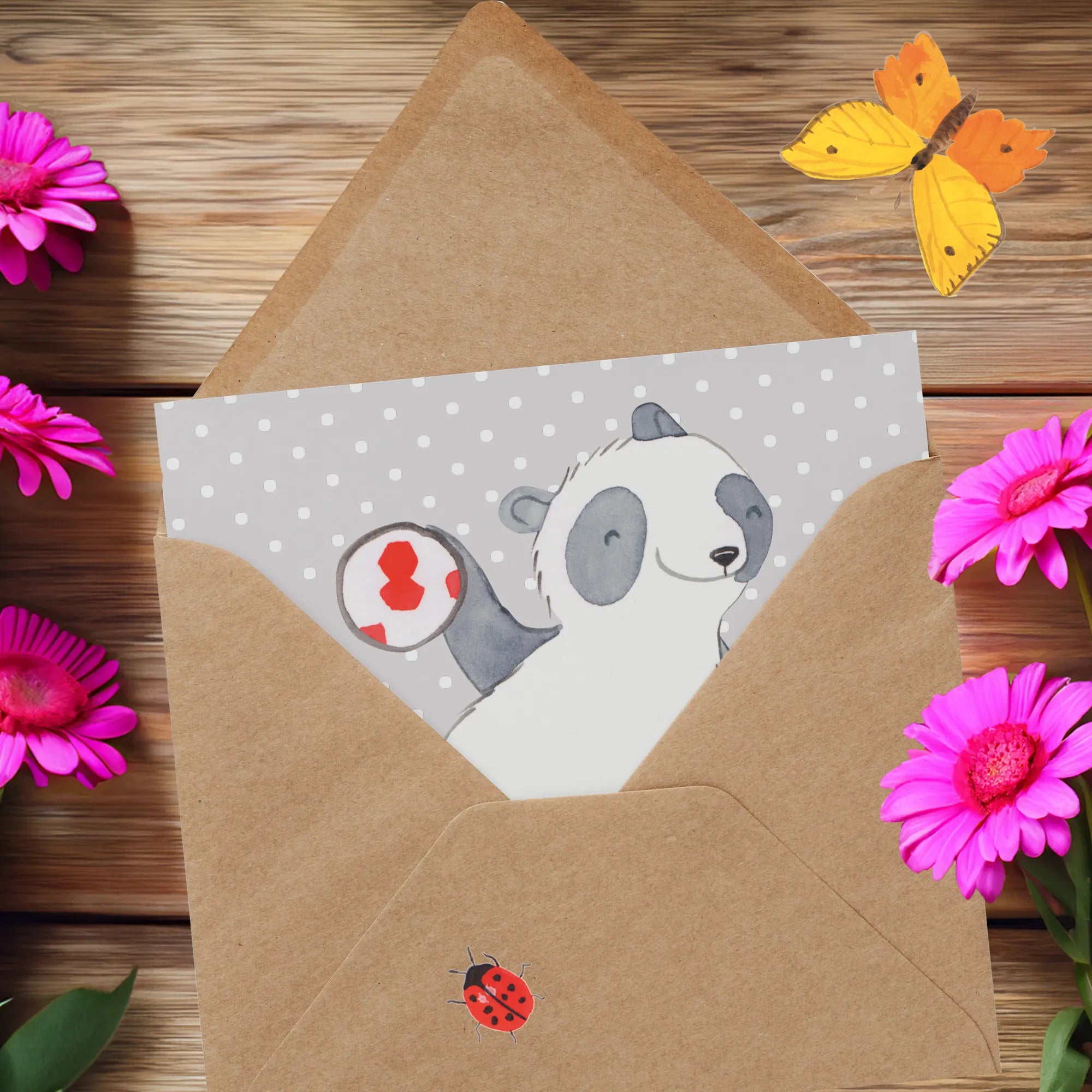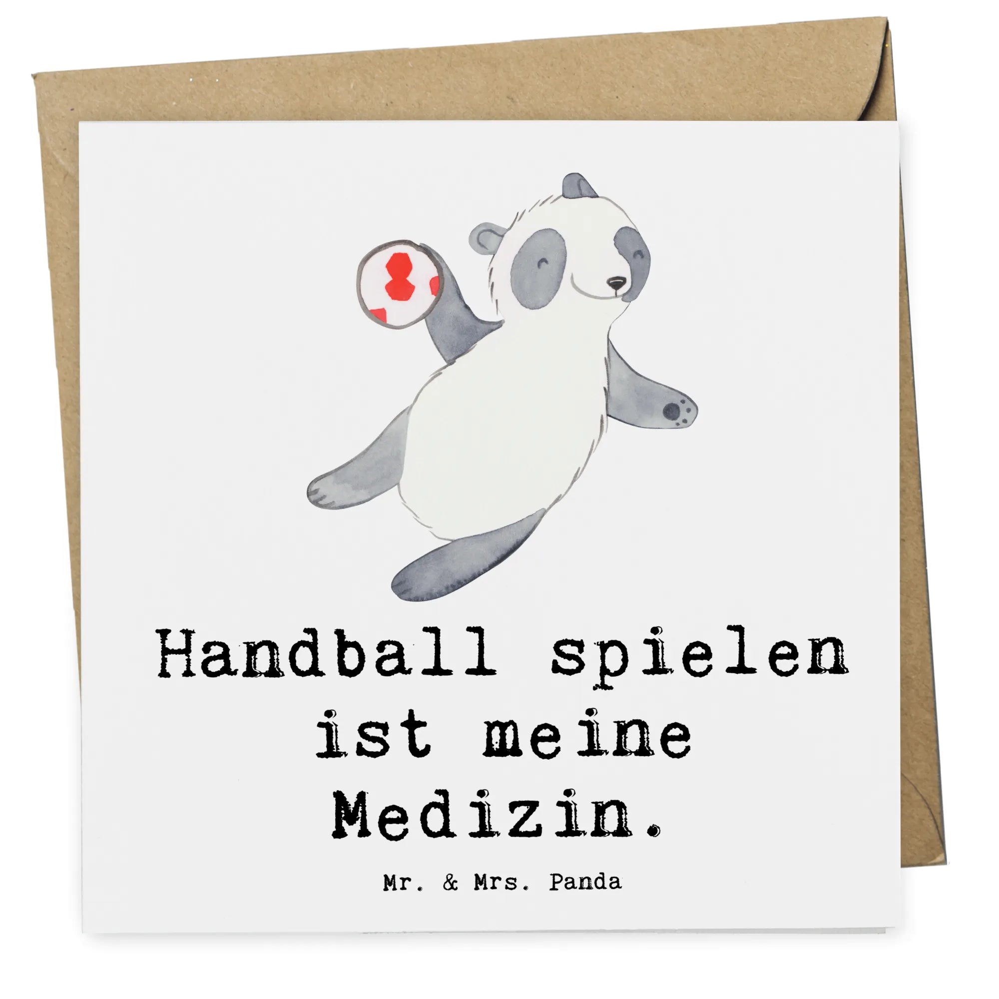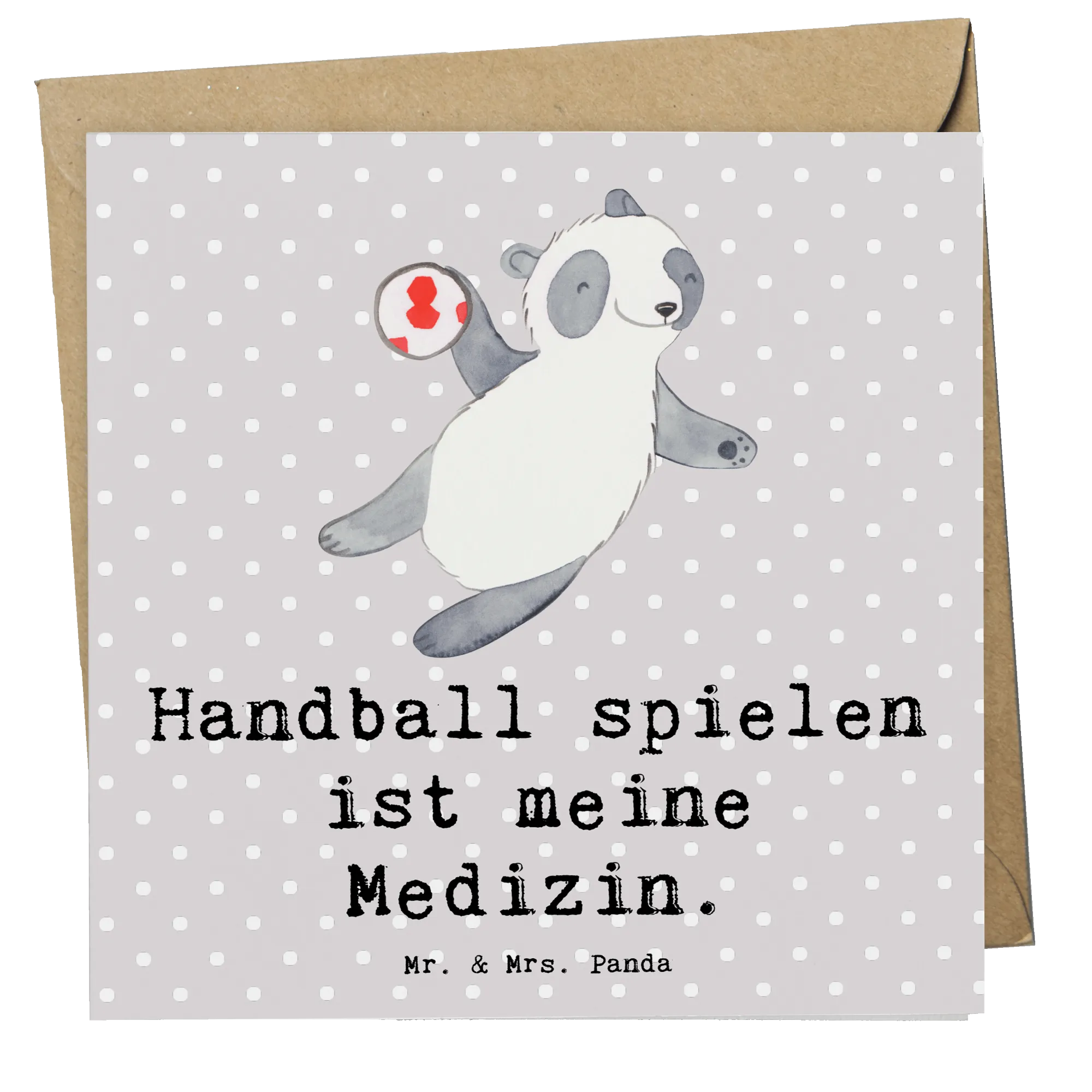 Das süße Motiv zeigt einen fröhlichen Panda, der mit vollem Körpereinsatz Handball spielt. Sicherheit und Teamgeist werden mit diesem Bild wunderbar transportiert, und der witzige Spruch "Handball spielen ist meine Medizin" bringt ein Lächeln auf jedes Gesicht. Daher ist diese Karte perfekt geeignet für Handballer, Spieler und Fans, die ihre Leidenschaft ausdrücken möchten.