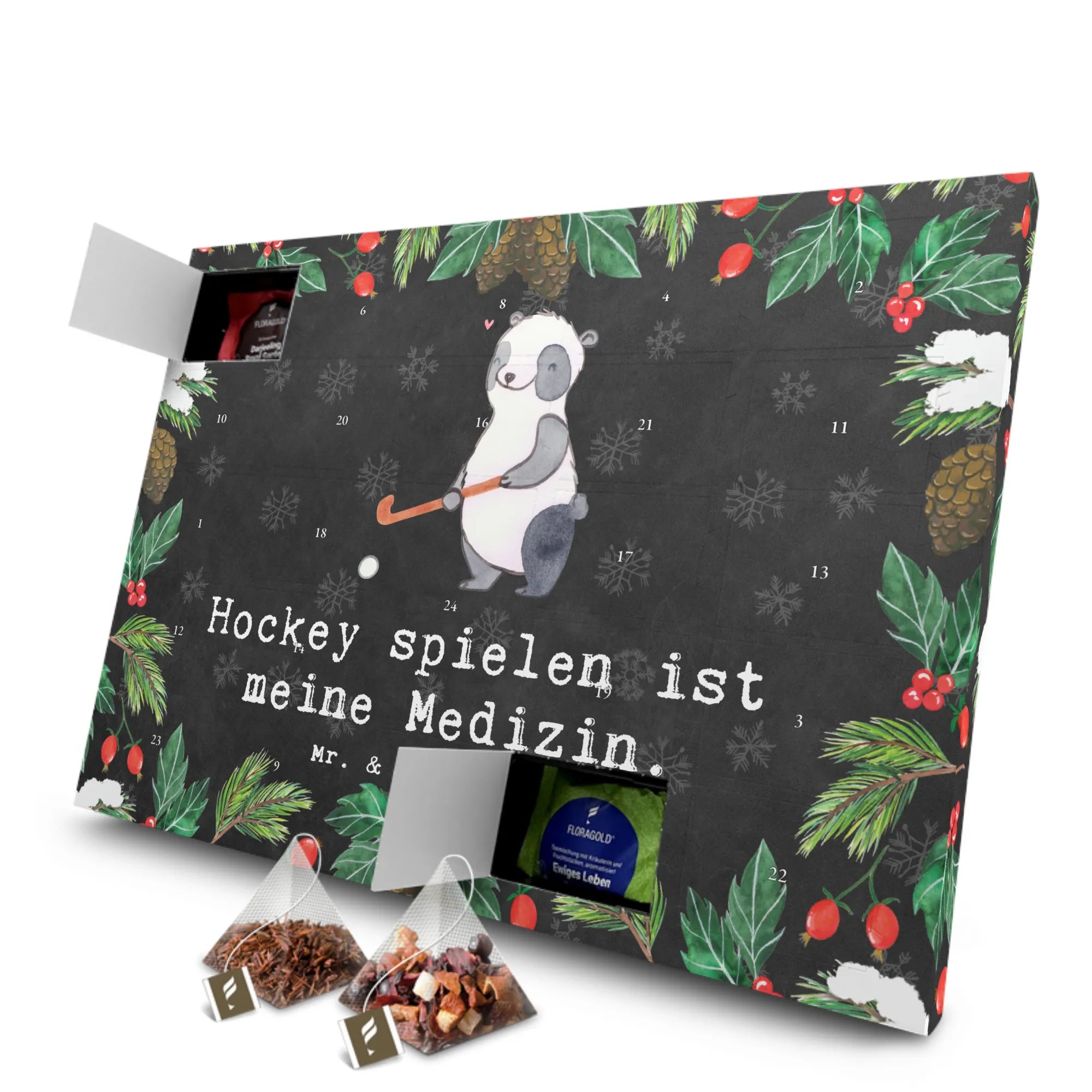 Bist du auf der Suche nach einem besonderen Geschenk für einen leidenschaftlichen Hockeyspieler oder -fan? Der Tee Adventskalender "Panda Hockey spielen ist meine Medizin" von Mr. & Mrs. Panda ist genau das Richtige für dich! Mit seinem süßen Panda-Motiv, der mit einem Hockeyschläger spielt, bringt dieser Adventskalender Freude und eine besinnliche Vorfreude auf das Weihnachtsfest.