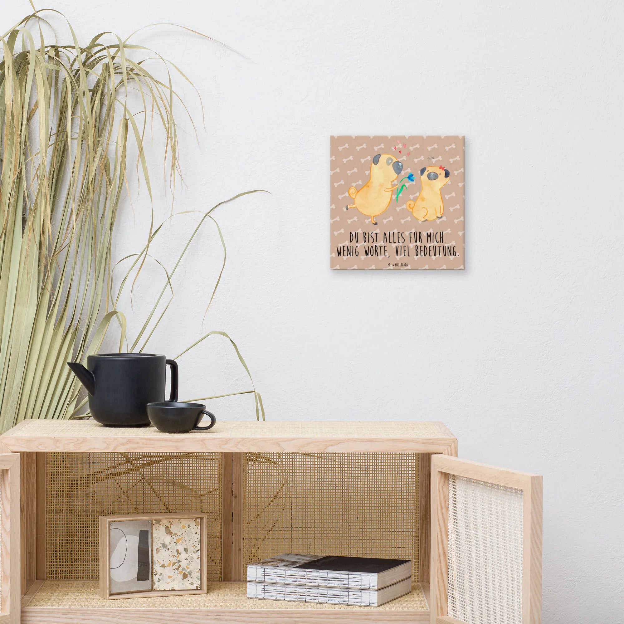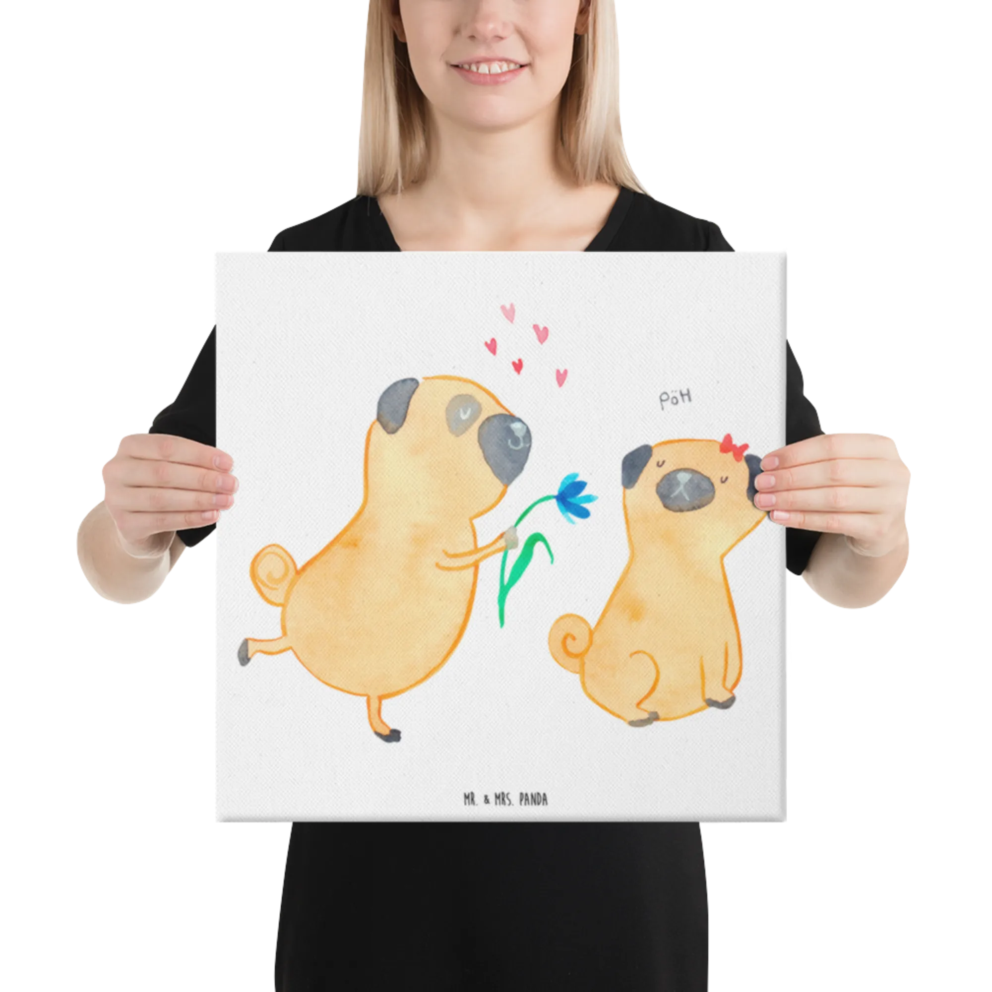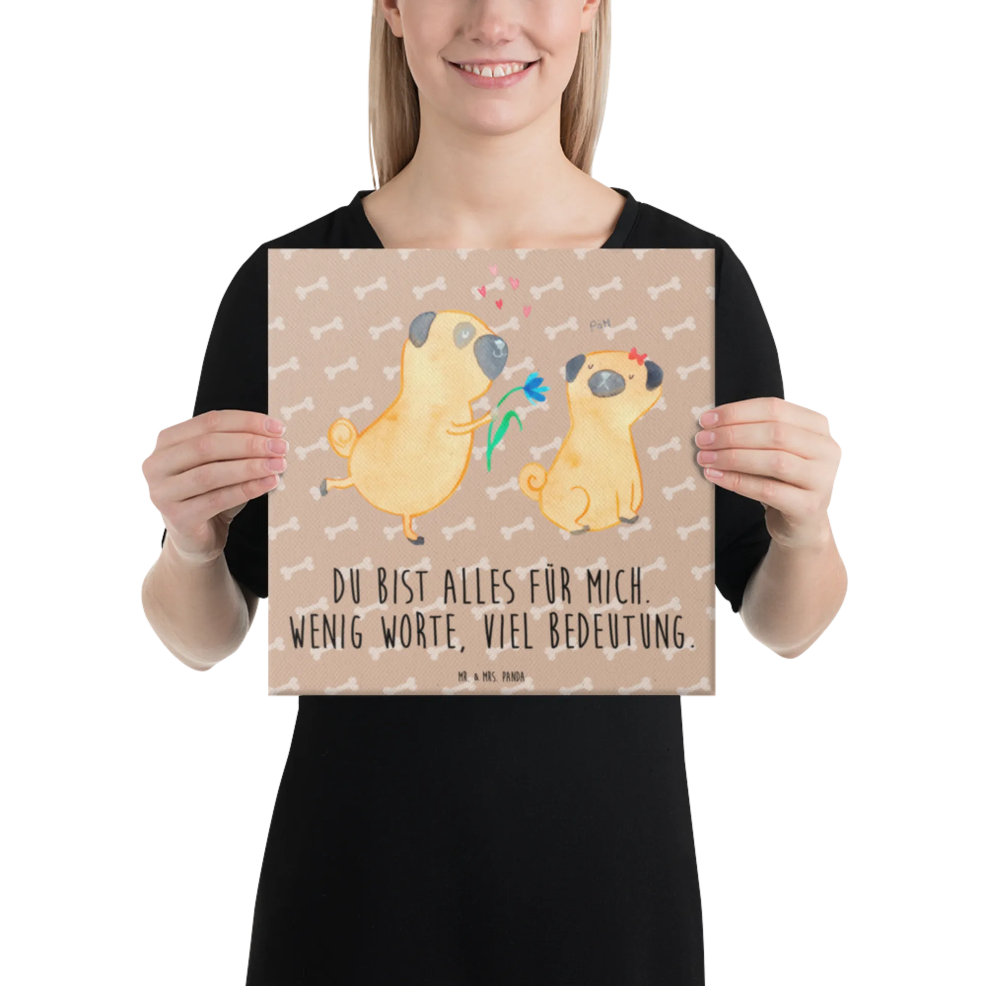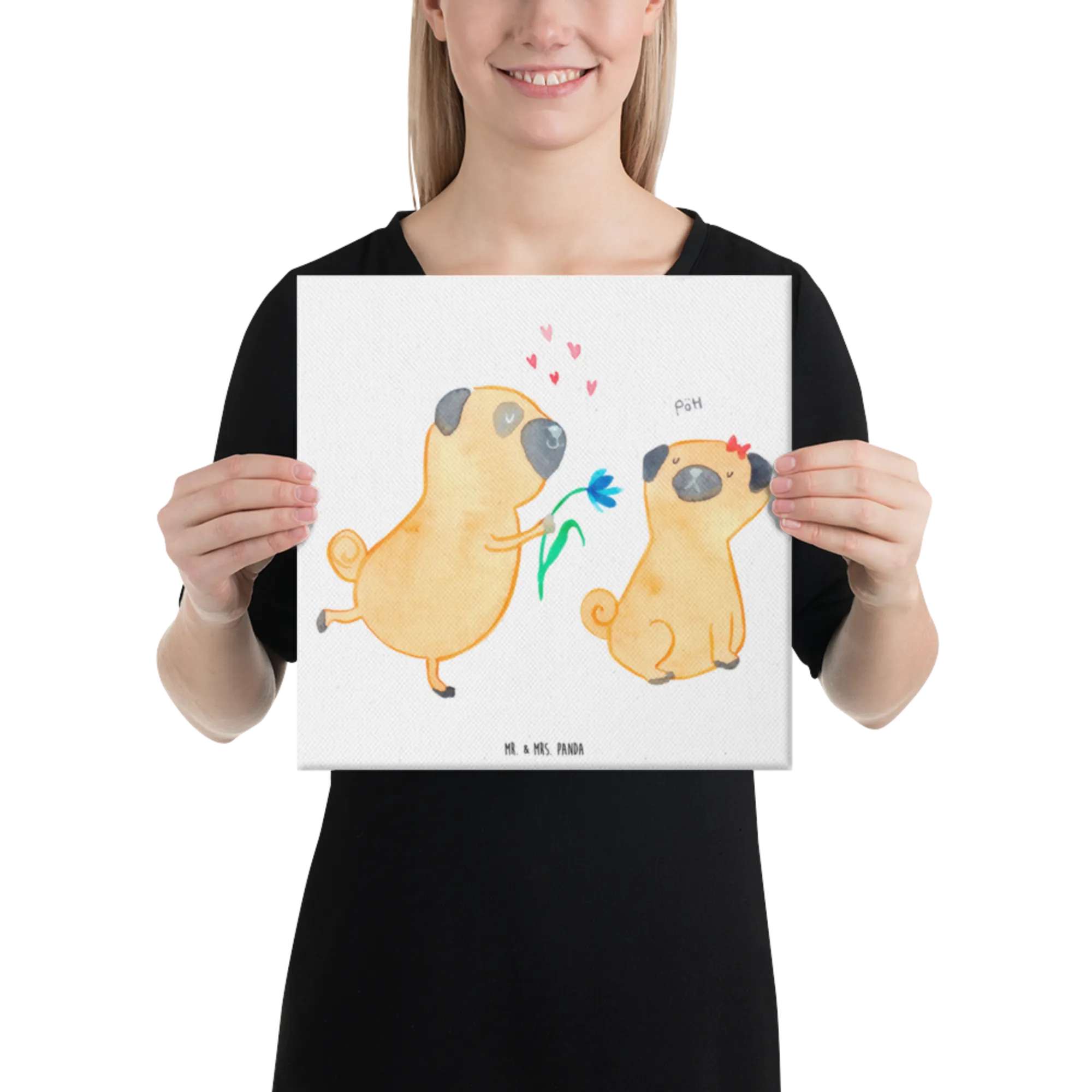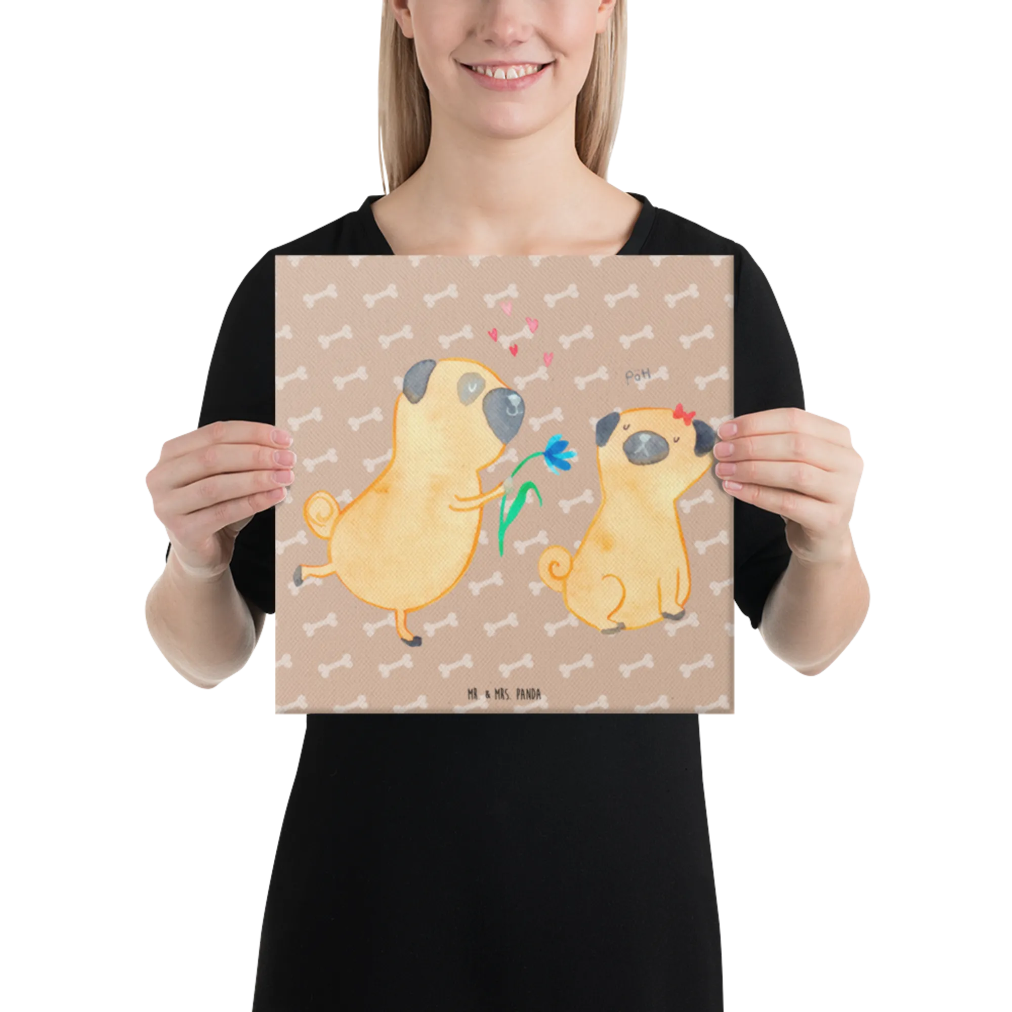 Obraz na płótnie mops Zakochani - 30 x 30 cm - z napisem - biały