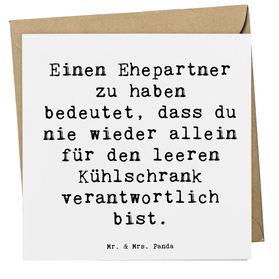 Der Spruch auf der Vorderseite: "Einen Ehepartner zu haben bedeutet, dass du nie wieder allein für den leeren Kühlschrank verantwortlich bist." bringt auf humorvolle Weise das Besondere an einer Partnerschaft zum Ausdruck.