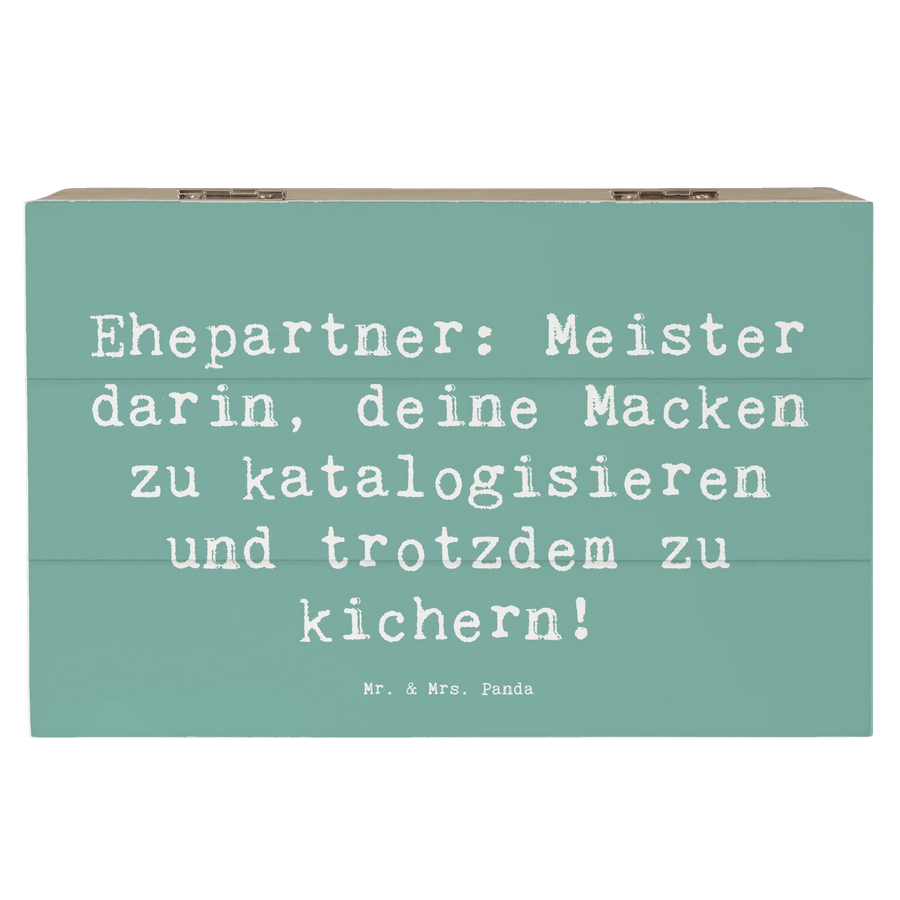 Mit dem Spruch "Ehepartner: Meister darin, deine Macken zu katalogisieren und trotzdem zu kichern!" spricht sie die besondere Verbindung an, die Partner miteinander teilen. Ob für den Jahrestag, den Valentinstag oder einfach nur als kleine, liebevolle Geste zwischendurch – diese Erinnerungskiste ist ein absolutes Must-Have!