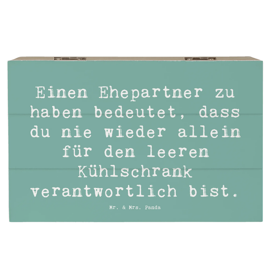 Die wunderschöne Holzkiste von Mr. & Mrs. Panda ist das perfekte Geschenk für Deinen Ehepartner. Mit einem liebevollen Spruch, der besagt: "Einen Ehepartner zu haben bedeutet, dass du nie wieder allein für den leeren Kühlschrank verantwortlich bist", bringt diese Kiste ein Lächeln auf jedes Gesicht. Die Holzkiste eignet sich wunderbar als Erinnerungsbox für all die besonderen Momente in Deinem Leben. Egal, ob es sich um Fotos, Kindheitserinnerungen oder kleine Schätze handelt, diese Kiste hält alles an einem Ort zusammen und sieht dabei auch noch fantastisch aus.