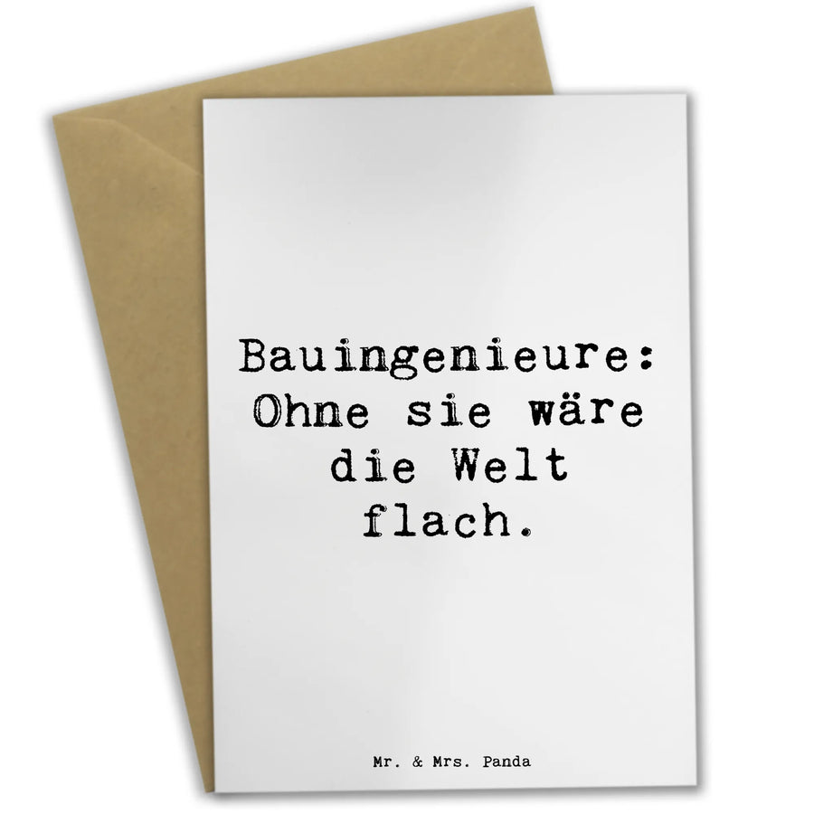 Diese wunderschöne Grußkarte von Mr. & Mrs. Panda ist das perfekte Geschenk für jeden Bauingenieur oder Bauingenieurin. Ob zum Geburtstag, zur Hochzeit oder einfach nur, um jemandem Danke zu sagen – die Karte mit dem Spruch "Bauingenieure: Ohne sie wäre die Welt flach." bringt mit Sicherheit ein Lächeln auf die Lippen.