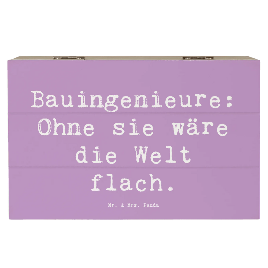Entdecke die charmante Holzkiste "Bauingenieur" aus der Berufe-Kollektion von Mr. & Mrs. Panda! Diese wunderschöne Kiste ist nicht nur ein Blickfang, sondern auch der perfekte Ort, um all deine wertvollen Erinnerungen, Schätze und wichtigen Dokumente sicher aufzubewahren. Mit einem liebevollen, handgezeichneten Motiv, das den Beruf des Bauingenieurs feiert und dem Spruch "Bauingenieure: Ohne sie wäre die Welt flach.", zaubert sie jedem ein Lächeln ins Gesicht.