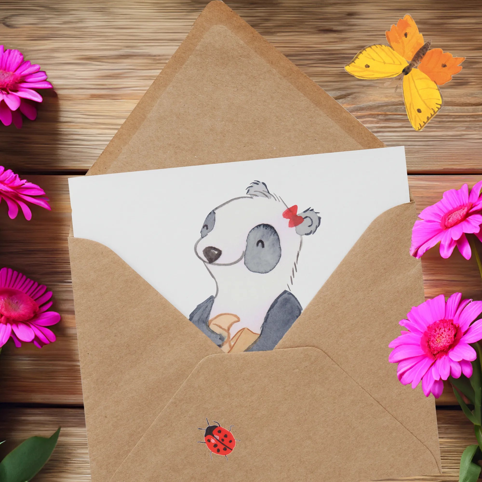 Auf der Vorderseite strahlt ein charmantes Motiv: eine kleine Pandadame, die fröhlich ein Croissant in eine Tüte packt, und darüber steht der einladende Spruch: "Du bist nur ein halber Mensch, wenn du keine Bäckerin bist." Diese Karte eignet sich ideal für verschiedene Anlässe, wie Geburtstage, Hochzeiten oder sogar als kleine Aufmerksamkeiten für Arbeitskollegen.