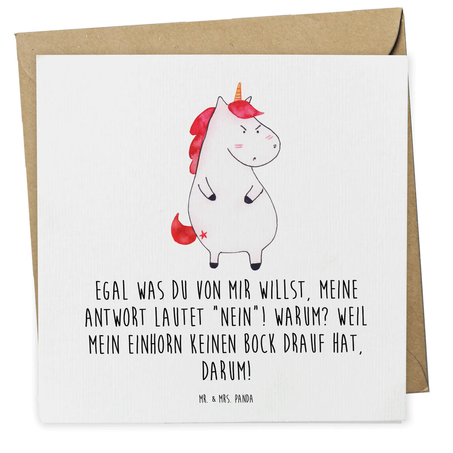 Die Deluxe Karte "Einhorn wütend" aus der einzigartigen Einhorn-Kollektion von Mr. & Mrs. Panda ist ein echter Hingucker. Diese hochwertige, quadratische Karte ist nicht nur ein wunderbares Geschenk, sondern auch eine perfekte Möglichkeit, Deine Gefühle und Gedanken auf humorvolle Weise auszudrücken. Bedruckt mit einem lebhaften und süßen Einhorn, das mit einem Augenzwinkern und einem leicht grimmigen Blick "Egal was du von mir willst, meine Antwort lautet 'Nein'! Warum? Weil mein Einhorn keinen Bock drauf hat, darum!" sagt, bringt sie jeden zum Schmunzeln.