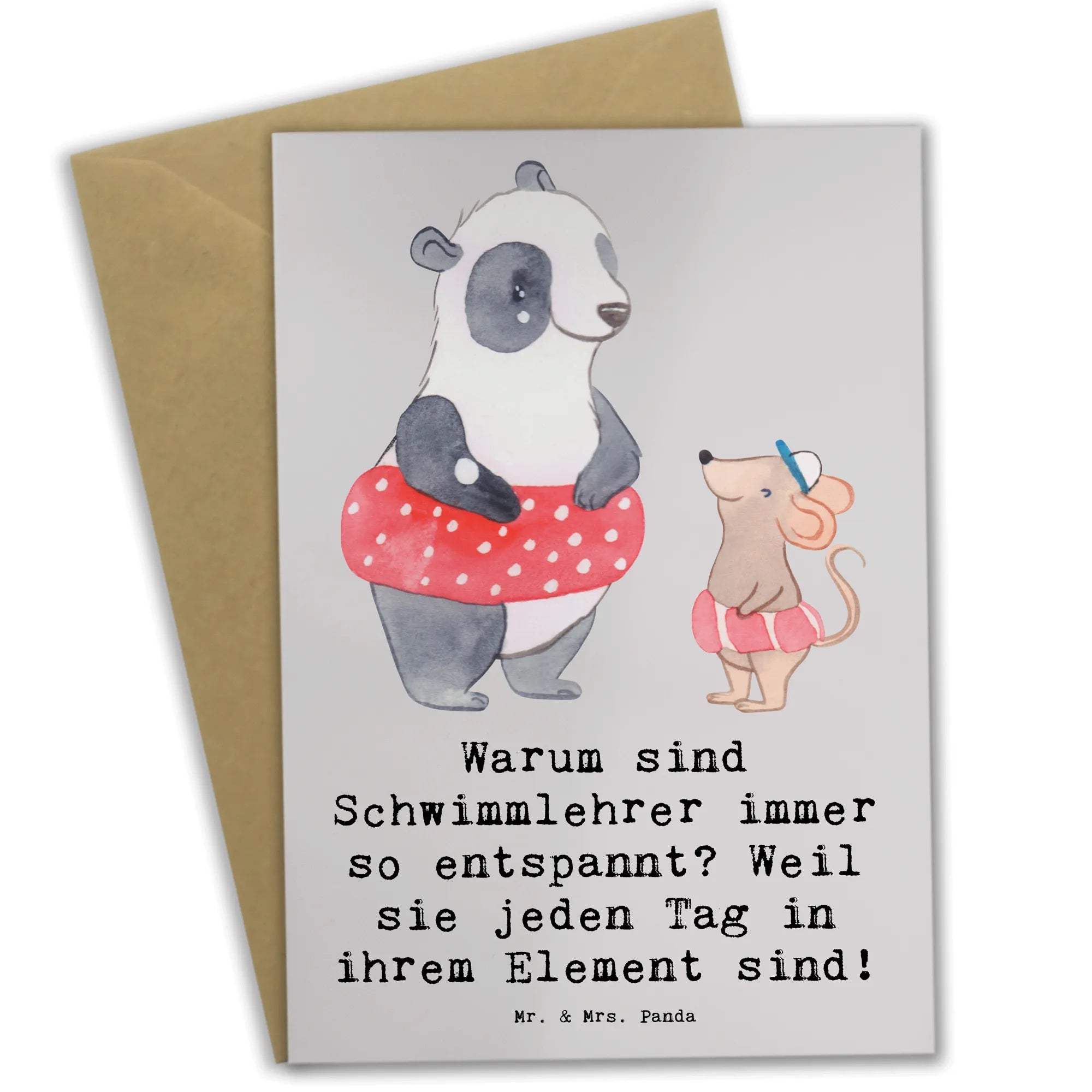 Die Grußkarte "Schwimmlehrer" aus der beliebten Kollektion "Berufe" von Mr. & Mrs. Panda ist das perfekte Geschenk für alle Schwimmlehrer und Wassersportliebhaber. Mit dem charmanten Spruch "Warum sind Schwimmlehrer immer so entspannt? Weil sie jeden Tag in ihrem Element sind!" bringst Du eine Portion Humor in die beste Zeit des Jahres – Sommer und Schwimmspaß!