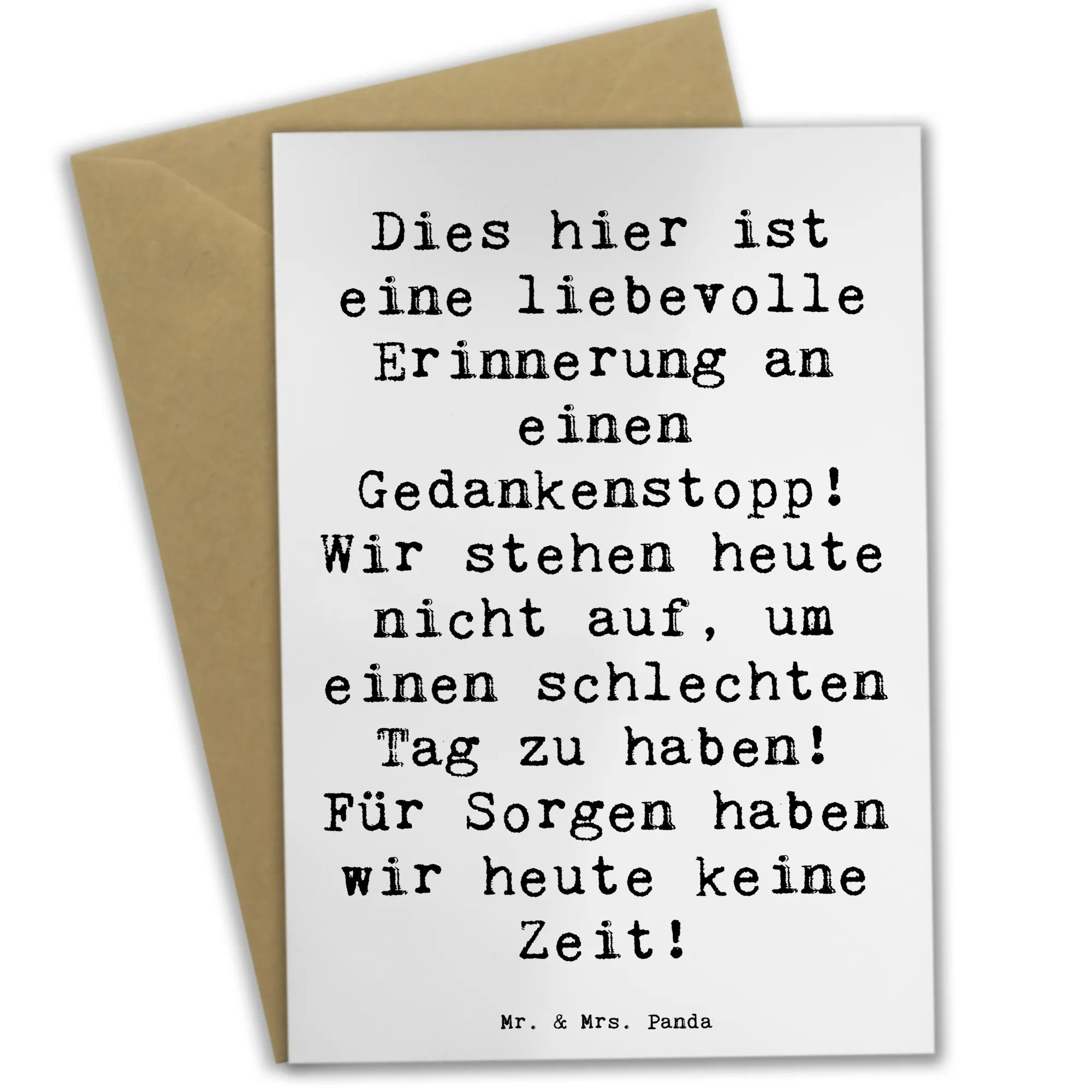 Vielleicht möchtest Du einem Freund Mut zusprechen, einem Familienmitglied Deine Freude ausdrücken oder einfach nur Danke sagen – diese Grußkarte bringt Deine Gefühle auf den Punkt! Die Botschaft „Dies hier ist eine liebevolle Erinnerung an einen Gedankenstopp! Wir stehen heute nicht auf, um einen schlechten Tag zu haben! Für Sorgen haben wir heute keine Zeit!“ lädt zum Positivdenken und Entspannen ein.