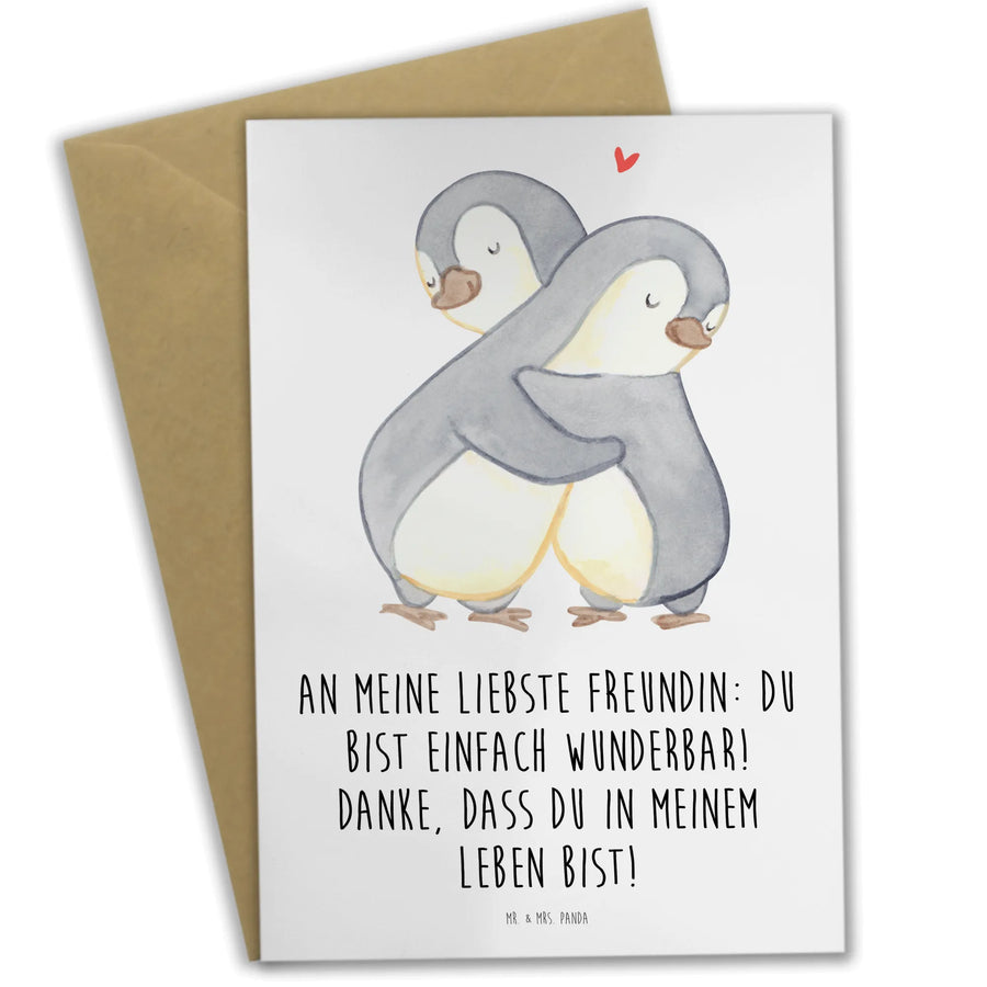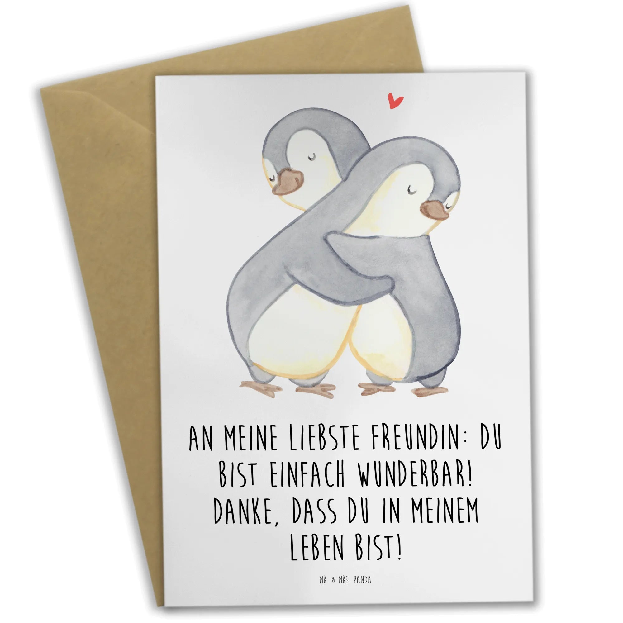 Die wunderschöne Grußkarte für deine liebste Freundin aus der Mr. & Mrs. Panda 'Danke'-Kollektion ist das perfekte Geschenk, um deine Dankbarkeit auf eine herzliche Art und Weise auszudrücken. Diese Grußkarte, bedruckt mit dem liebevollen Spruch 'An meine liebste Freundin: Du bist einfach wunderbar! Danke, dass du in meinem Leben bist!', eignet sich ideal für besondere Anlässe wie Geburtstage, Hochzeiten oder einfach nur so, um zu zeigen, wie viel dir deine Freundin bedeutet.