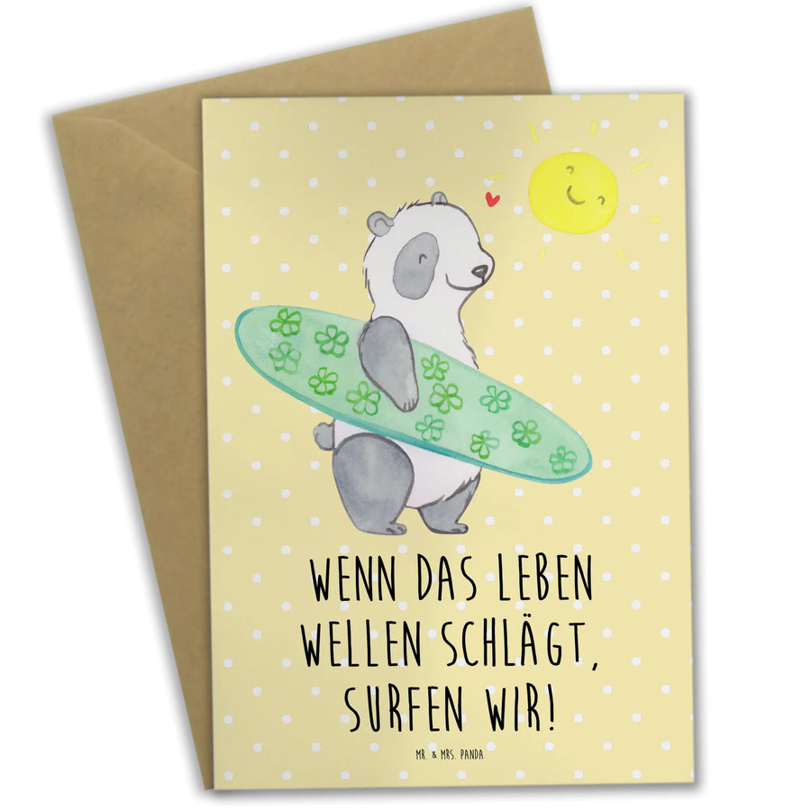 Die wunderschöne Grußkarte von Mr. & Mrs. Panda bringt den Zauber des Sommers direkt zu Dir nach Hause! Mit dem strahlenden Motiv "Sommer, Meer & Strand" aus der exklusiven Kollektion Jahreszeiten schlägst Du gleich mehrere Fliegen mit einer Klappe. Sie ist ideal für viele Anlässe – sei es ein Geburtstag, eine Hochzeit oder einfach nur, um jemandem zu sagen, wie sehr Du ihn schätzt. Die Karte zaubert ein Lächeln auf jedes Gesicht, denn der Slogan "Wenn das Leben Wellen schlägt, surfen wir!" erinnert uns daran, das Leben in vollen Zügen zu genießen.