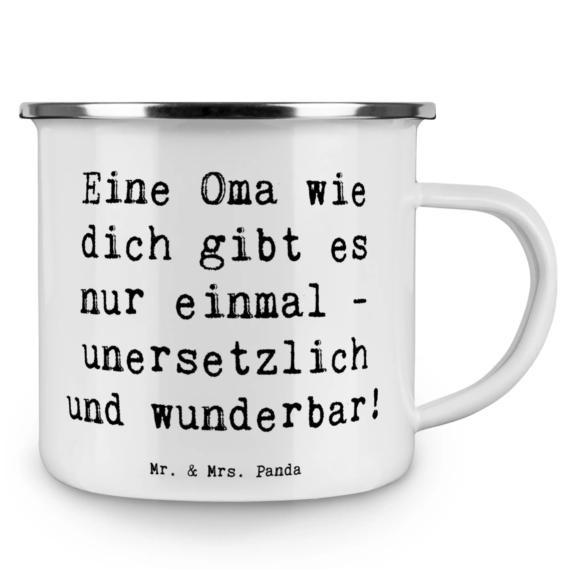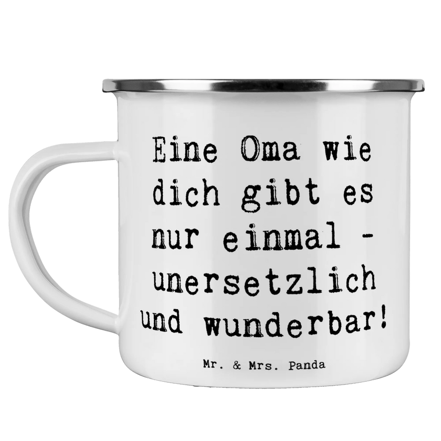 Diese wunderschöne Camping Emaille Tasse von Mr. & Mrs. Panda ist das perfekte Geschenk für all die besonderen Omas da draußen! Sie erinnert uns daran, wie unersetzlich und wunderbar eine Oma ist – schließlich gibt es nur eine wie sie! Egal ob beim Camping, beim Wandern, oder einfach nur beim gemütlichen Beisammensein im Garten, diese Tasse wird zum treuen Begleiter für jede heiße oder kalte Getränkewahl.