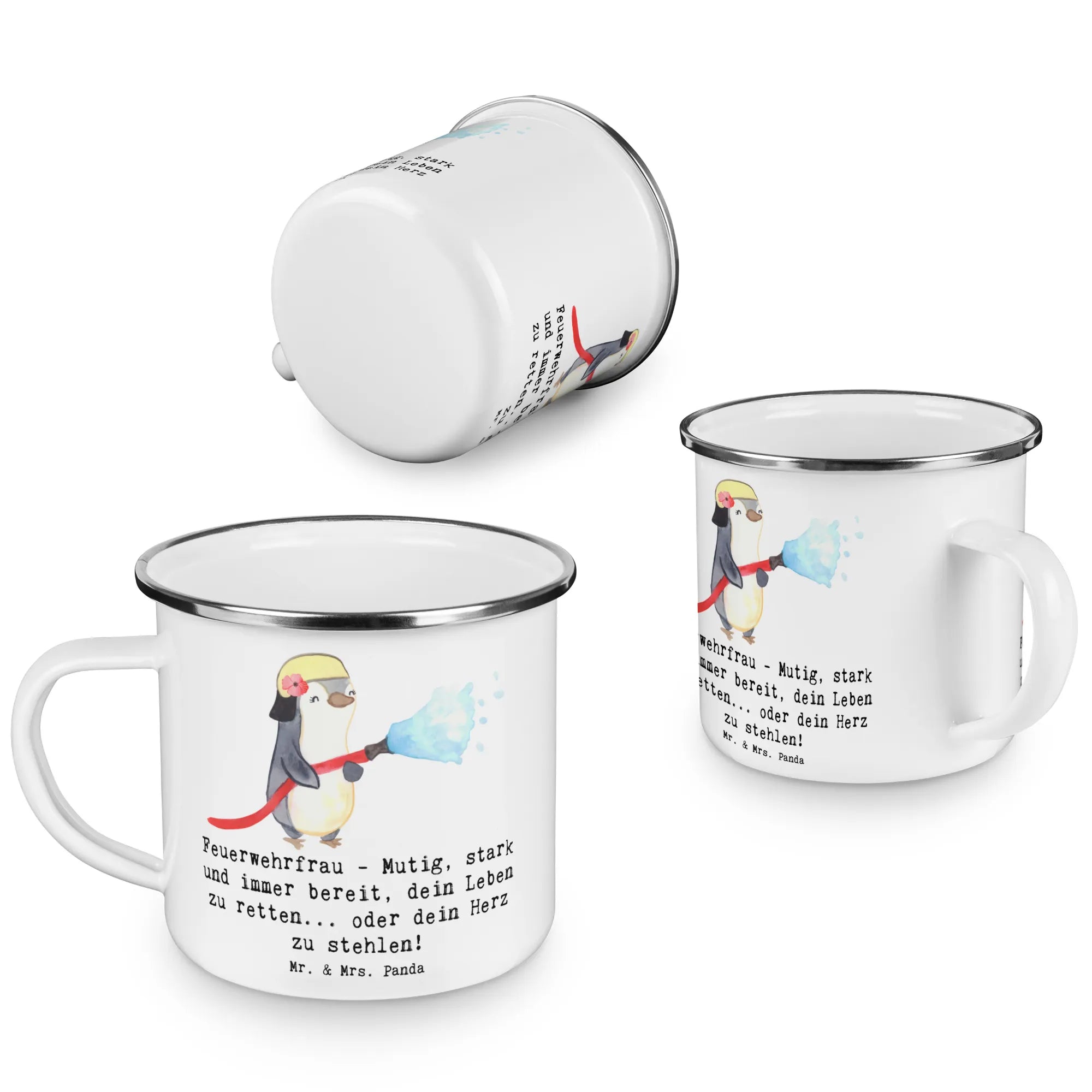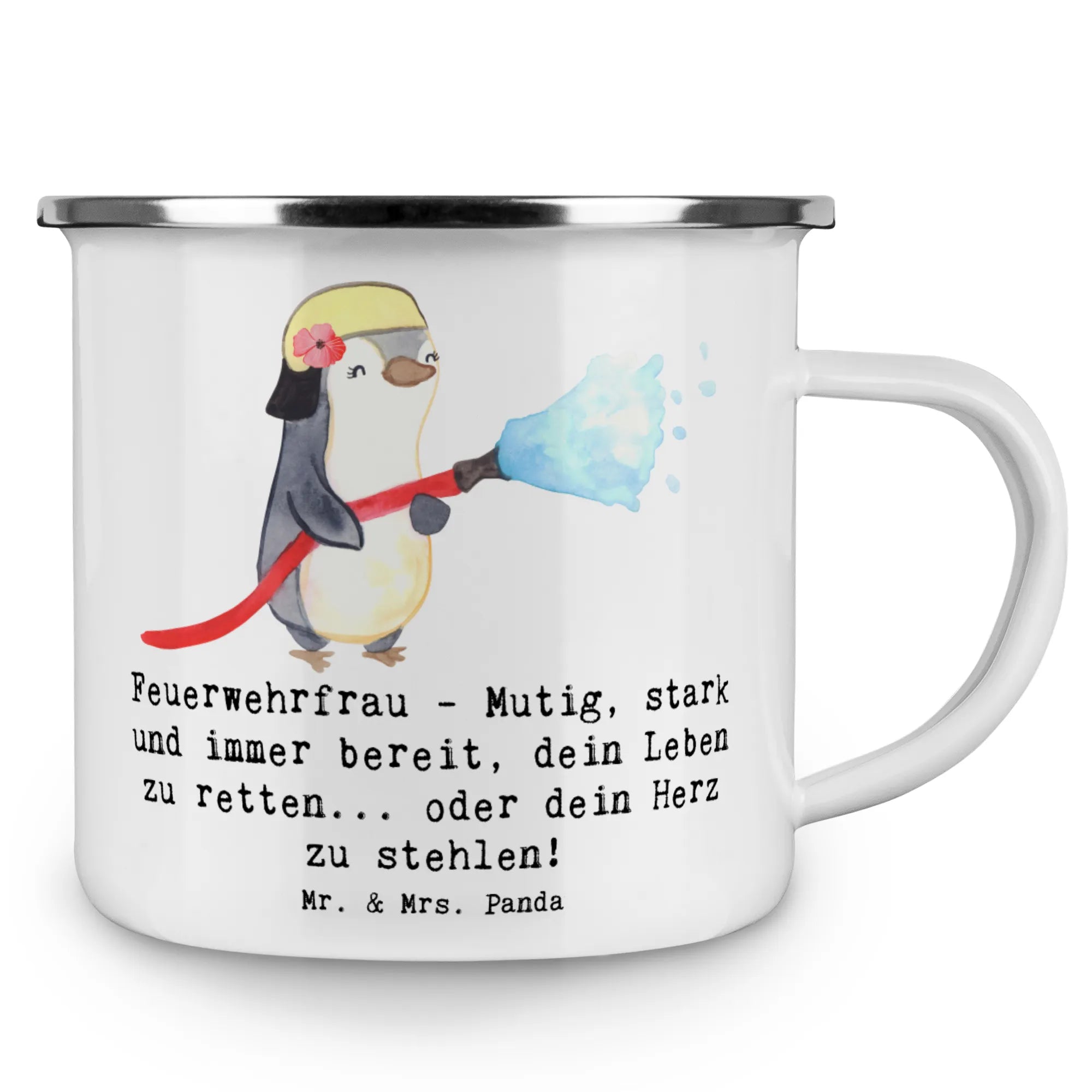 Die wunderschöne Camping Emaille Tasse mit dem Motiv Feuerwehrfrau von Mr. & Mrs. Panda ist der perfekte Begleiter für alle Abenteuerlustigen! Diese Tasse kombiniert stilvolles Design mit höchster Funktionalität, sodass Du Deine heißen und kalten Getränke immer mit einem Lächeln genießen kannst. Mit einem spannenden Slogan "Feuerwehrfrau - Mutig, stark und immer bereit, dein Leben zu retten... oder dein Herz zu stehlen!" spricht sie besonders Feuerwehrfrauen und diese, die sich inspiriert fühlen, an. Egal ob beim Camping, auf der Wandertour oder einfach zu Hause, die Camping Emaille Tasse ist leicht (172 g) und robust, und passt ideal zu jedem Lebensstil.