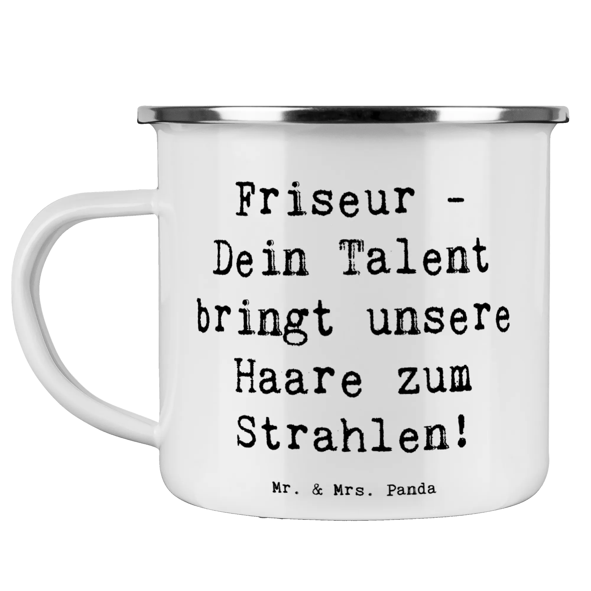 Suchst du nach dem perfekten Geschenk für einen Friseur oder einfach nach einer praktischen Tasse für deine nächsten Campingabenteuer? Dann ist die Camping Emaille Tasse mit dem süßen Motiv 'Friseur - Dein Talent bringt unsere Haare zum Strahlen!' von Mr. & Mrs. Panda genau das Richtige für dich!