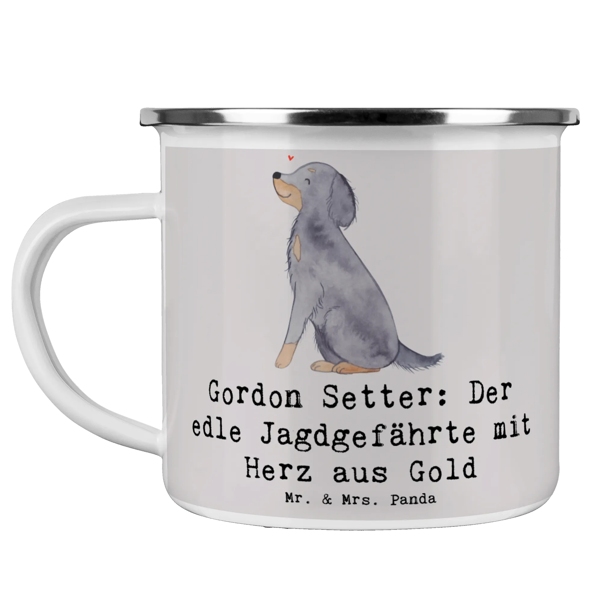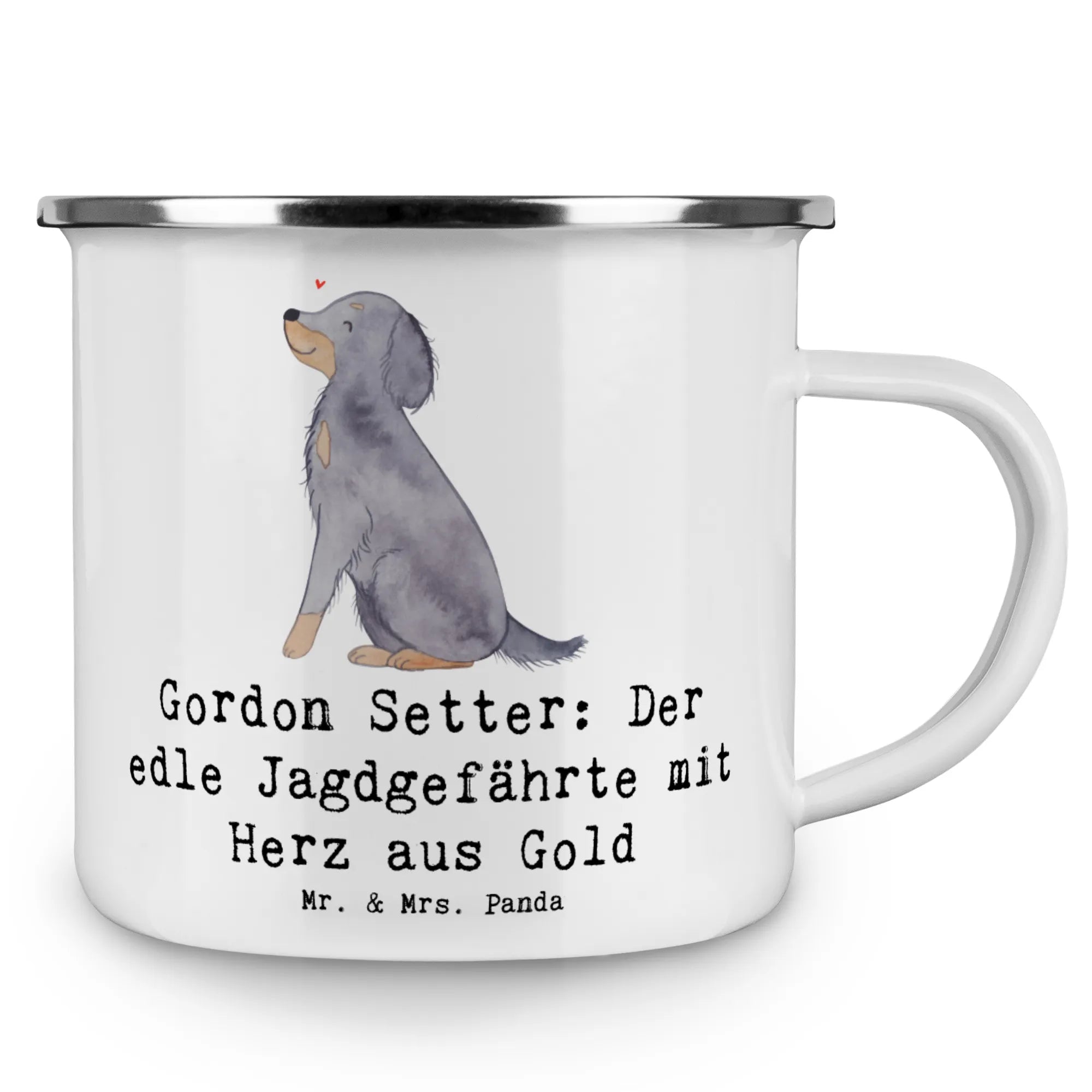Die Camping Emaille Tasse mit dem bezaubernden Motiv 'Gordon Setter: Der edle Jagdgefährte mit Herz aus Gold' von Mr. & Mrs. Panda ist das perfekte Geschenk für Hundefans und Abenteuerliebhaber!