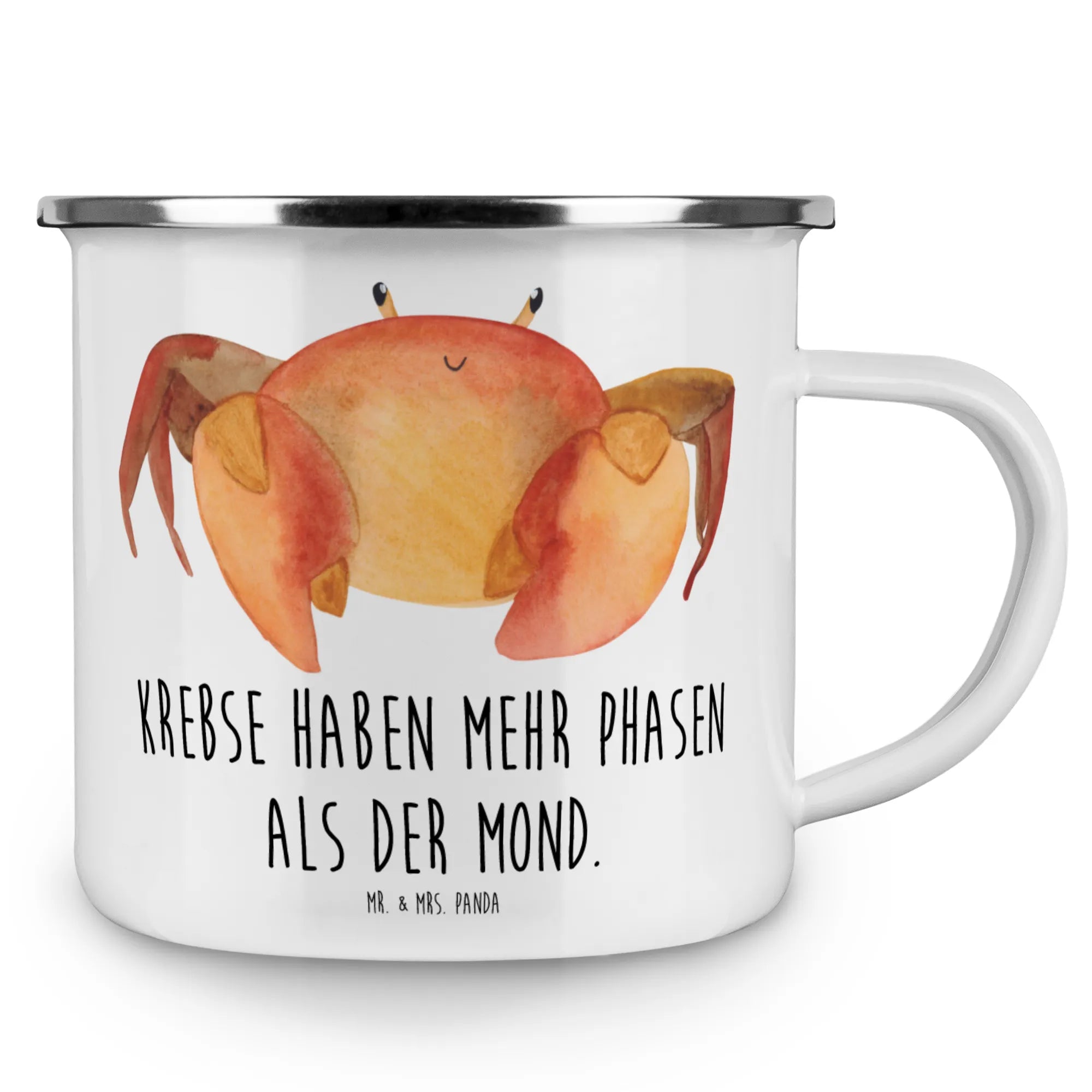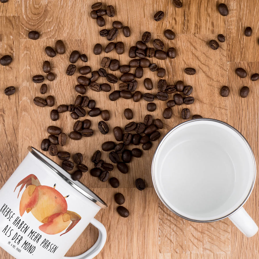Die Camping Emaille Tasse Krebs von Mr. & Mrs. Panda ist das perfekte Geschenk für alle Astrologie-Liebhaber und Camping-Fans! Mit einem witzigen Slogan "Krebse haben mehr Phasen als der Mond" zaubert diese Tasse jedem ein Lächeln ins Gesicht. Egal ob beim gemütlichen Lagerfeuer, auf einer Wanderung oder zu Hause – diese Tasse ist superpraktisch und vielseitig einsetzbar.