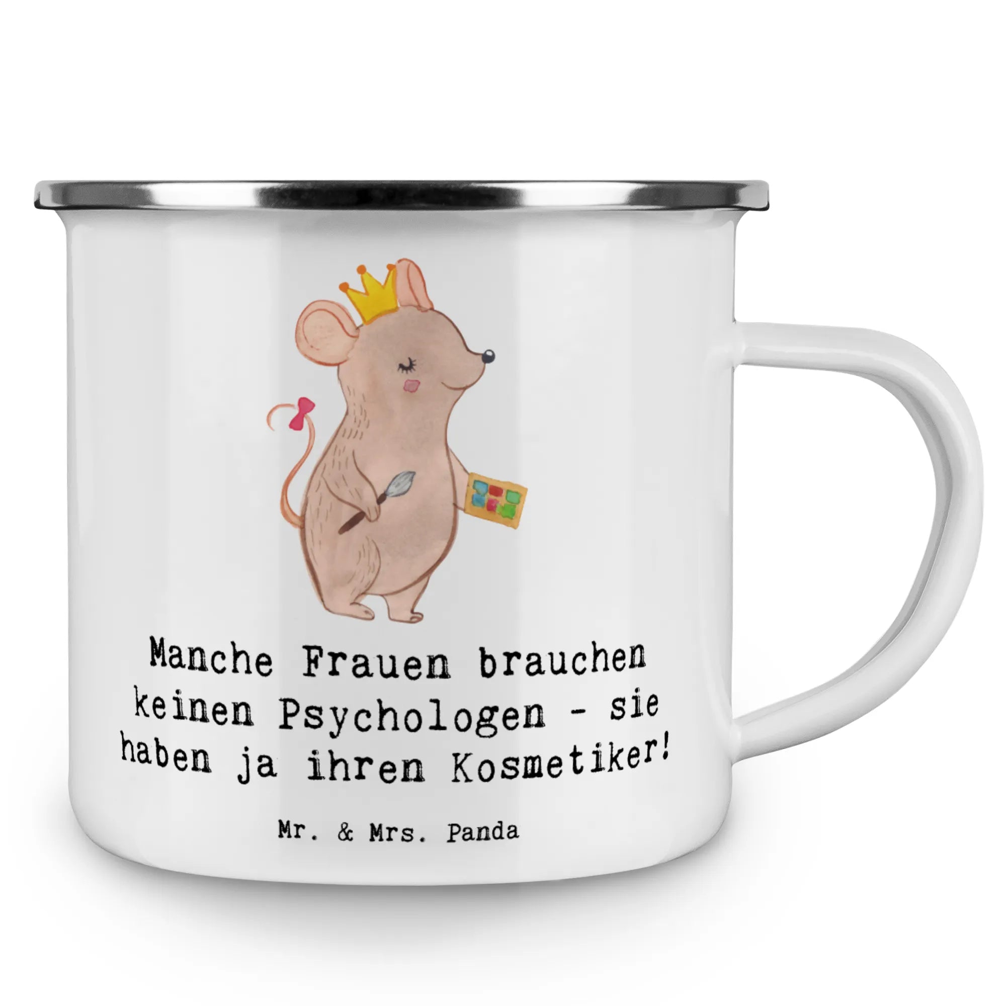 Camping Emaille Tasse Manche Frauen brauchen keinen Psychologen - sie haben ja ihren Kosmetiker! - Weiß