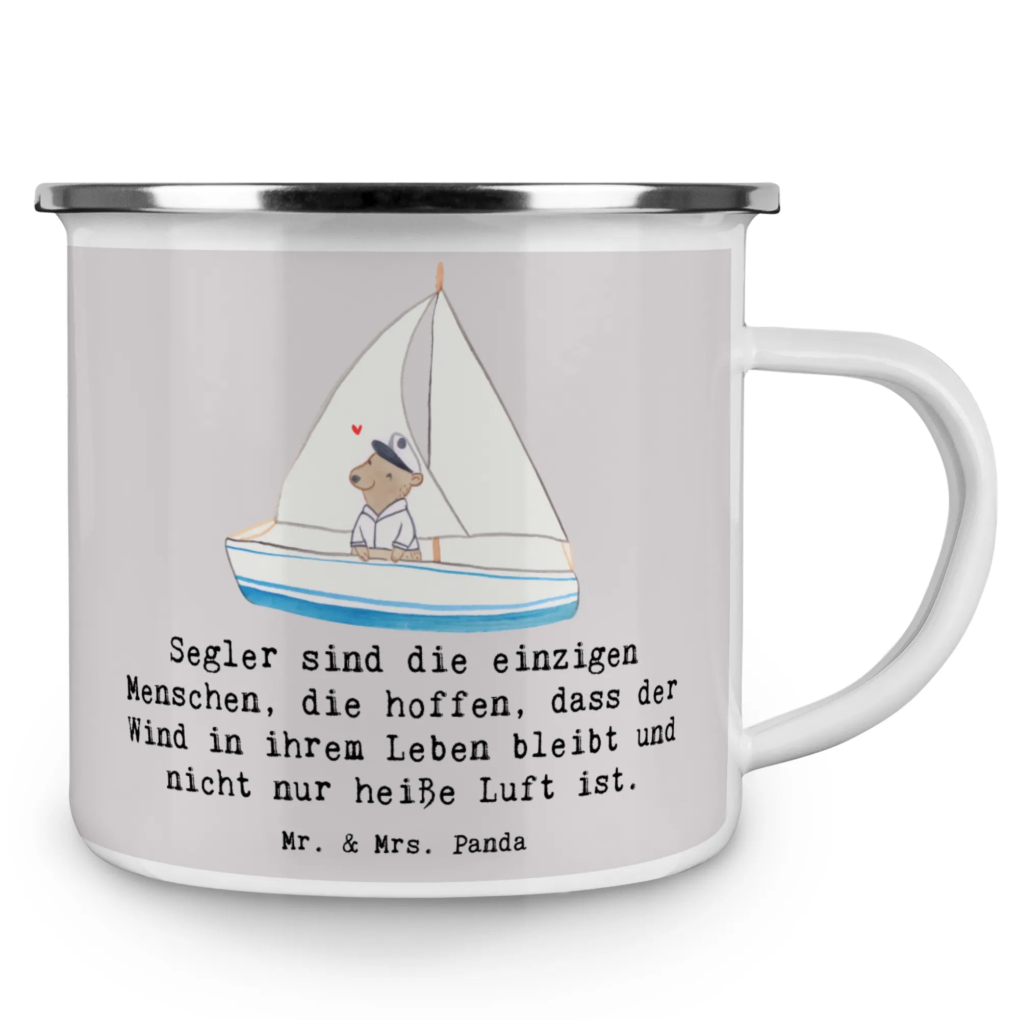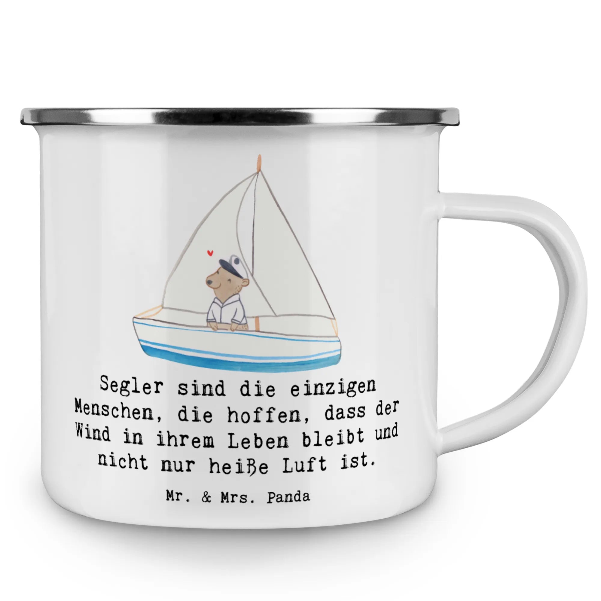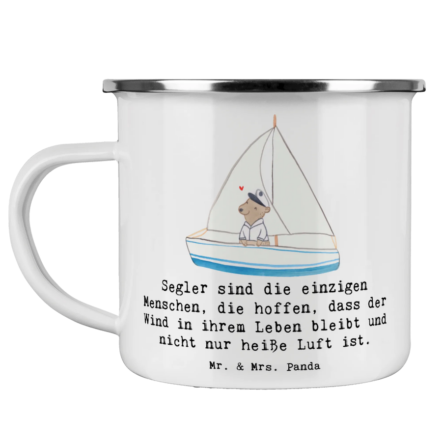 Entdecke die perfekte Camping Emaille Tasse "Segeln" von Mr. & Mrs. Panda! Mit einem liebevoll gestalteten Motiv und dem inspirierenden Slogan "Segler sind die einzigen Menschen, die hoffen, dass der Wind in ihrem Leben bleibt und nicht nur heiße Luft ist." ist diese Tasse der ideale Begleiter für Outdoor-Aktivitäten und für alle Segel-Enthusiasten.
