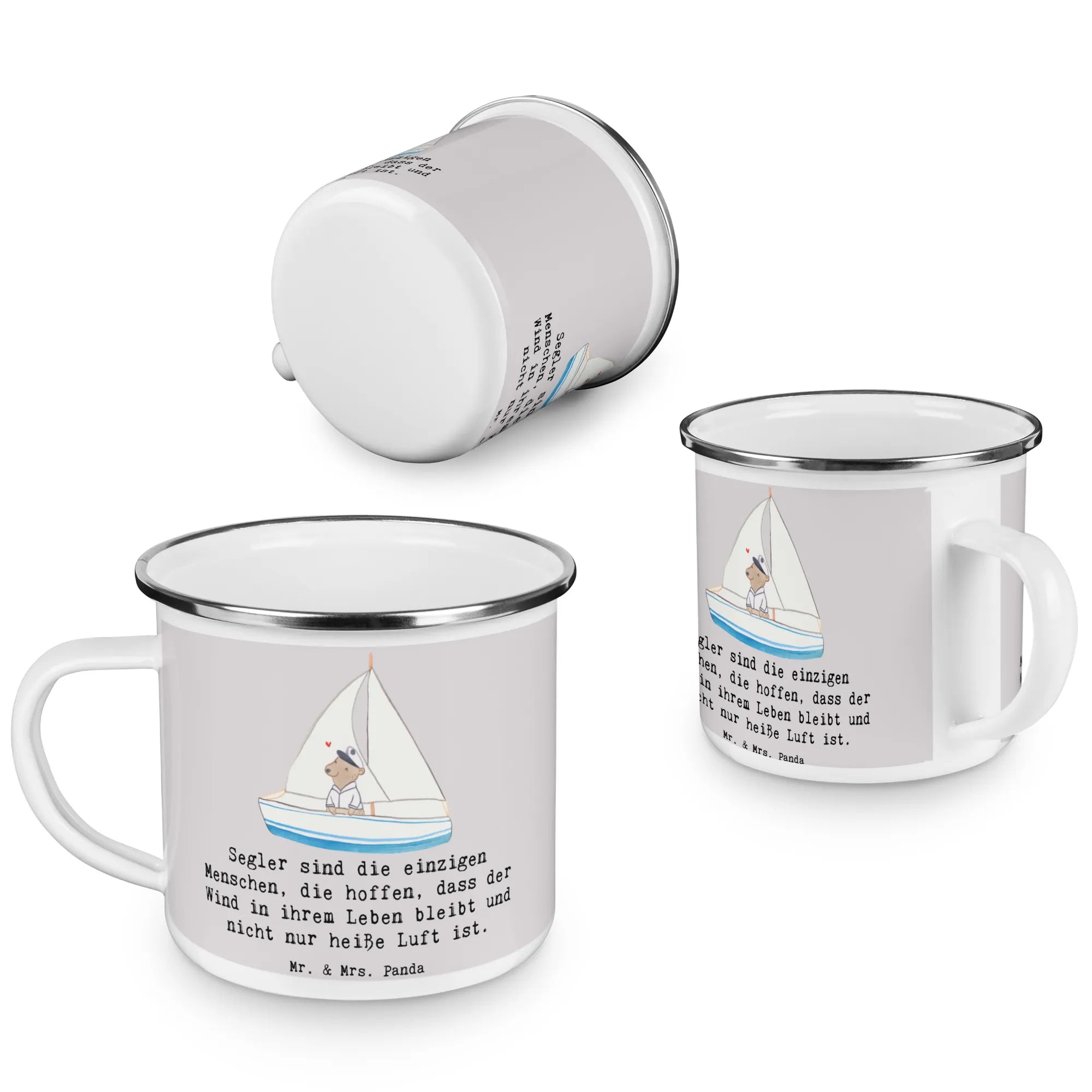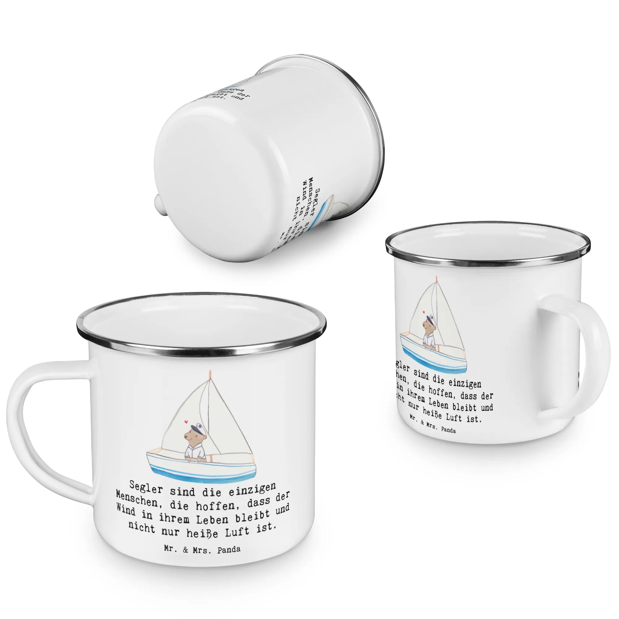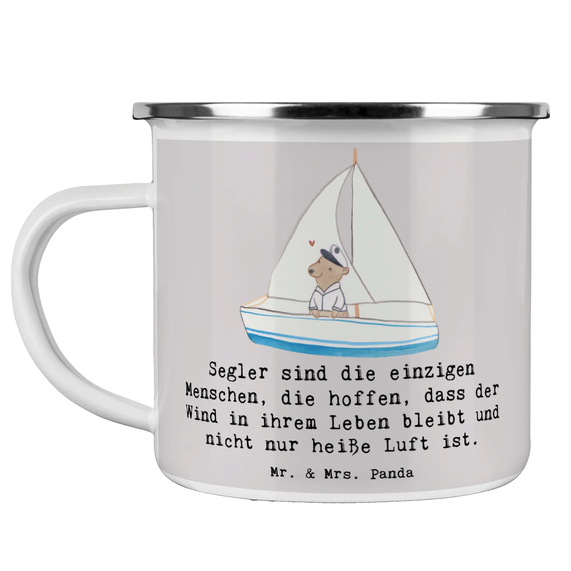 Entdecke die perfekte Camping Emaille Tasse "Segeln" von Mr. & Mrs. Panda! Mit einem liebevoll gestalteten Motiv und dem inspirierenden Slogan "Segler sind die einzigen Menschen, die hoffen, dass der Wind in ihrem Leben bleibt und nicht nur heiße Luft ist." ist diese Tasse der ideale Begleiter für Outdoor-Aktivitäten und für alle Segel-Enthusiasten.